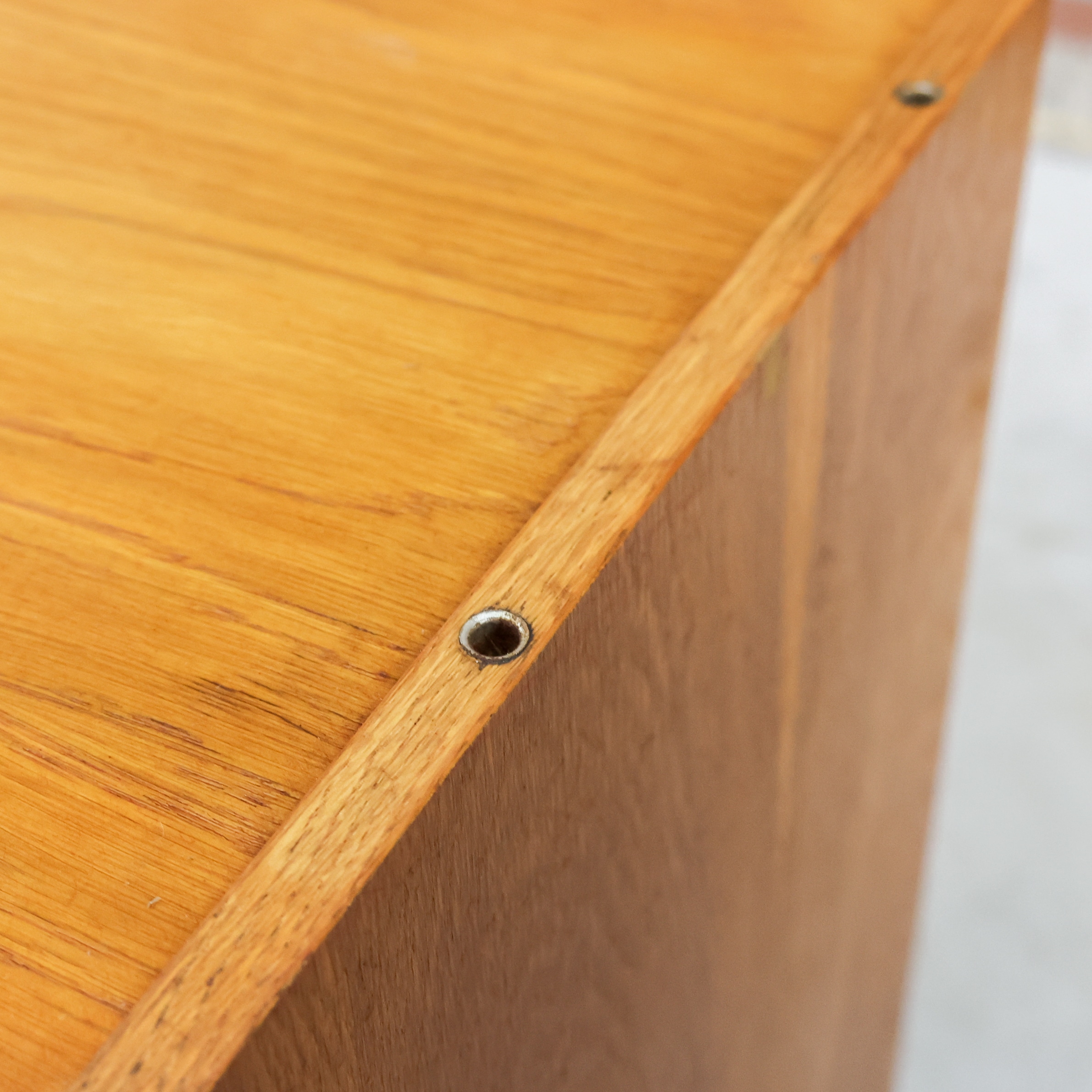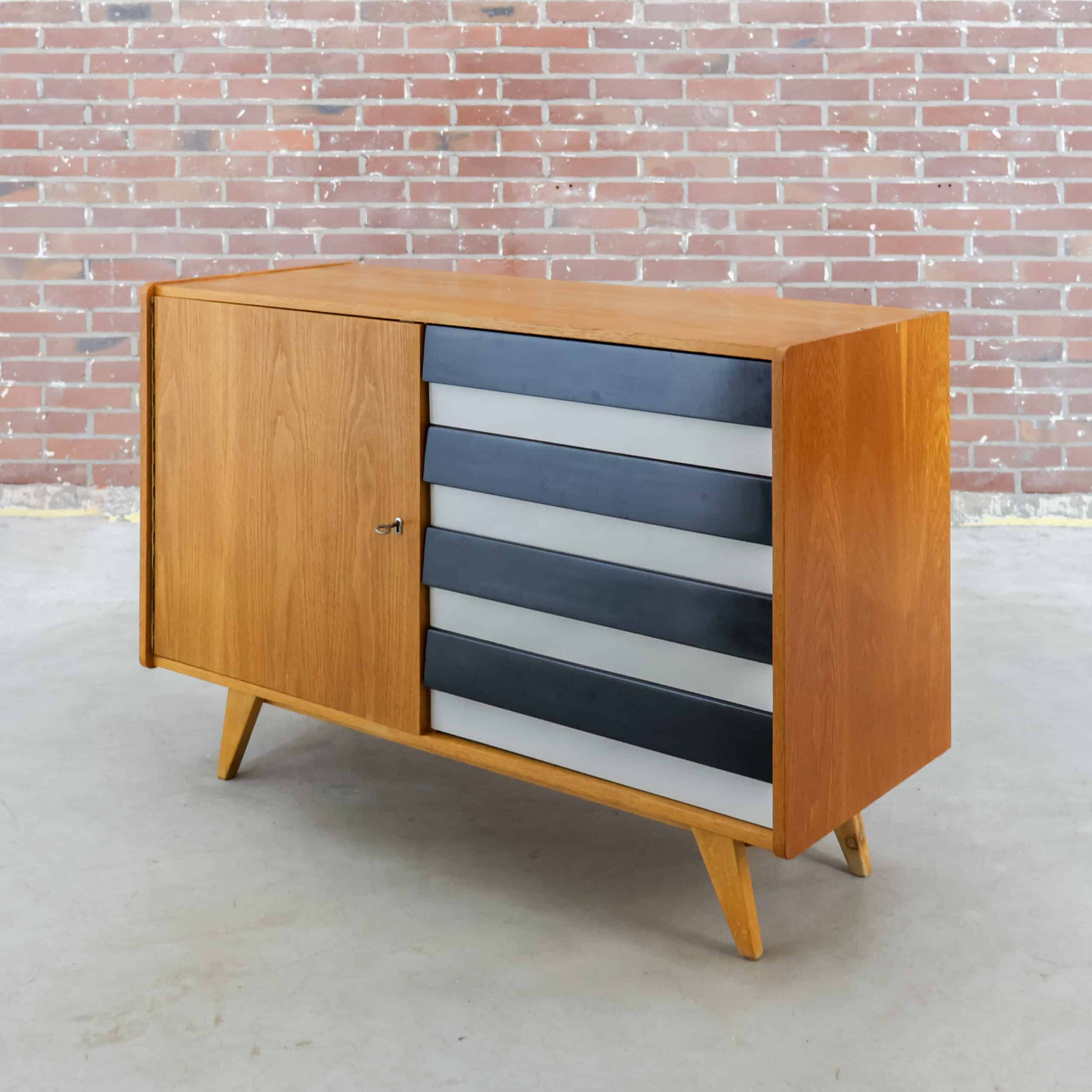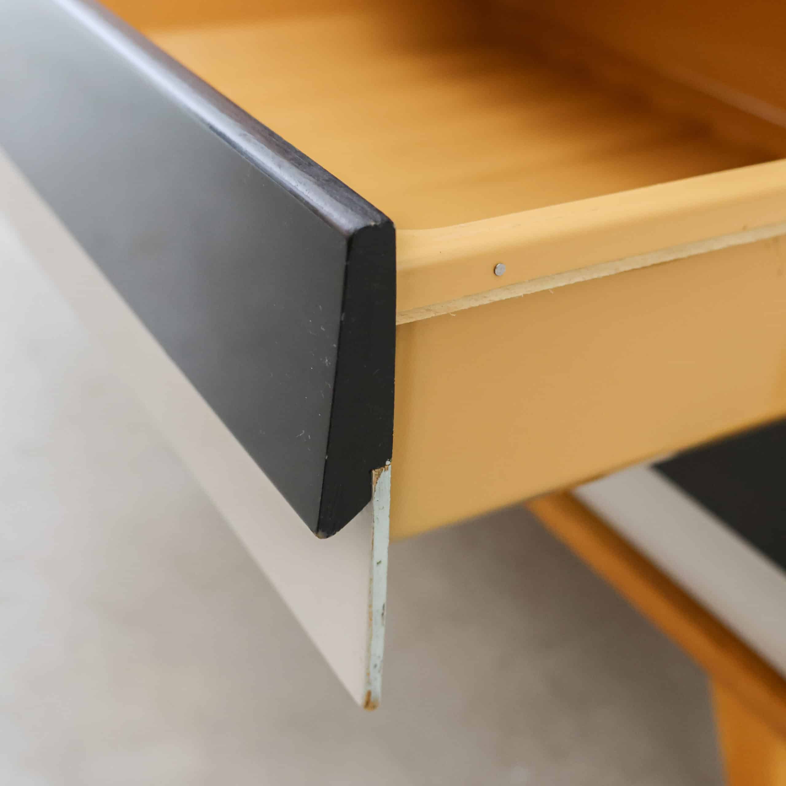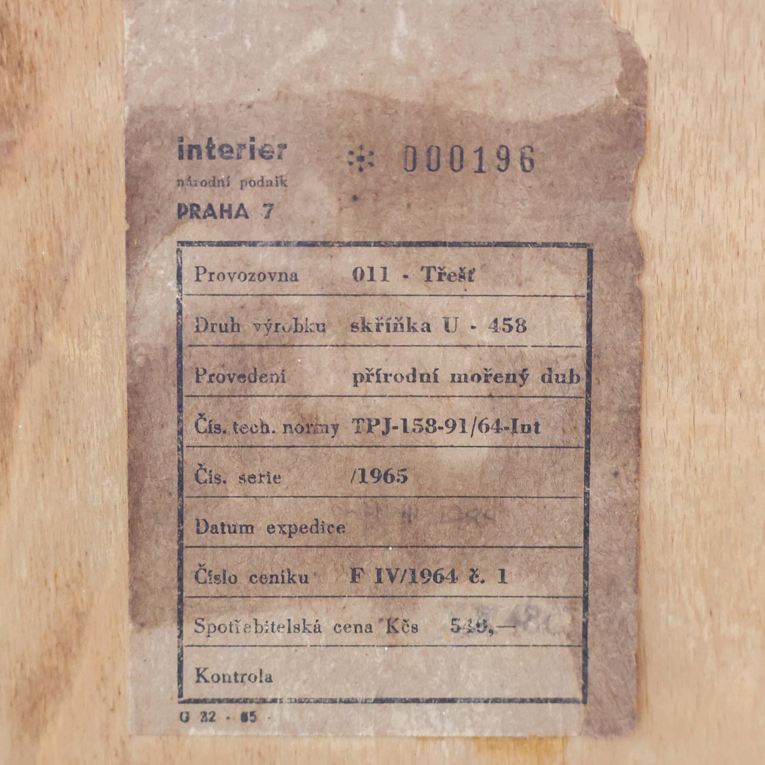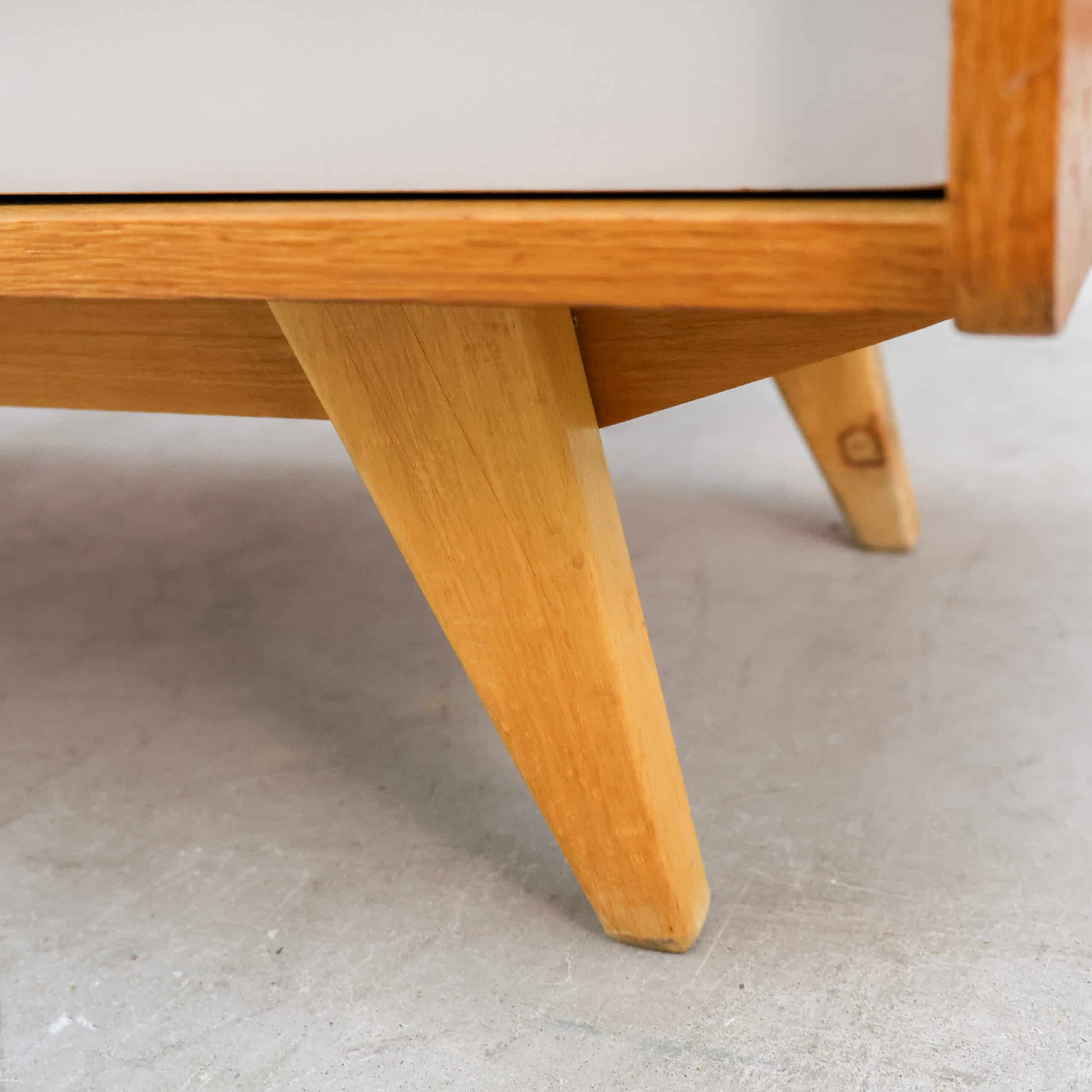 Zeldzame ladekast Interier Praha U-453 uit 1966, ontworpen door František Jirák. Met zijn warme houten corpus, schuine poten en lades in zwart, wit en zachtroze is dit een echt Oost-Europees mid-century icoon. Gemaakt in Třešť (Tsjechoslowakije) en nog voorzien van het originele fabriekslabel. Een speels en tijdloos meubel dat meteen karakter toevoegt aan elk interieur.
