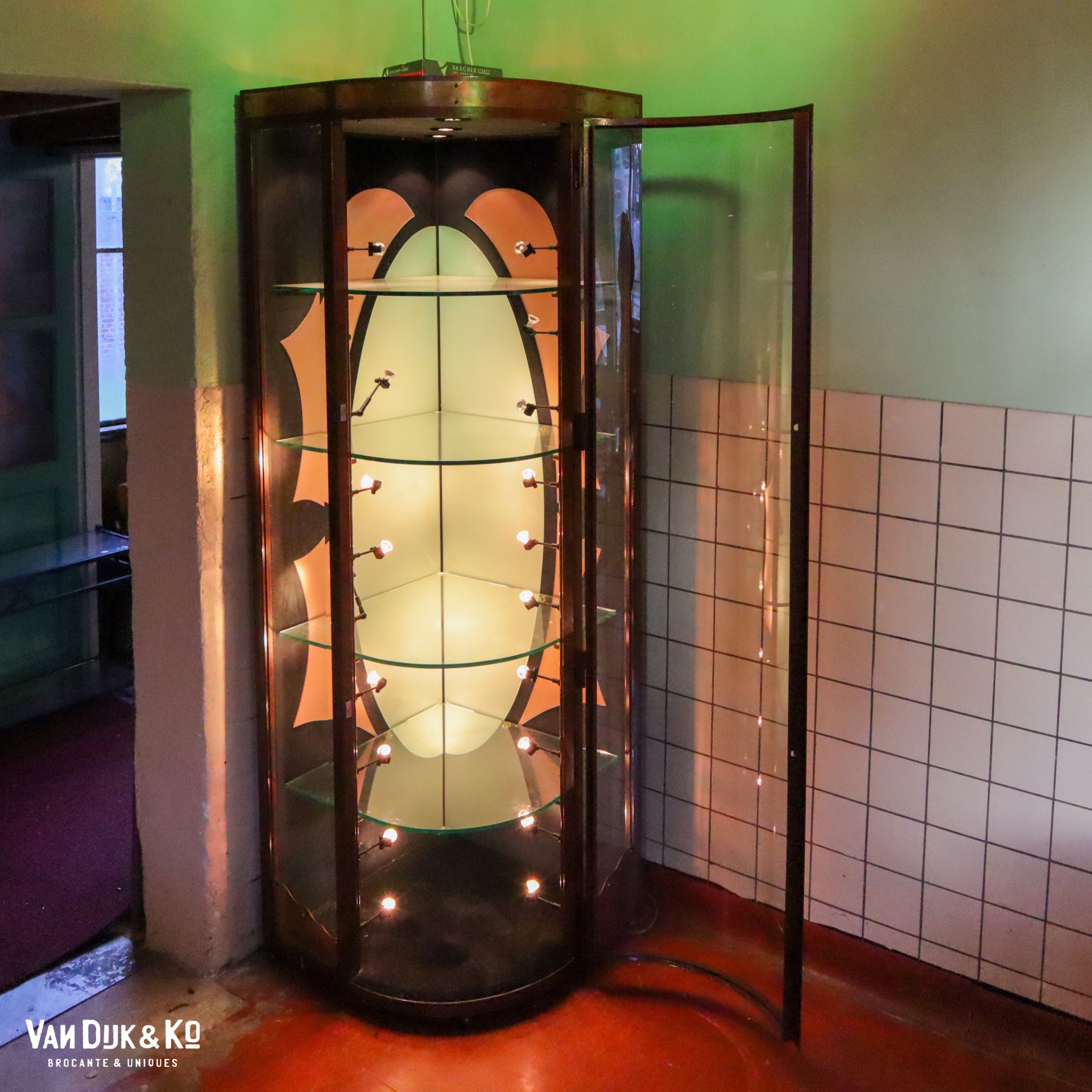 Een uniek exemplaar is hij zeker! Deze hoge vintage vitrinekast heeft een prachtige halfronde vorm en bestaat vooral uit glas. Hij heeft er al heel wat dienstjaren op zitten, wat hem eigenlijk nóg een stukje mooier maakt. Aan de binnenkant naast glazen planken, veel werkende lampen en design details.