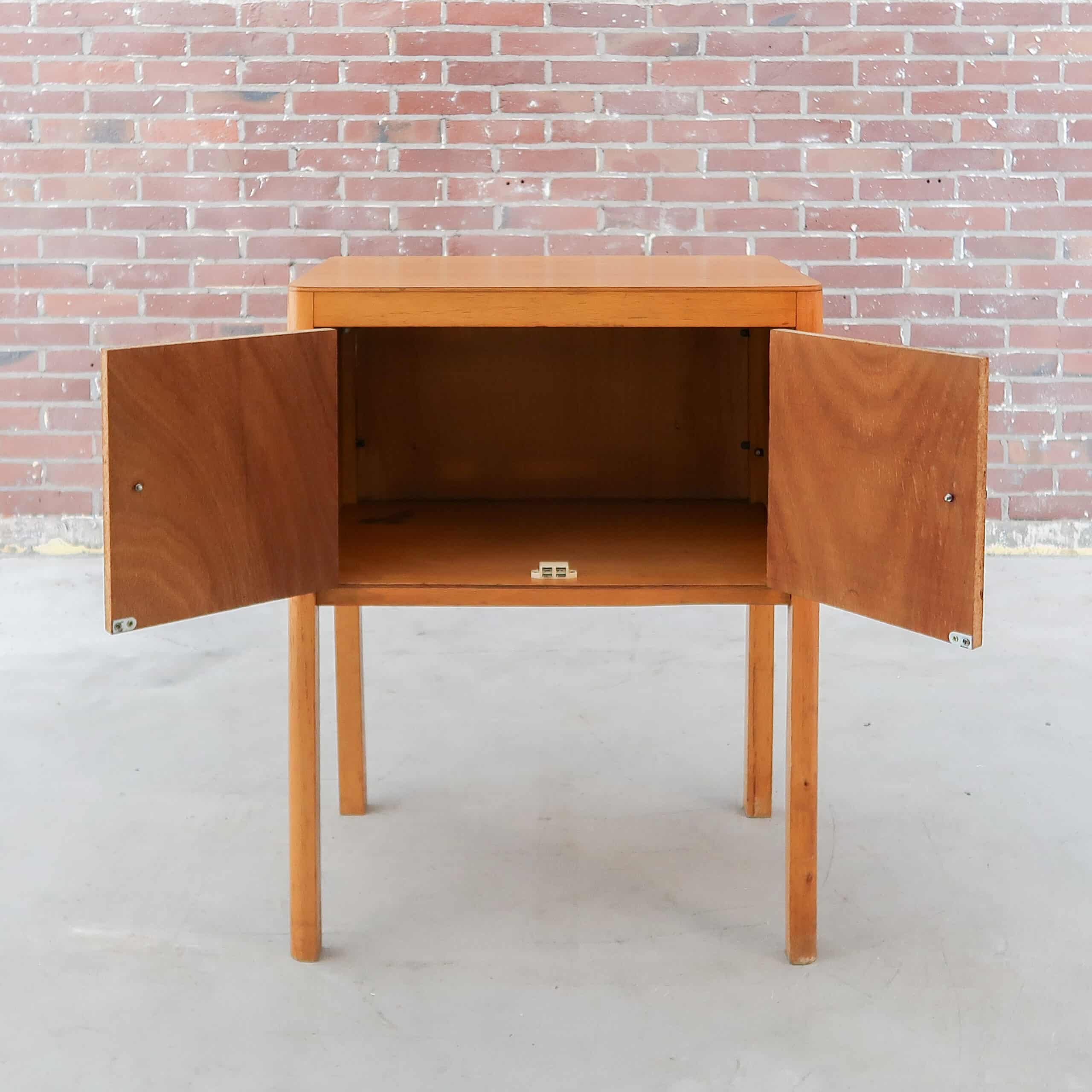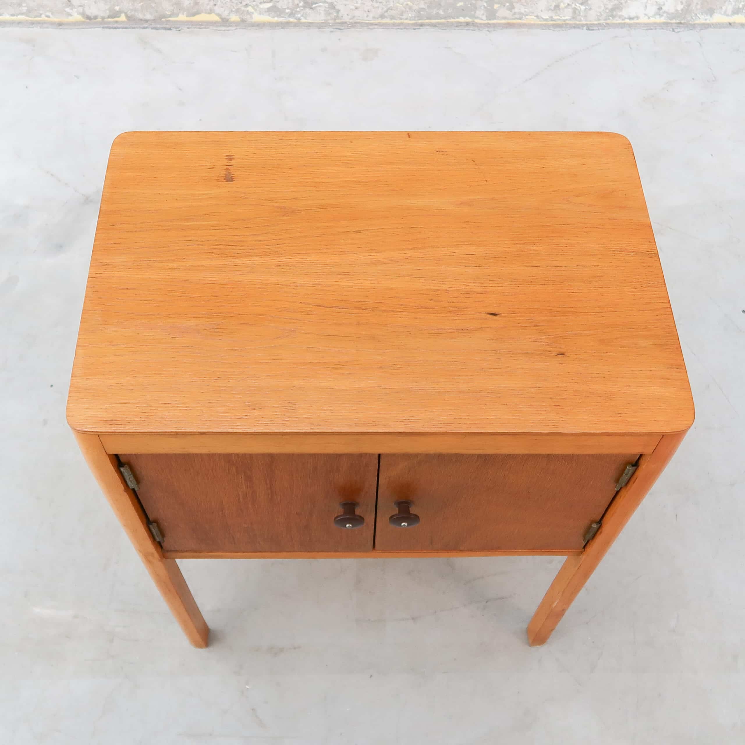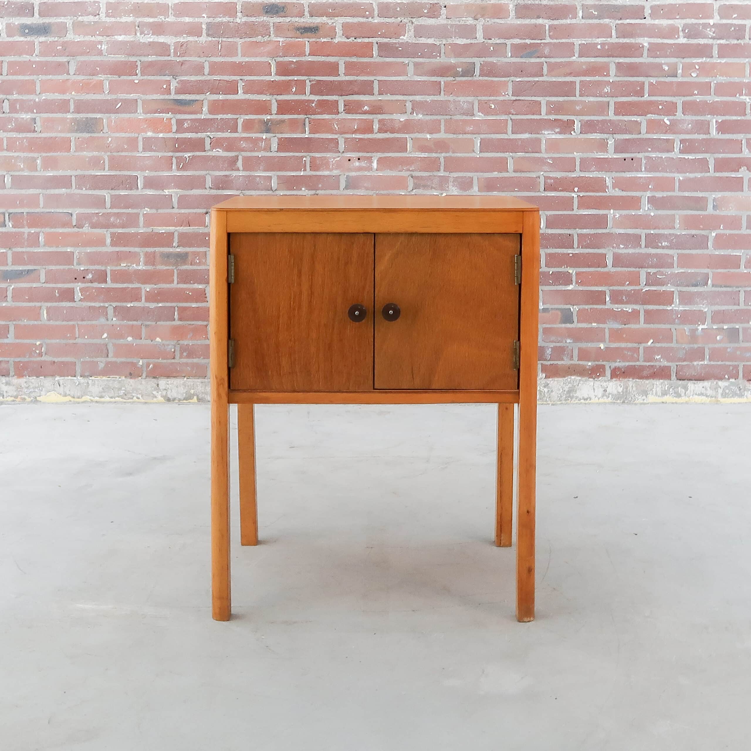Compact vintage kastje uit Tsjechoslowakije, jaren ’50. Strak vormgegeven met twee deurtjes en ronde houten knopjes. Ideaal als nachtkastje, bijzetkast of in de hal. Een authentiek meubel met een subtiele Oostblok-uitstraling.