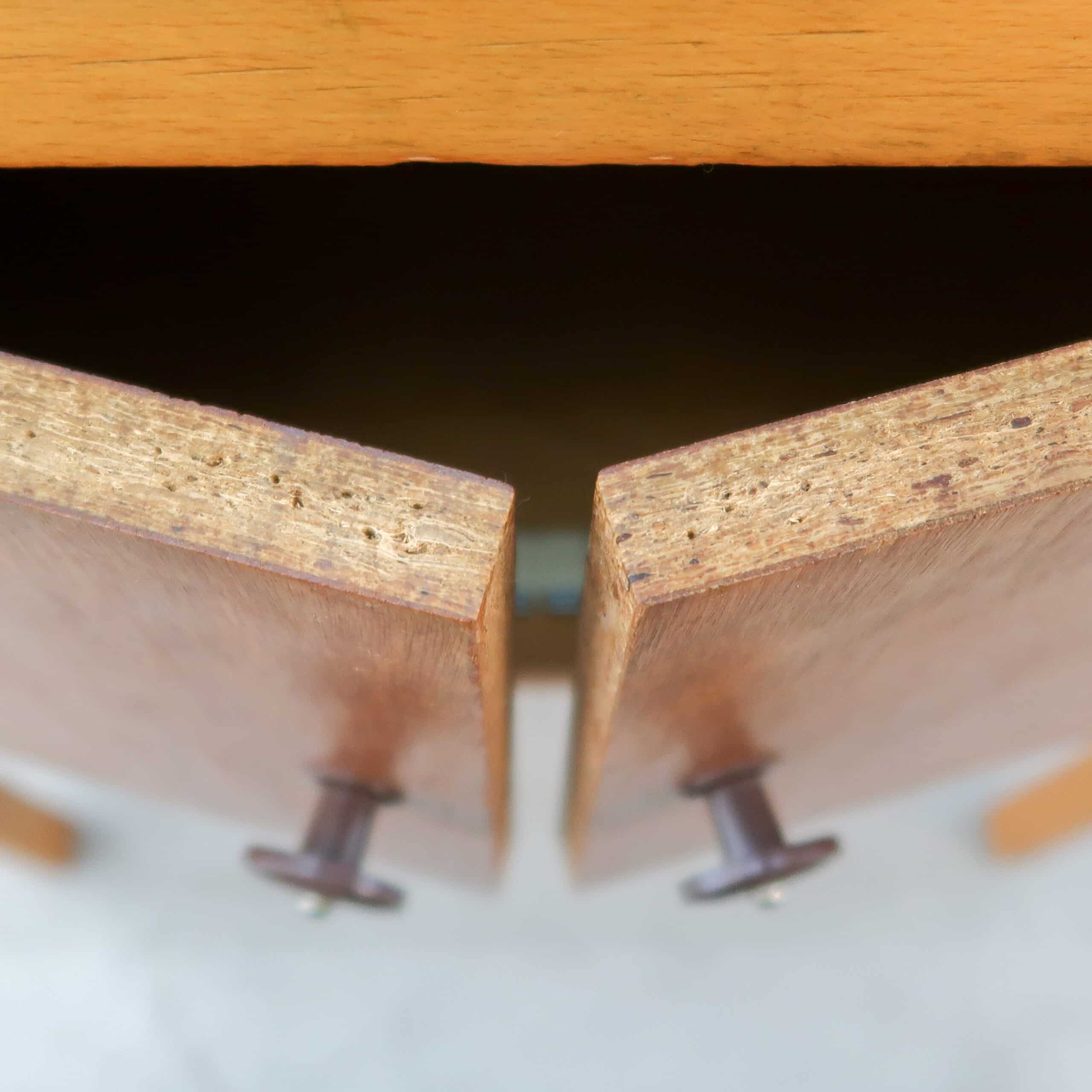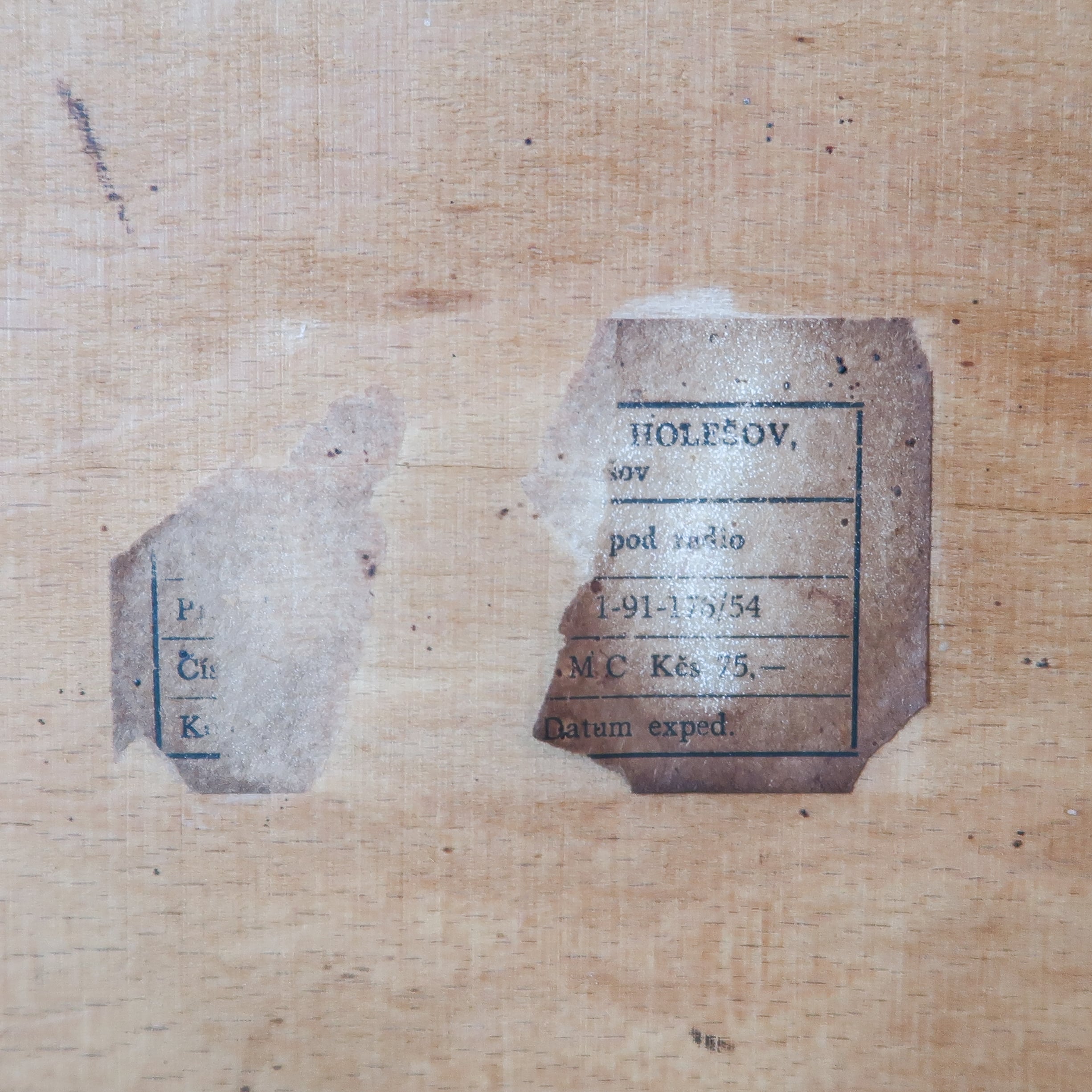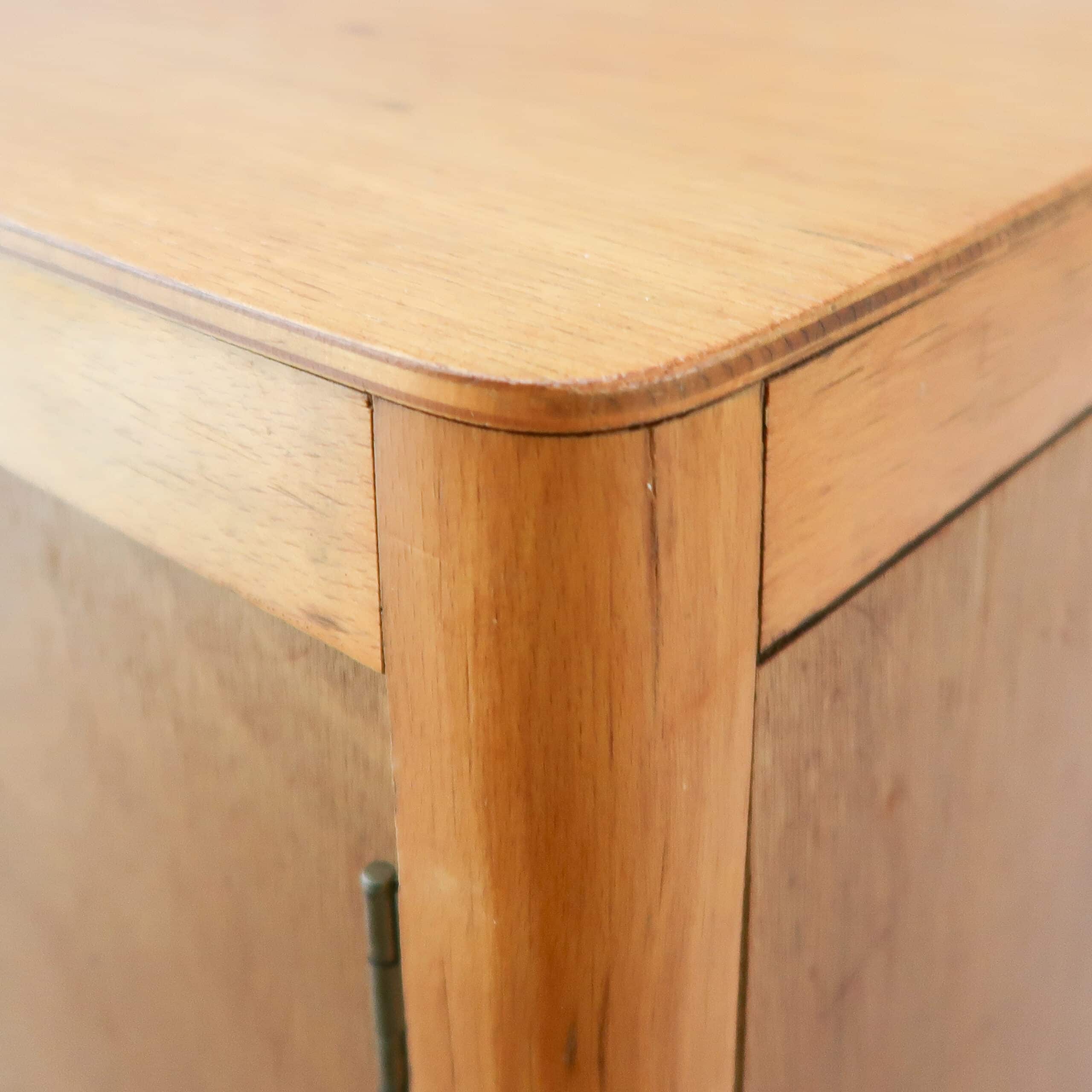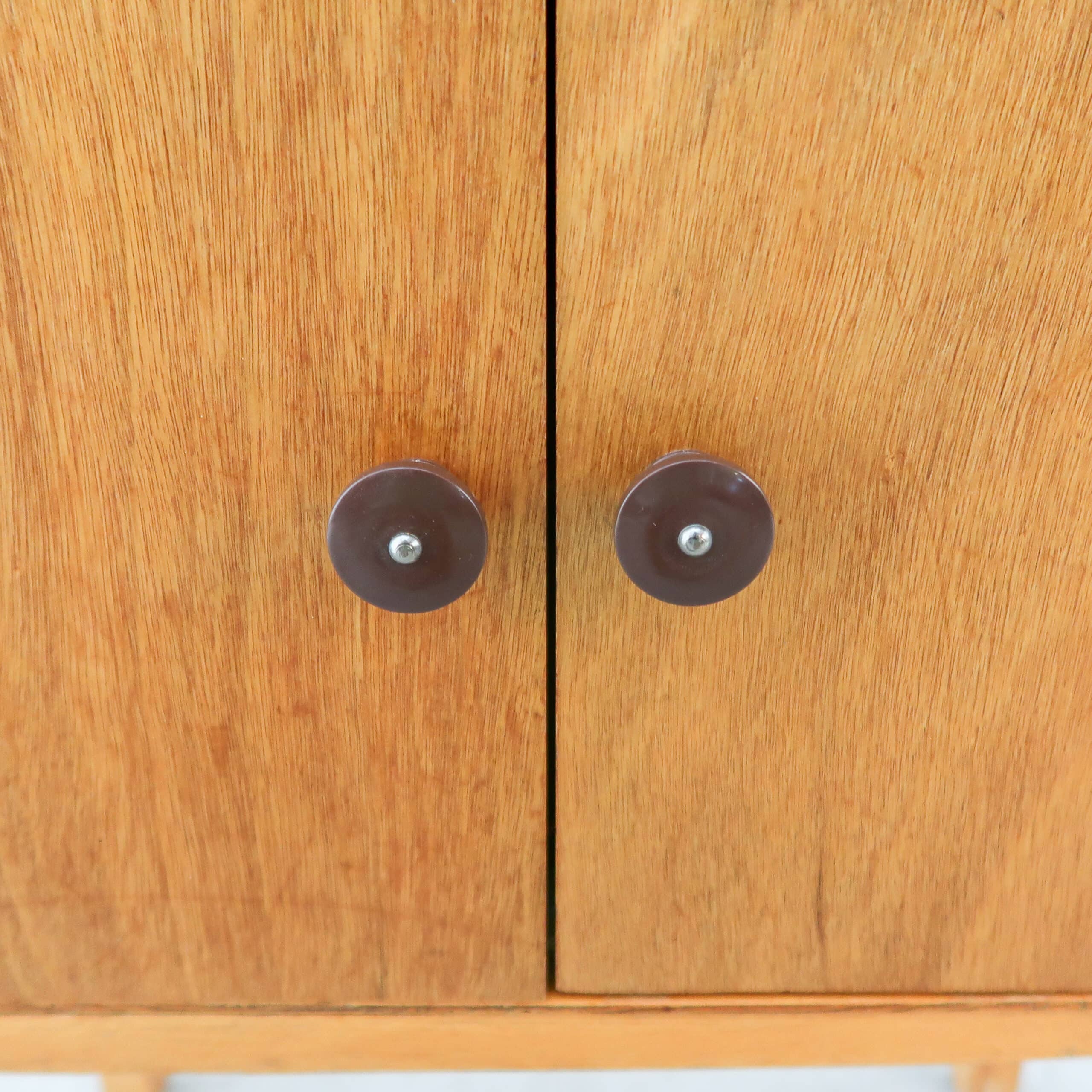 Compact vintage kastje uit Tsjechoslowakije, jaren ’50. Strak vormgegeven met twee deurtjes en ronde houten knopjes. Ideaal als nachtkastje, bijzetkast of in de hal. Een authentiek meubel met een subtiele Oostblok-uitstraling.