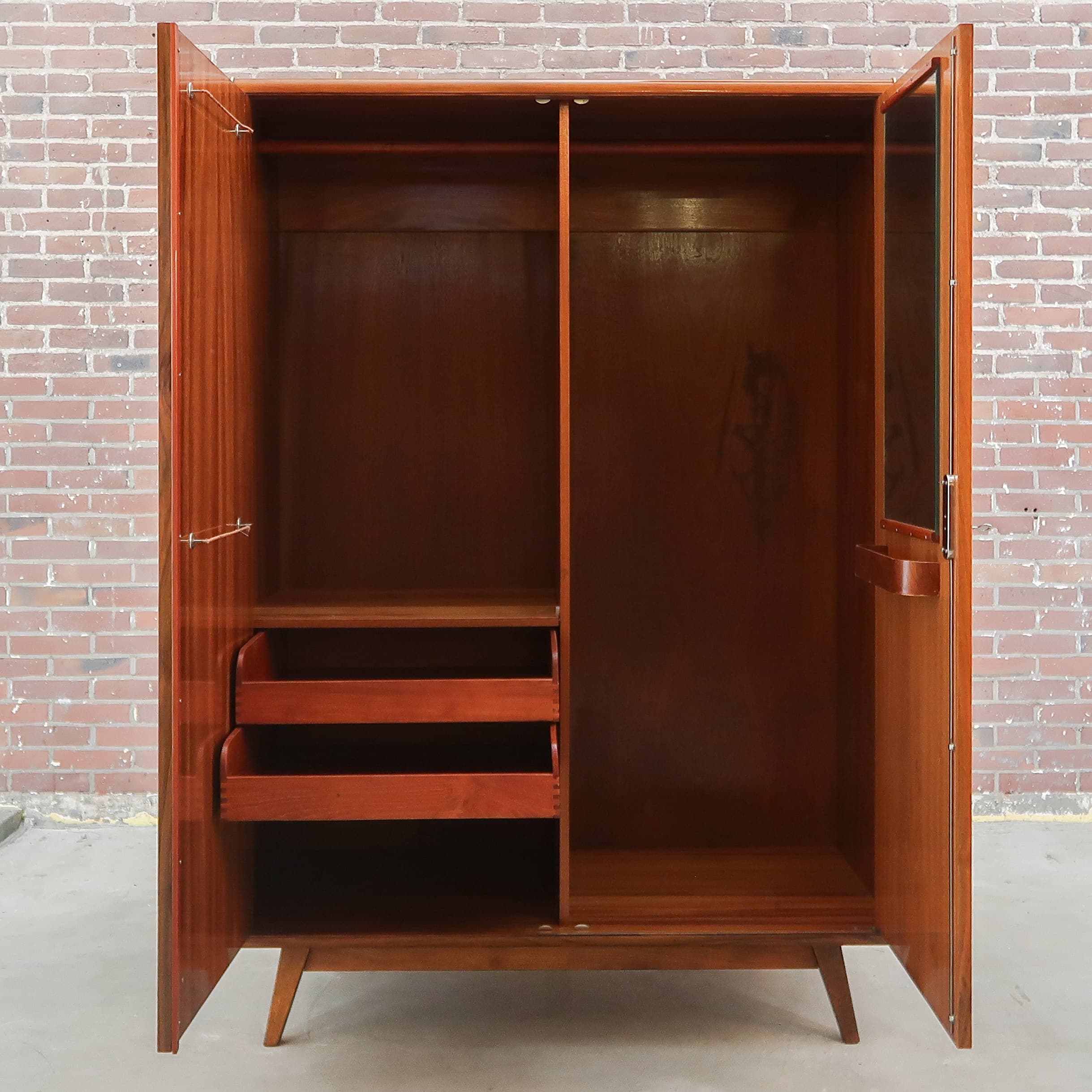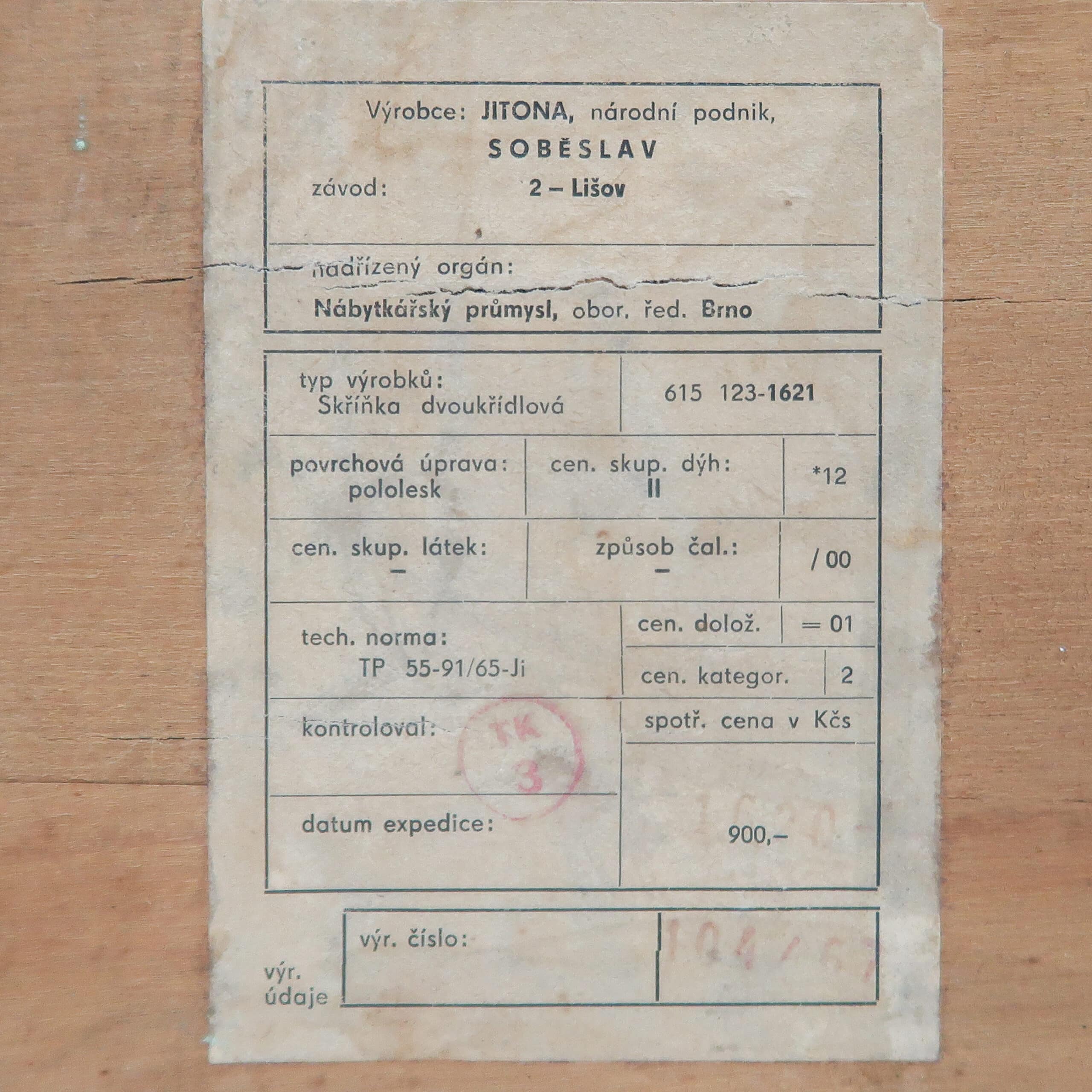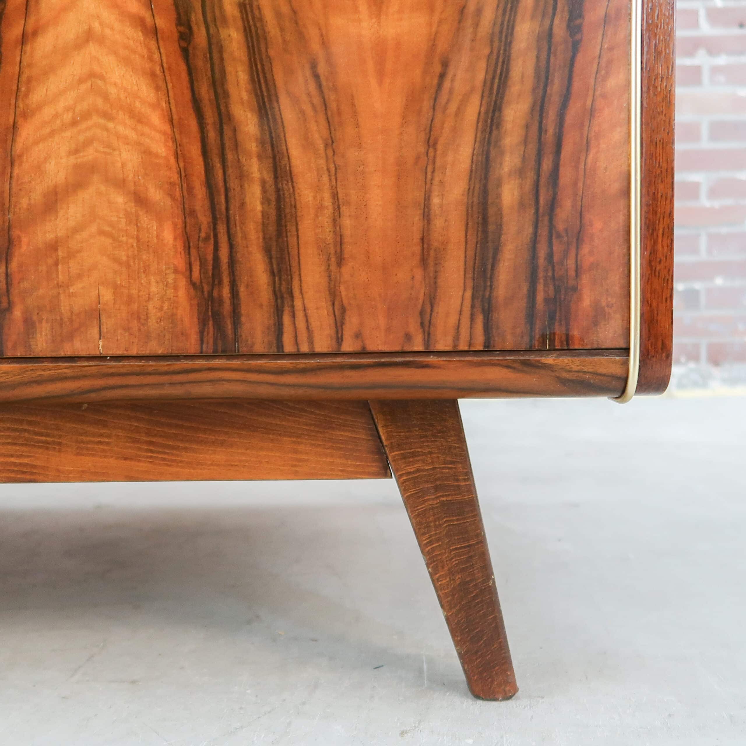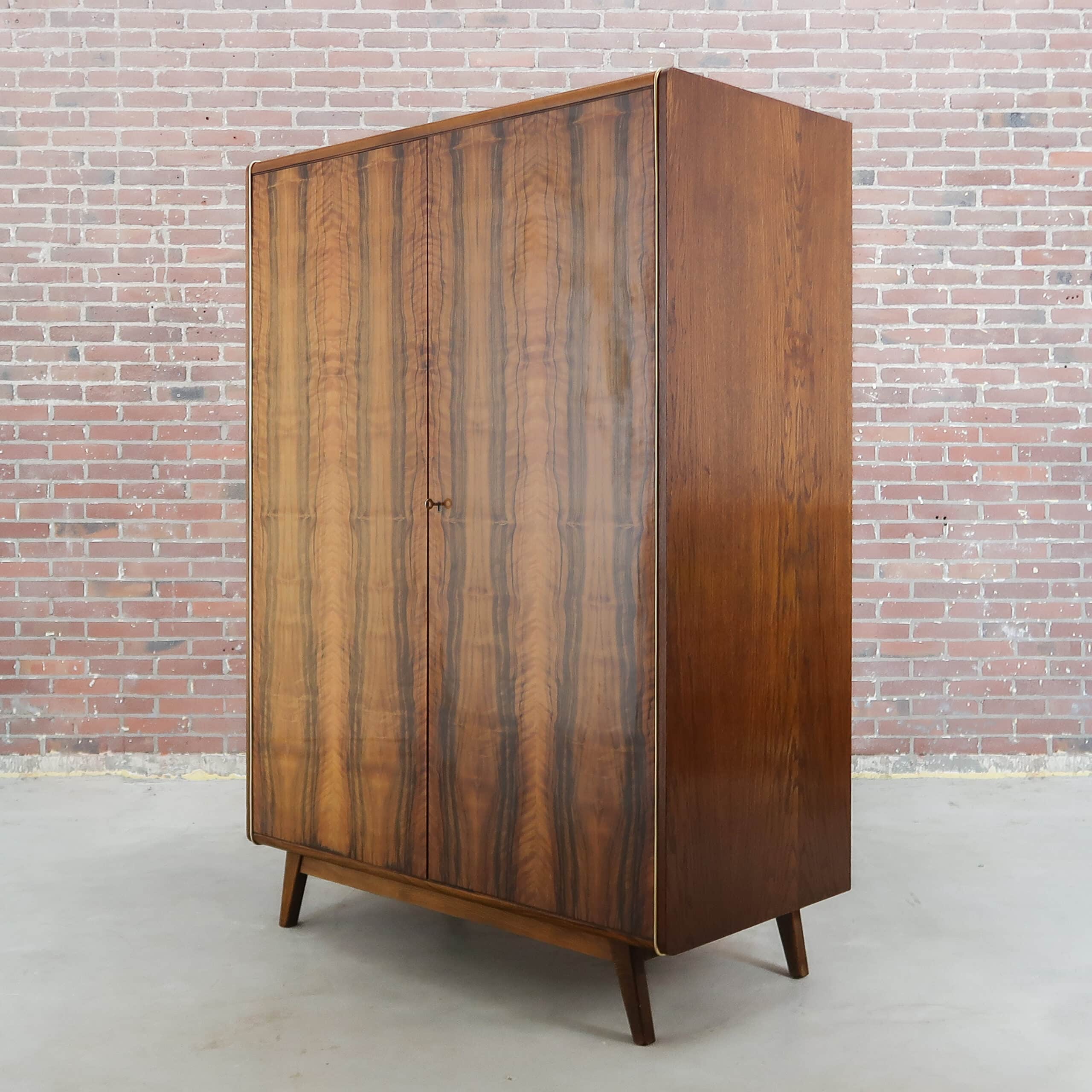 Zeldzame Jitona kledingkast uit de jaren ’60, gemaakt in Soběslav (fabriek Lišov, Tsjechoslowakije). De kast valt op door zijn spectaculaire houttekening met golvende nerf en subtiele messing bies langs de deuren. Binnenin een verfijnde indeling met twee ruime lades, legplanken, een spiegel en originele details. Een luxueus stukje Oost-Europees mid-century design met karakter en klasse.