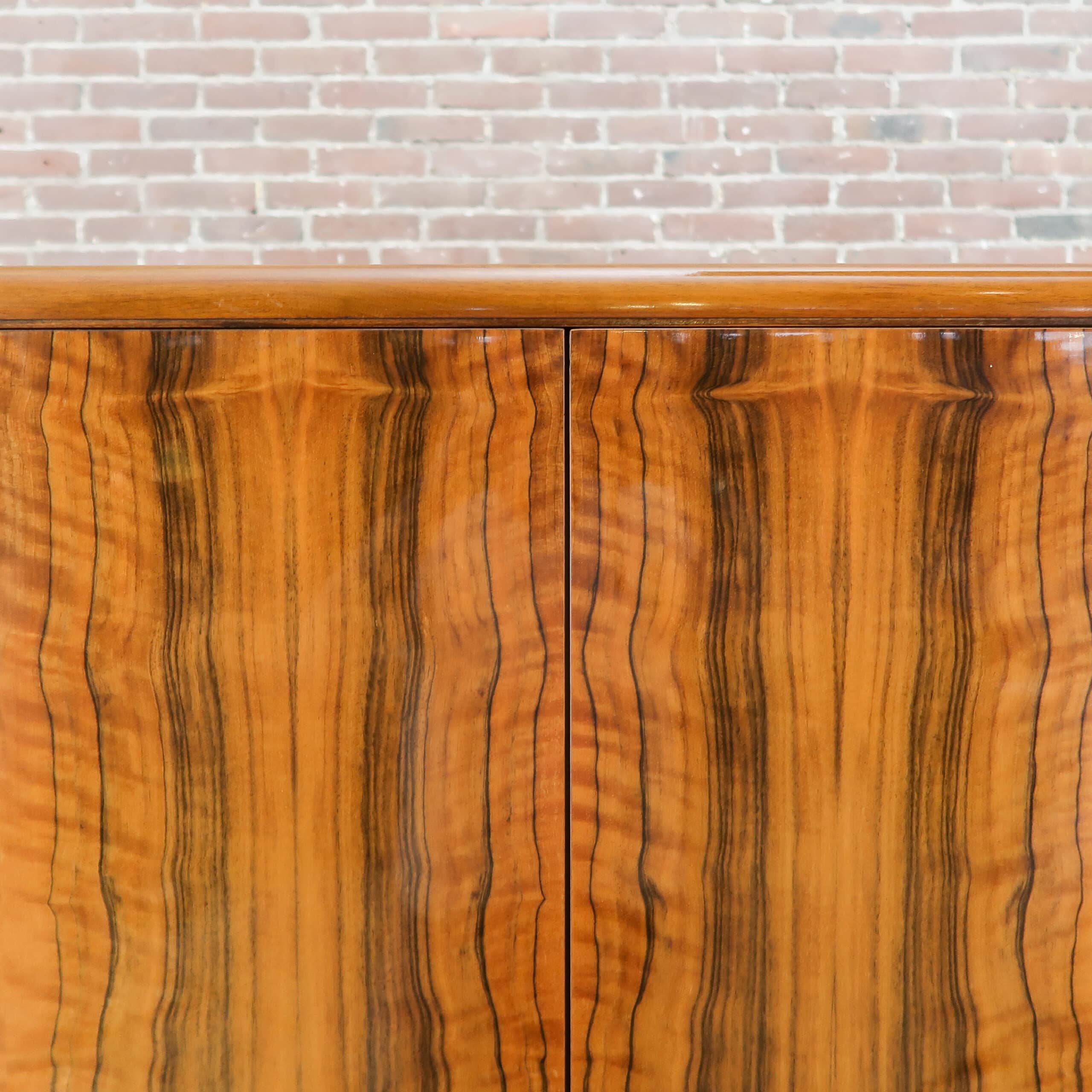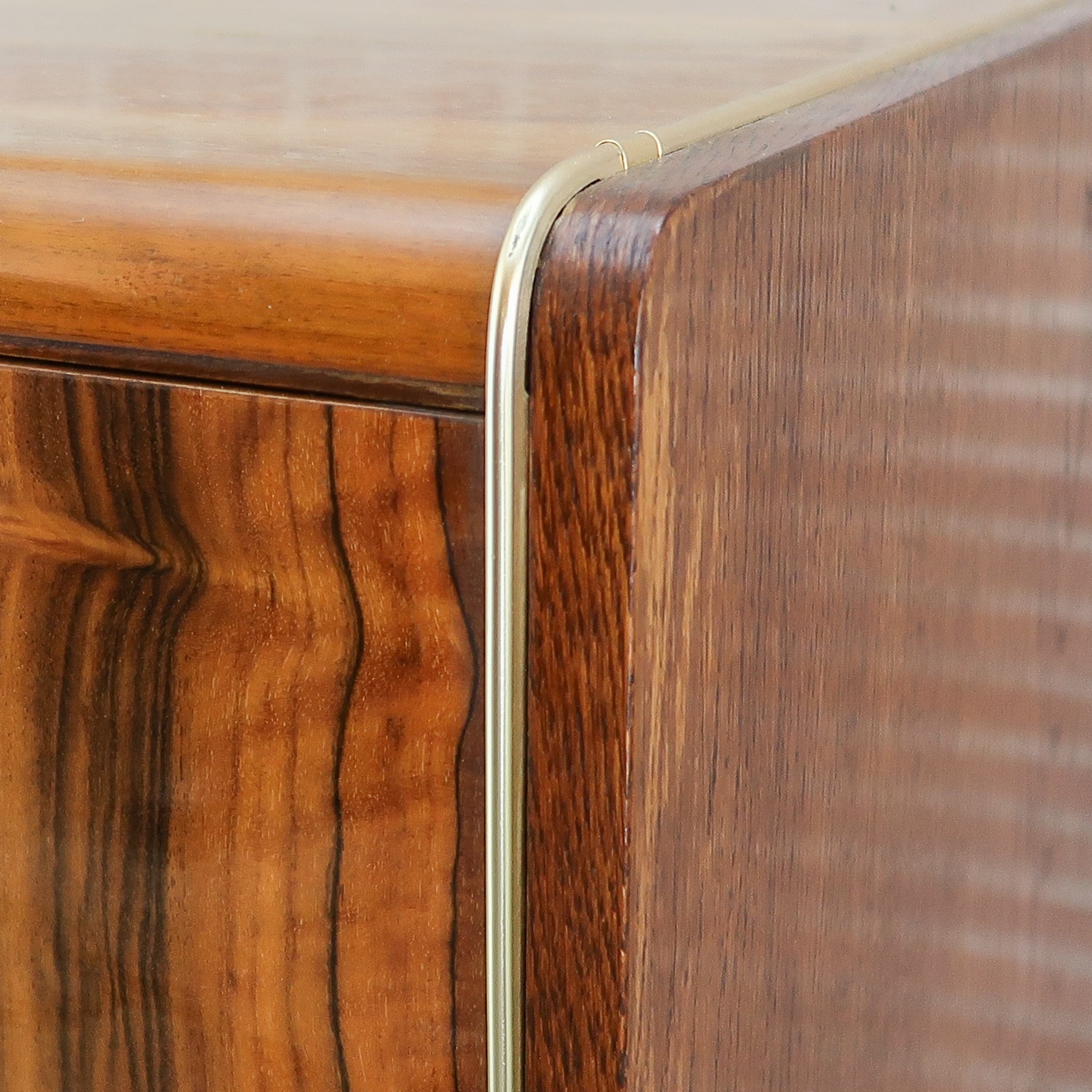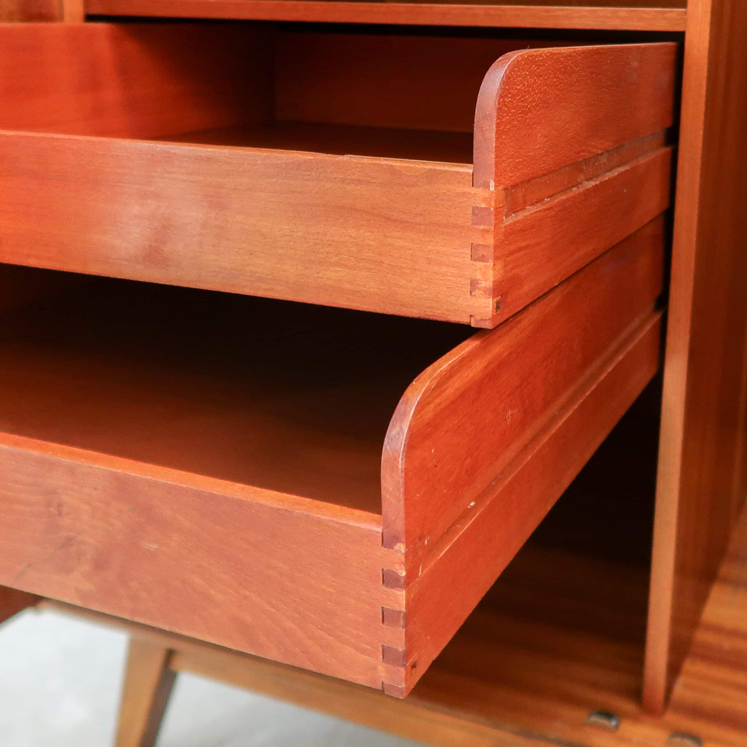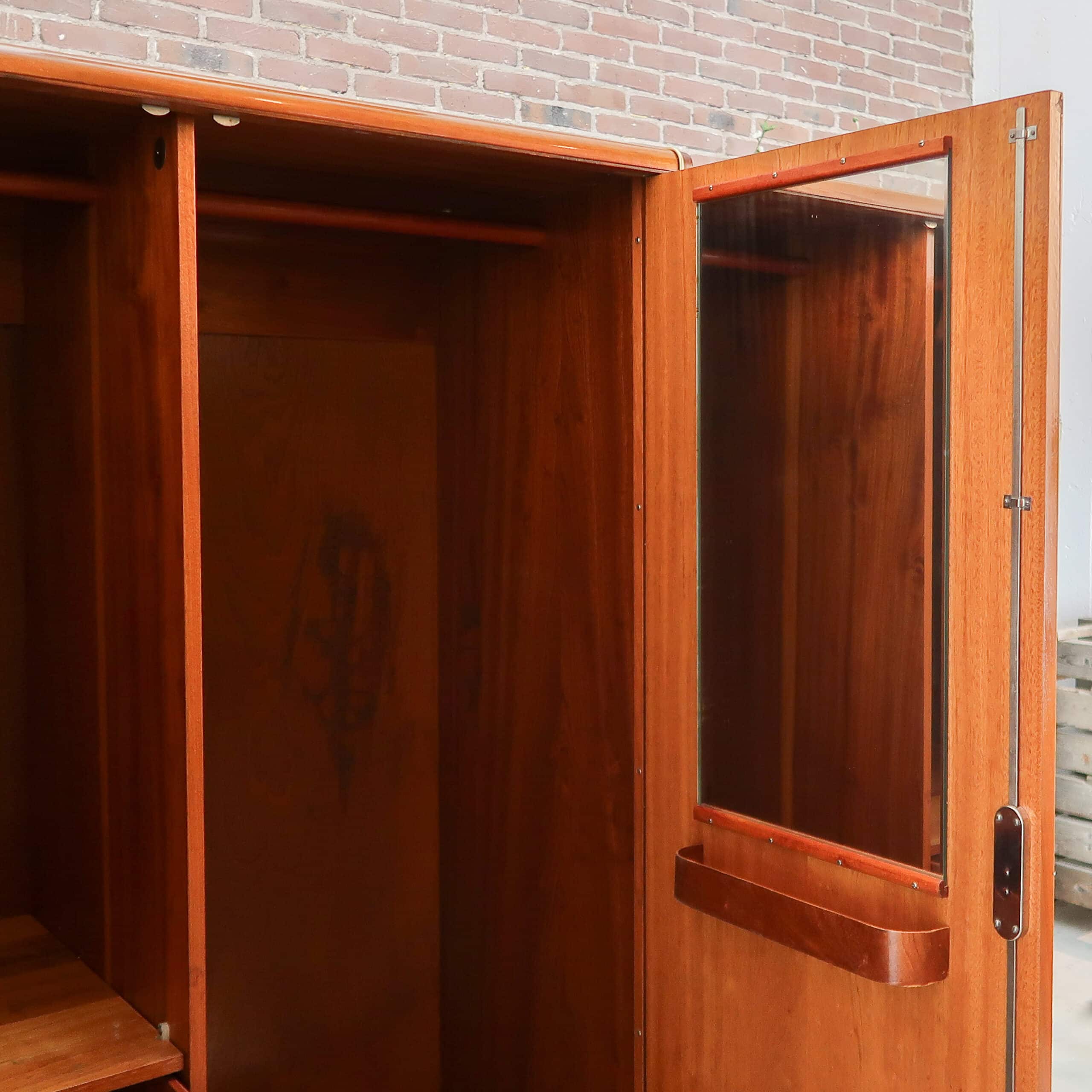Zeldzame Jitona kledingkast uit de jaren ’60, gemaakt in Soběslav (fabriek Lišov, Tsjechoslowakije). De kast valt op door zijn spectaculaire houttekening met golvende nerf en subtiele messing bies langs de deuren. Binnenin een verfijnde indeling met twee ruime lades, legplanken, een spiegel en originele details. Een luxueus stukje Oost-Europees mid-century design met karakter en klasse.