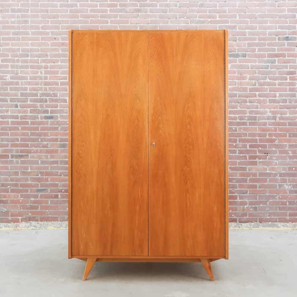 Prachtige Tsjechoslowaakse kledingkast uit 1968, model U-486-1 van UP závody. Strakke lijnen, schuine poten en een warme houtkleur geven dit stuk die kenmerkende mid-century uitstraling. Binnenin een mooie indeling met hangruimte, legplanken en een lade — praktisch én stijlvol. Een tijdloos ontwerp met karakter en originele fabriekssticker nog aanwezig.