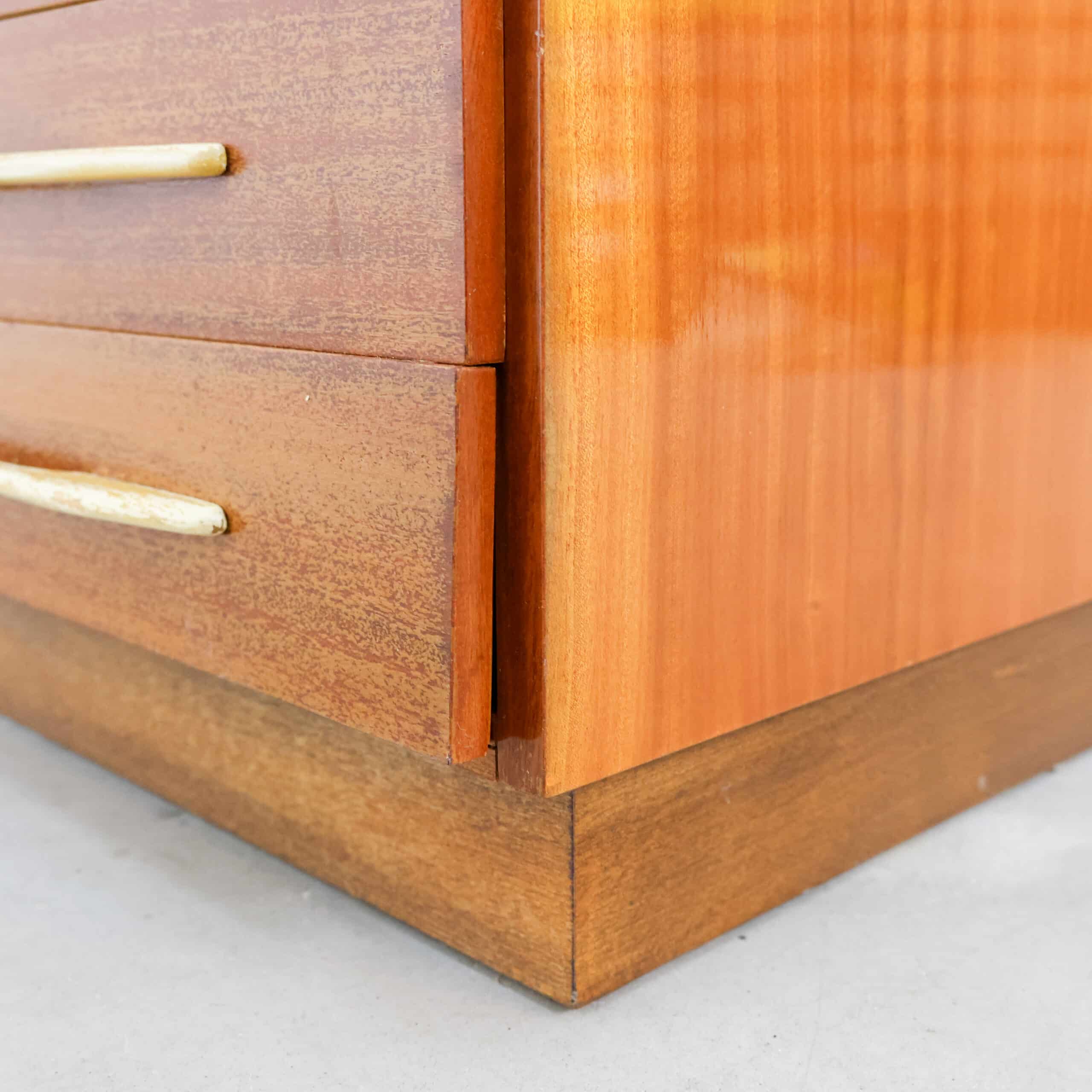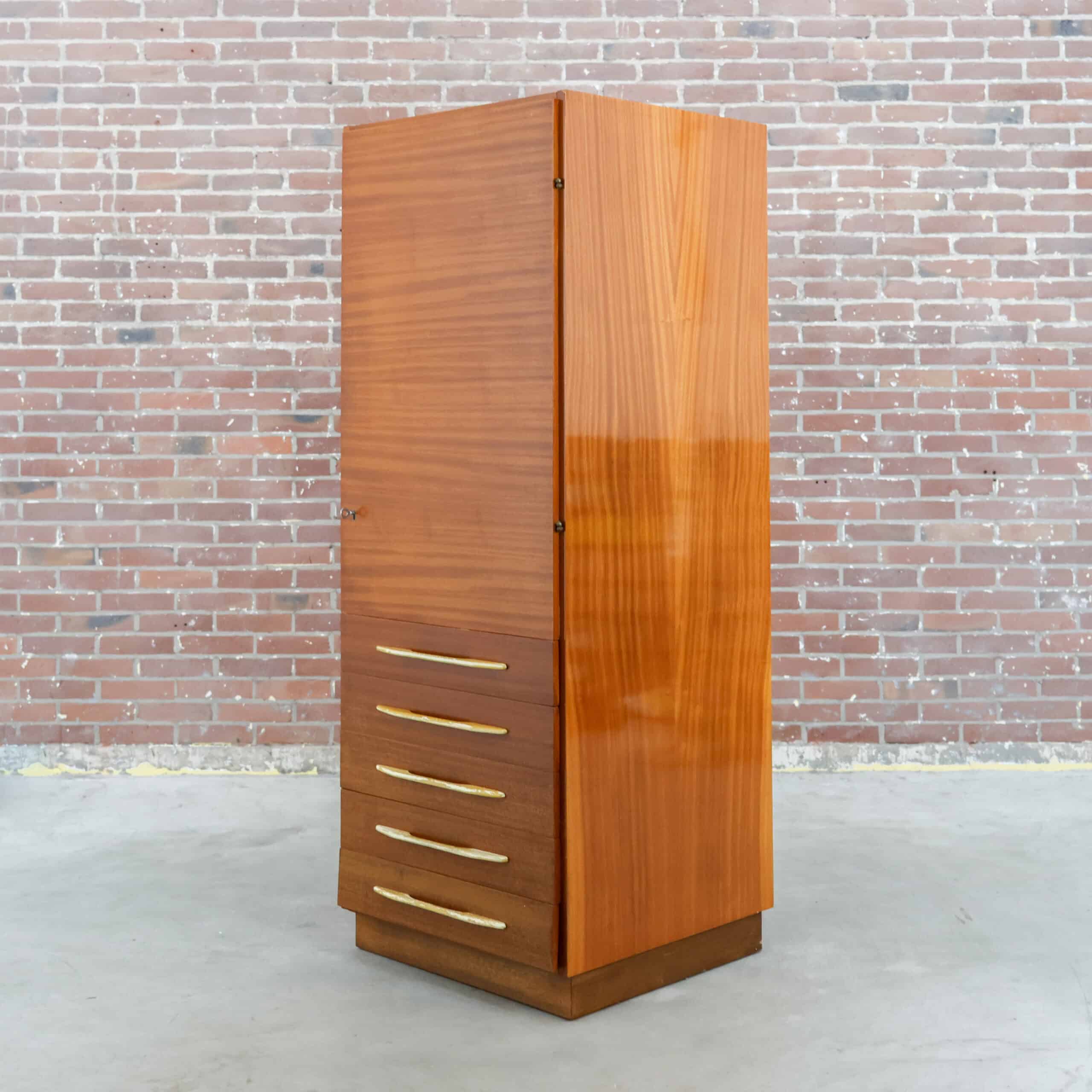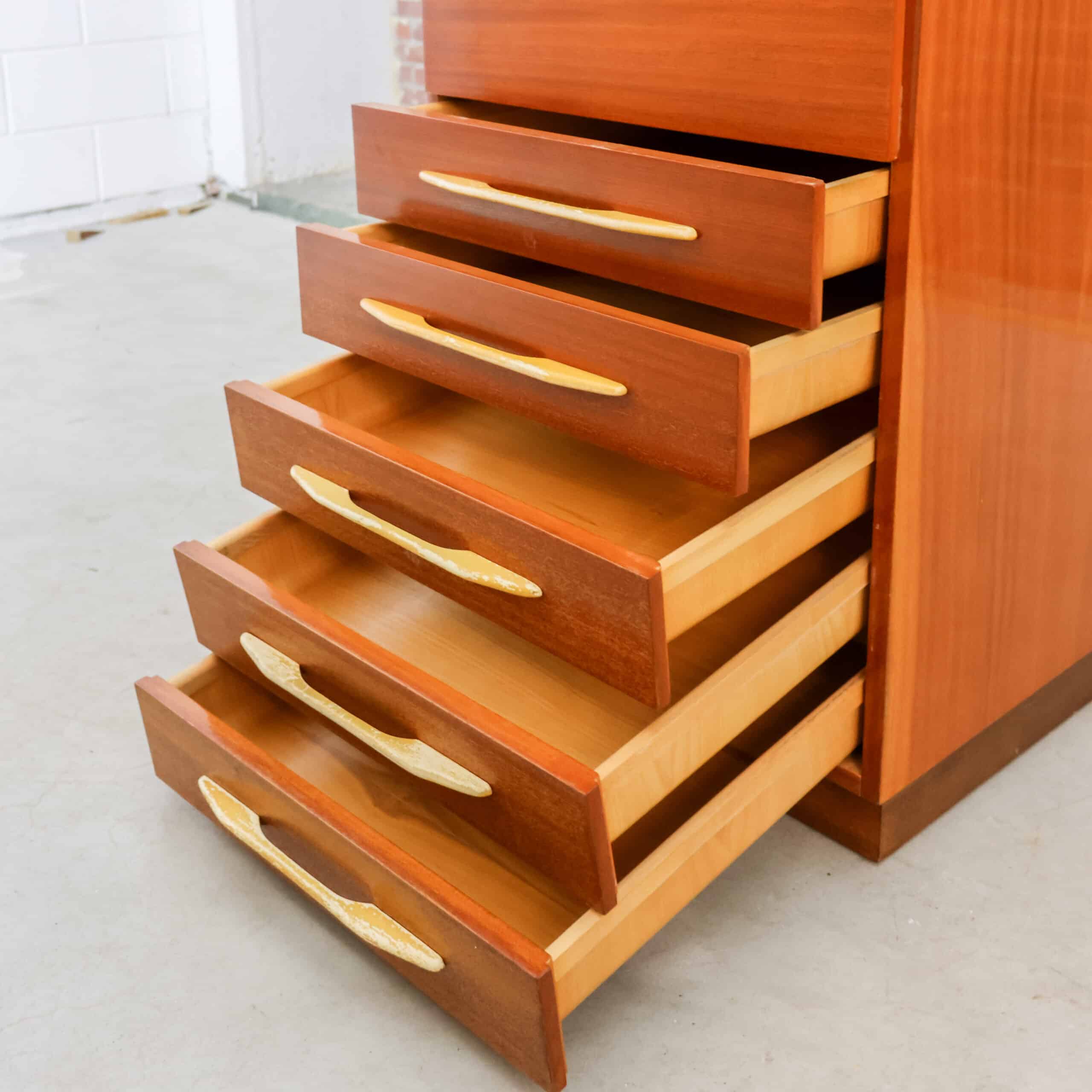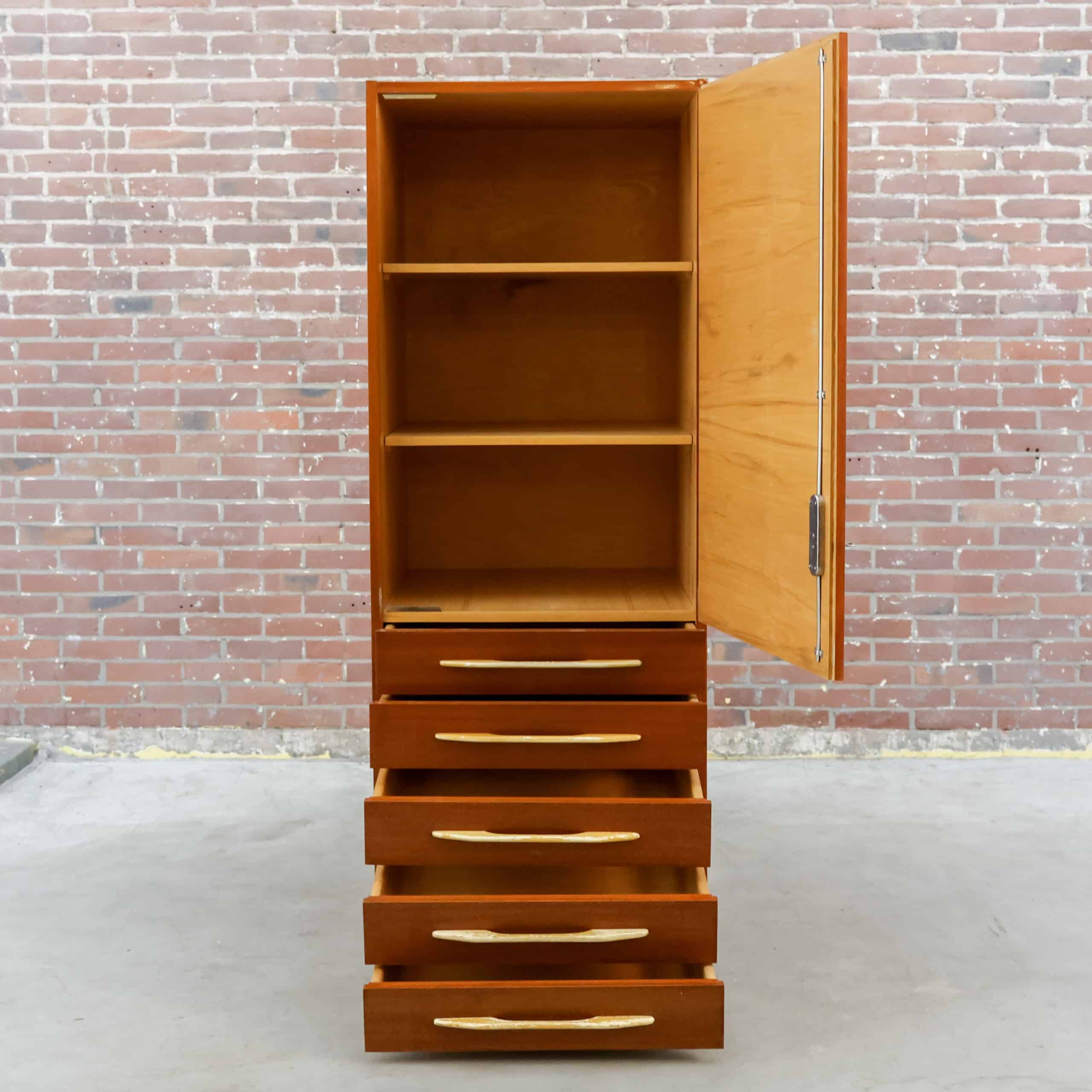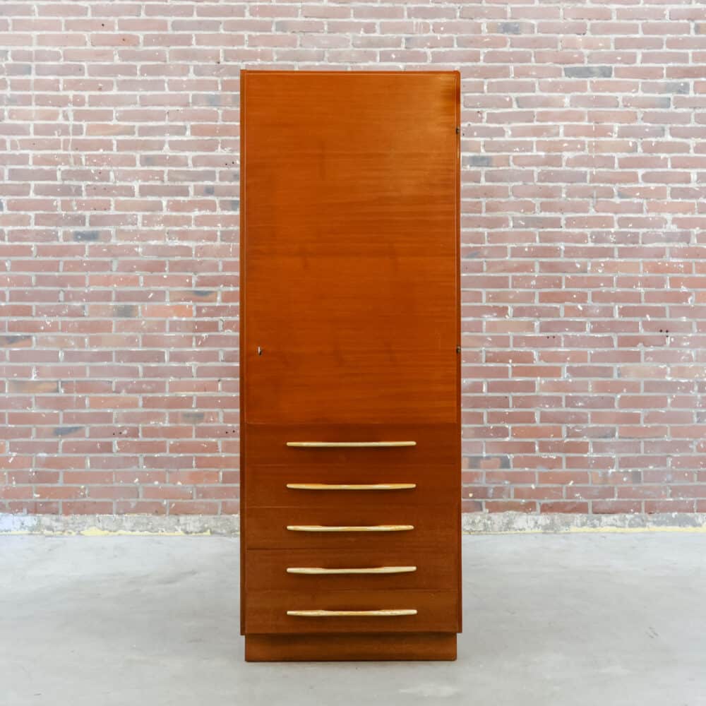 Prachtige vintage kledingkast uit 1982 van UP Závody Bučovice, uitgevoerd in warm mahoniehout.Het slanke model met vijf laden en elegante handgrepen geeft een echte mid-century uitstraling en is perfect voor slaapkamer, hal of atelier. De kast heeft een mooie originele uitstraling met een fijne houttekening en veel praktische opbergruimte.Er zijn enkele gebruikssporen zichtbaar (o.a. slijtage aan handgrepen en een kleine beschadiging aan een hoek), passend bij de leeftijd.