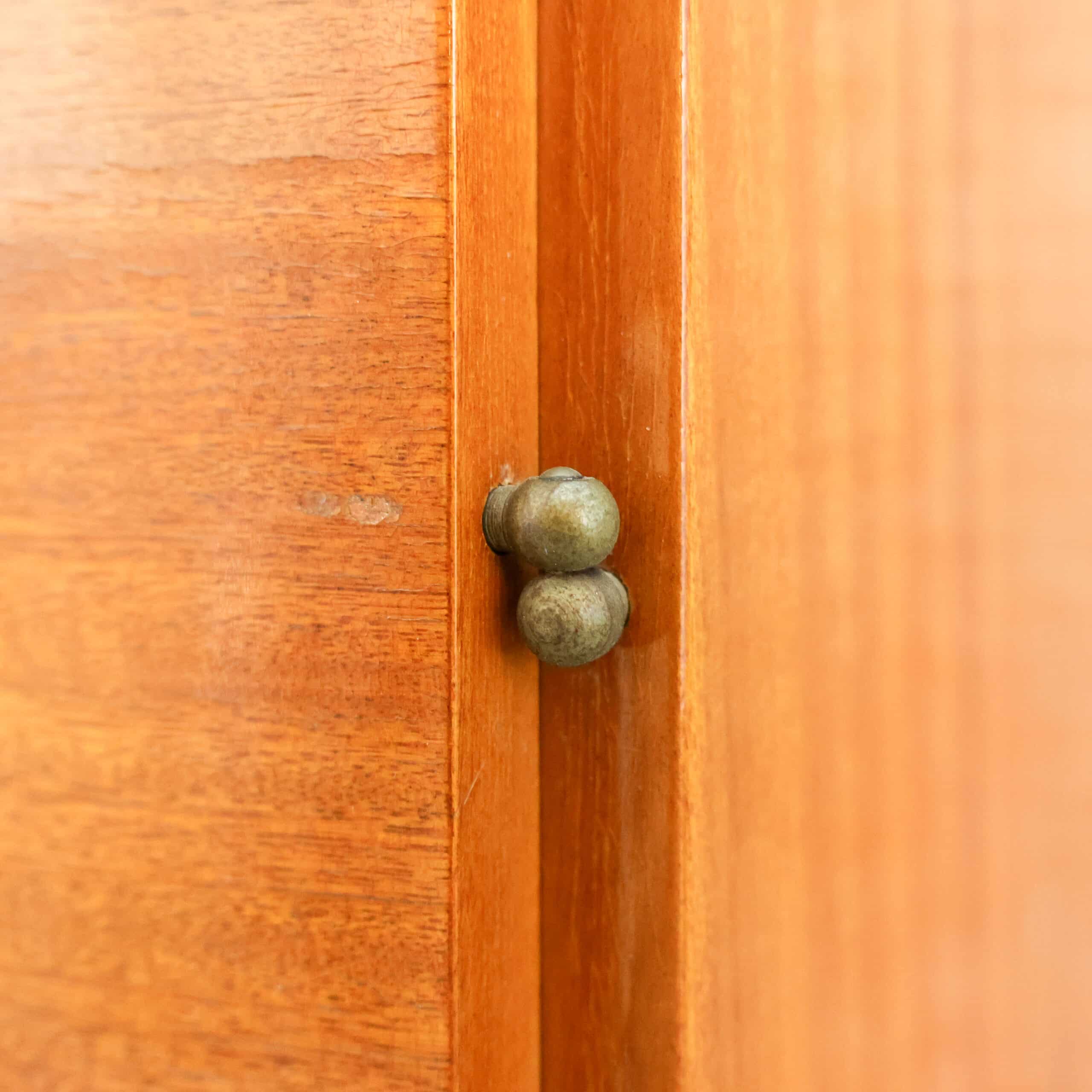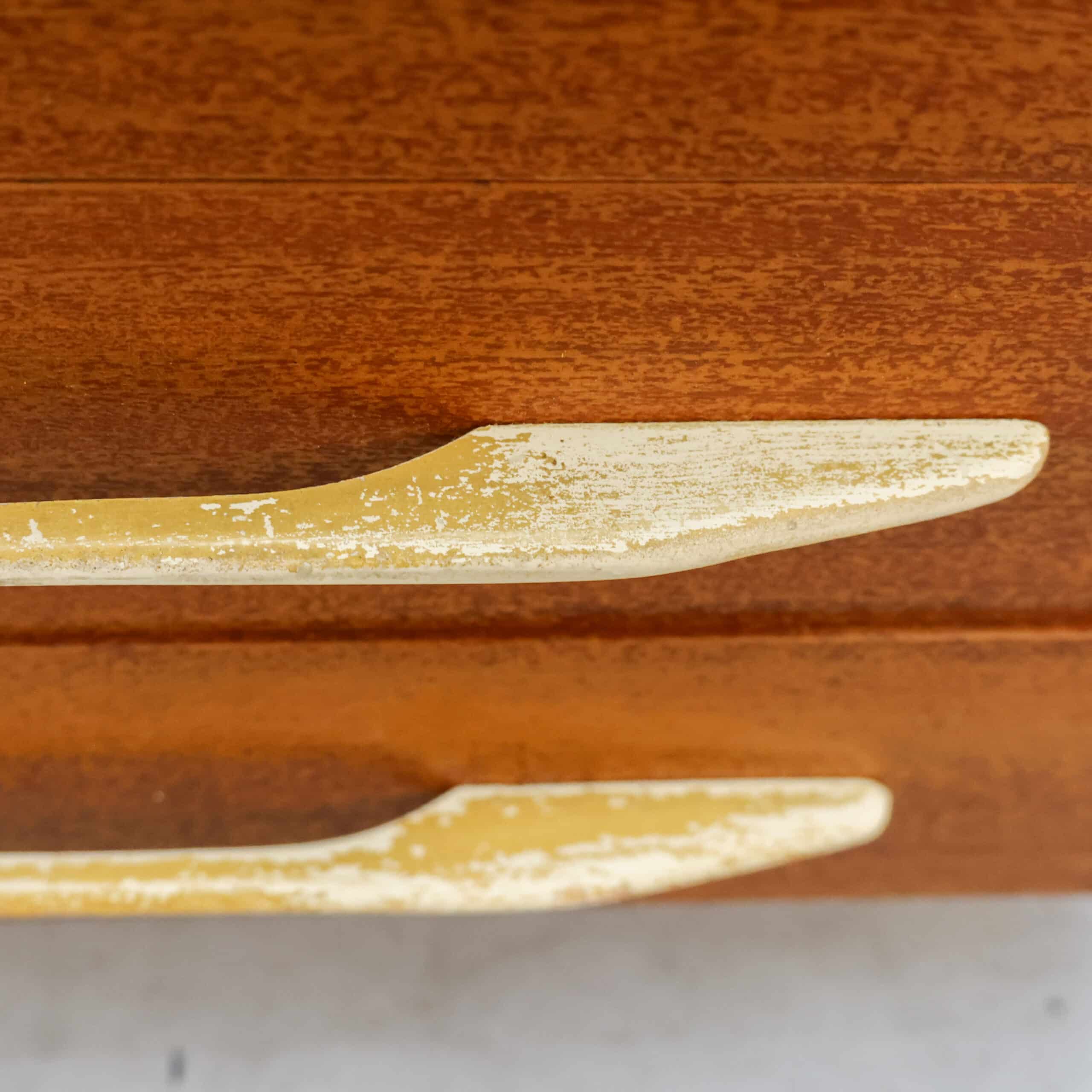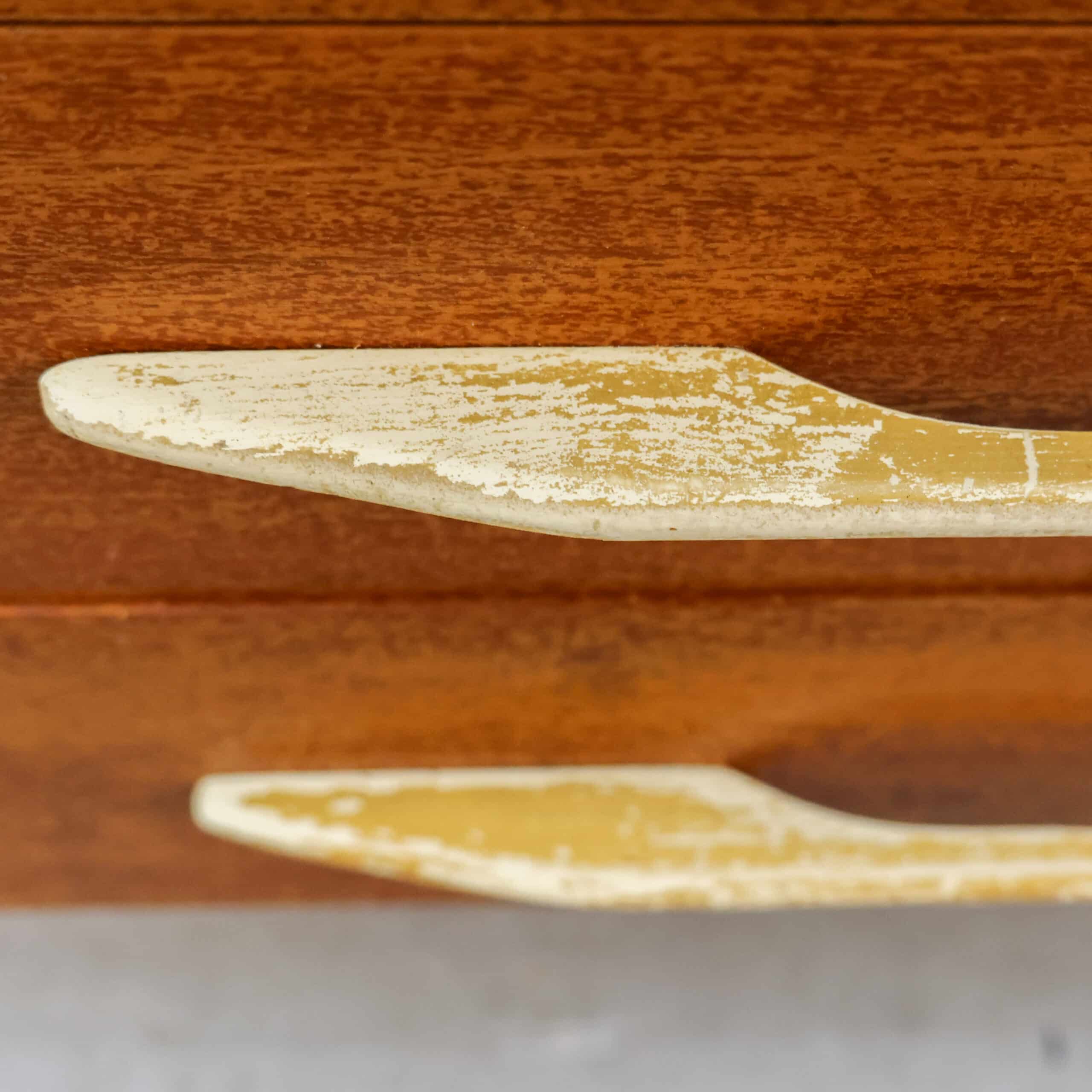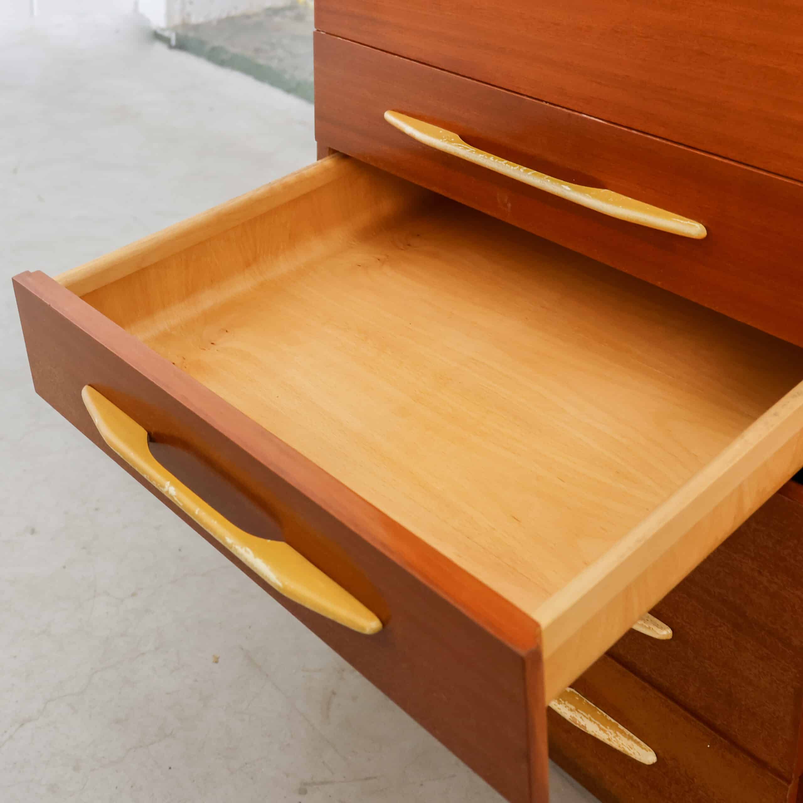 Prachtige vintage kledingkast uit 1982 van UP Závody Bučovice, uitgevoerd in warm mahoniehout.Het slanke model met vijf laden en elegante handgrepen geeft een echte mid-century uitstraling en is perfect voor slaapkamer, hal of atelier. De kast heeft een mooie originele uitstraling met een fijne houttekening en veel praktische opbergruimte.Er zijn enkele gebruikssporen zichtbaar (o.a. slijtage aan handgrepen en een kleine beschadiging aan een hoek), passend bij de leeftijd.