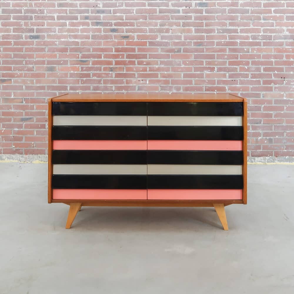Originele U-453 ladekast van Interiér Praha, Tsjechoslowakije, jaren ’60. Ontworpen door František Jirák – een echt designicoon met zwart-witte-roze laminaatfronten en taps toelopende poten. De binnenlades zijn van karakteristiek geel kunststof, in mooie vintage staat met sporen van gebruik. Een grafisch statement en praktisch meubel in één – strak, vrolijk en vol mid-century charme.