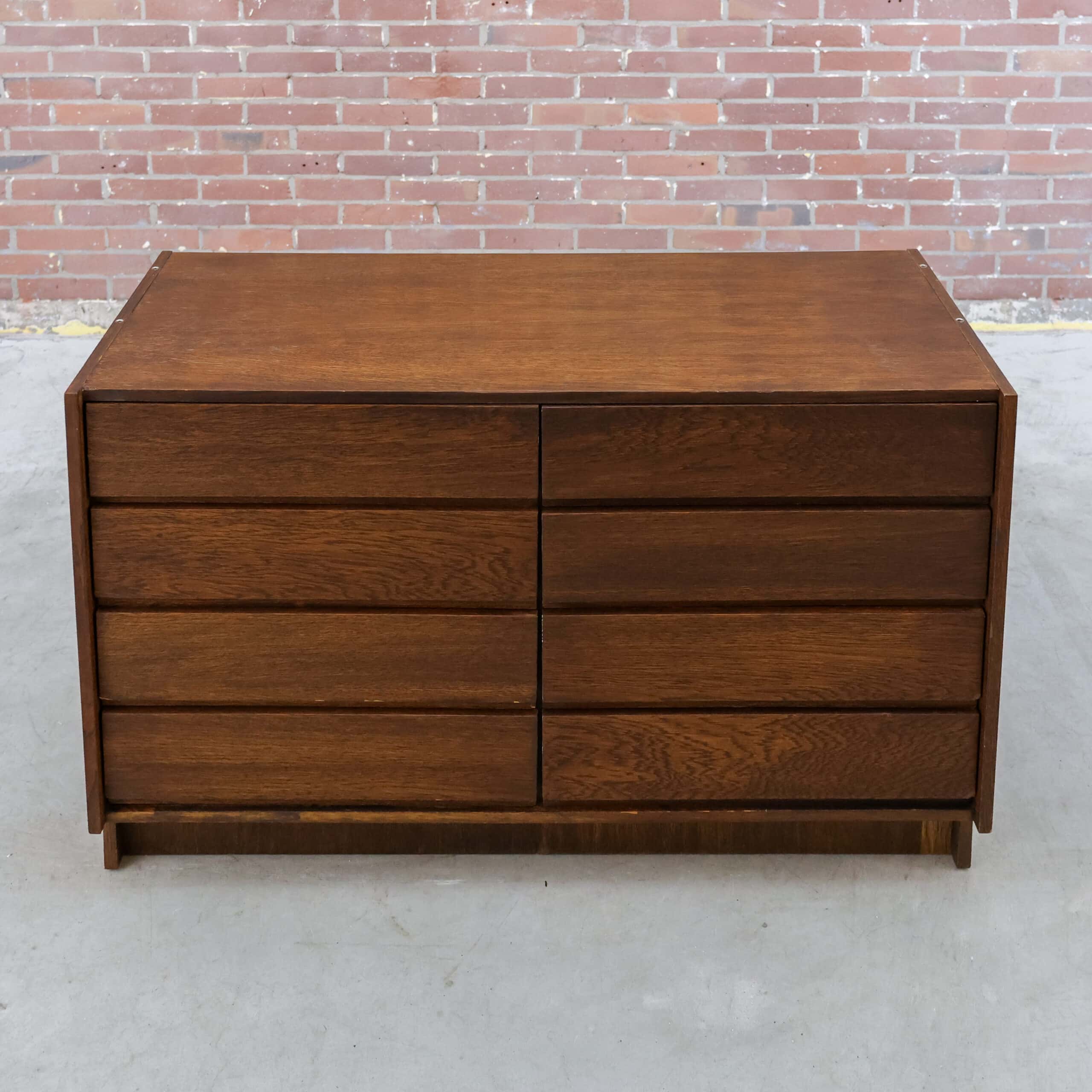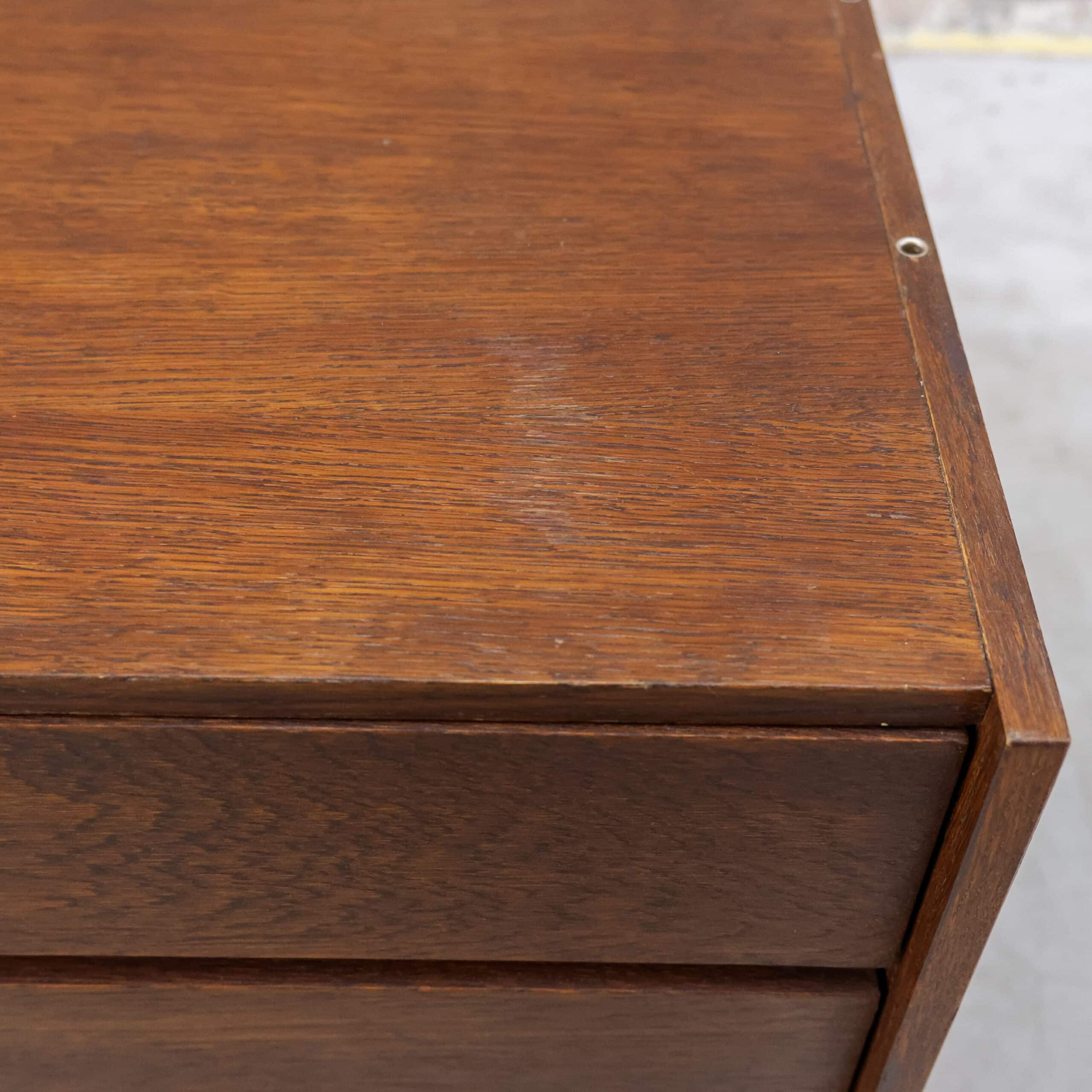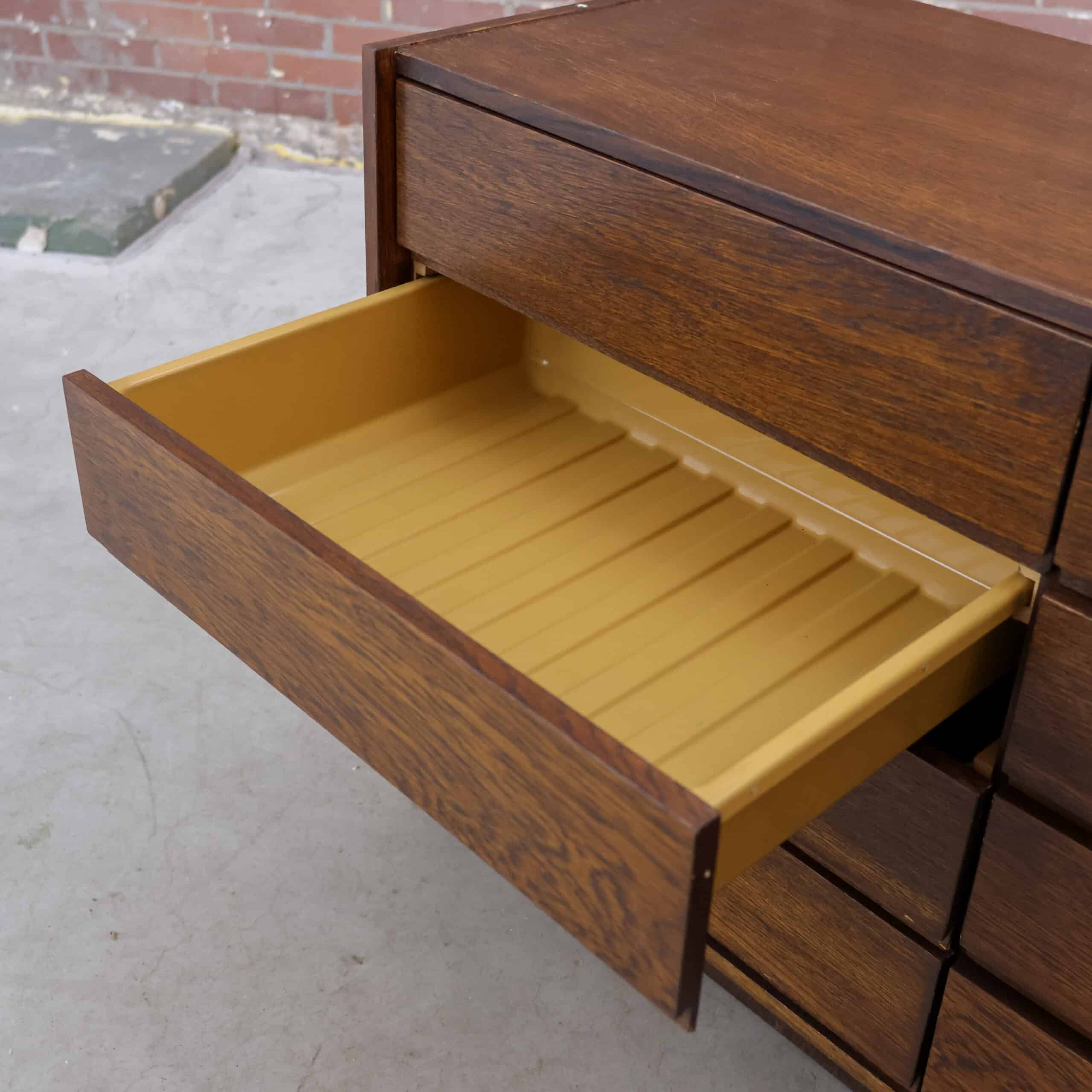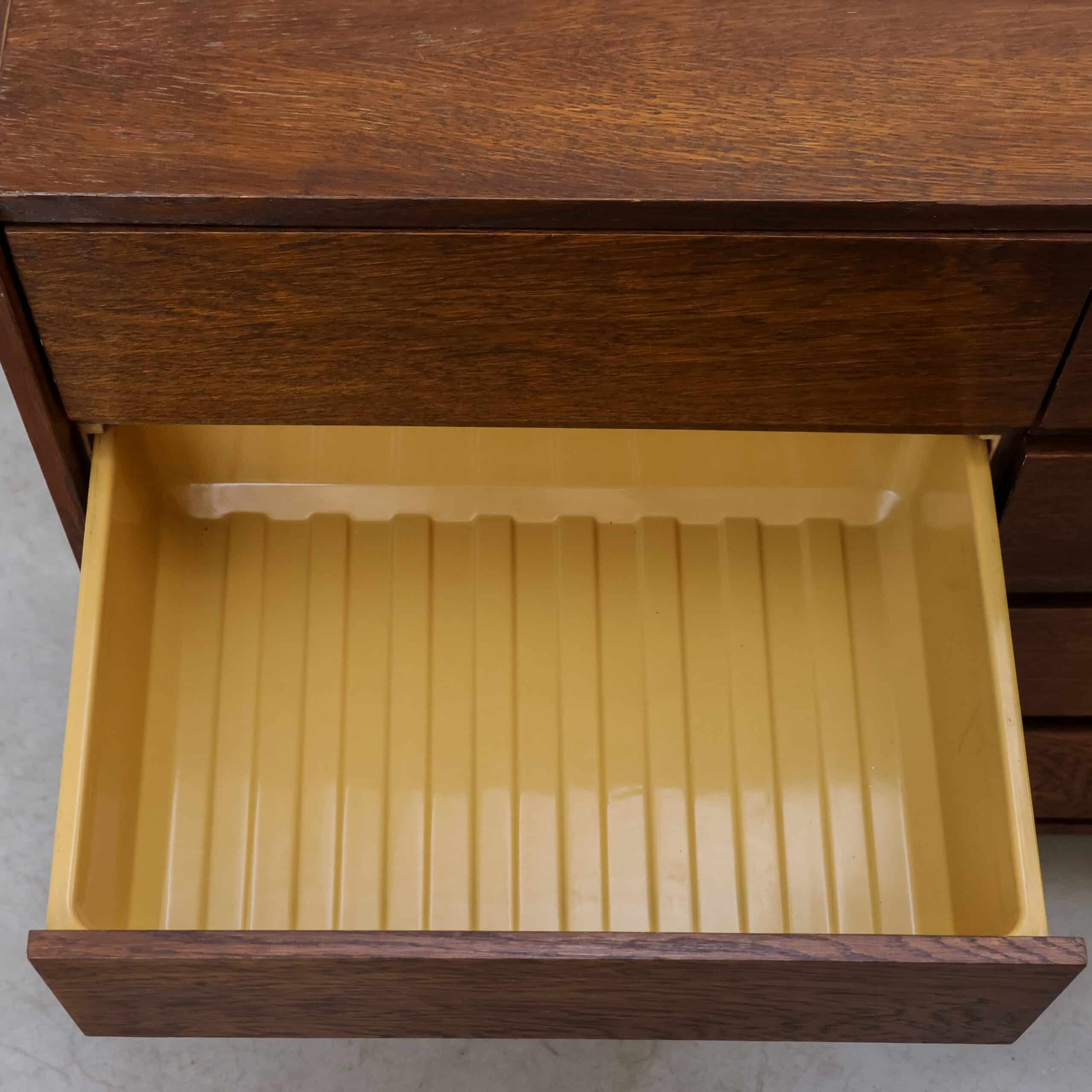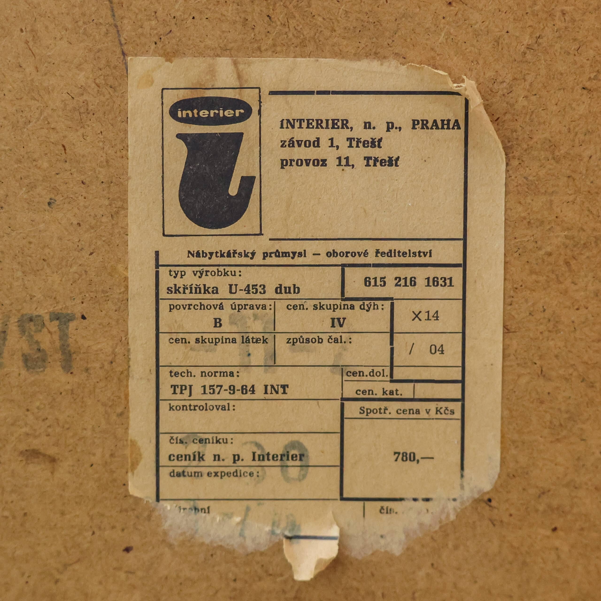Prachtige vintage ladekast U-453 van Interiér Praha uit de jaren 60, uitgevoerd in warm massief eikenhout. Het strakke horizontale lijnenspel en de solide plint geven dit meubel een tijdloos modernistisch karakter. De originele gele ladebakken vormen een uniek grafisch contrast en zijn volledig intact. Inclusief origineel fabriekslabel – een zeldzaam en karaktervol stuk voor liefhebbers van mid-century design.