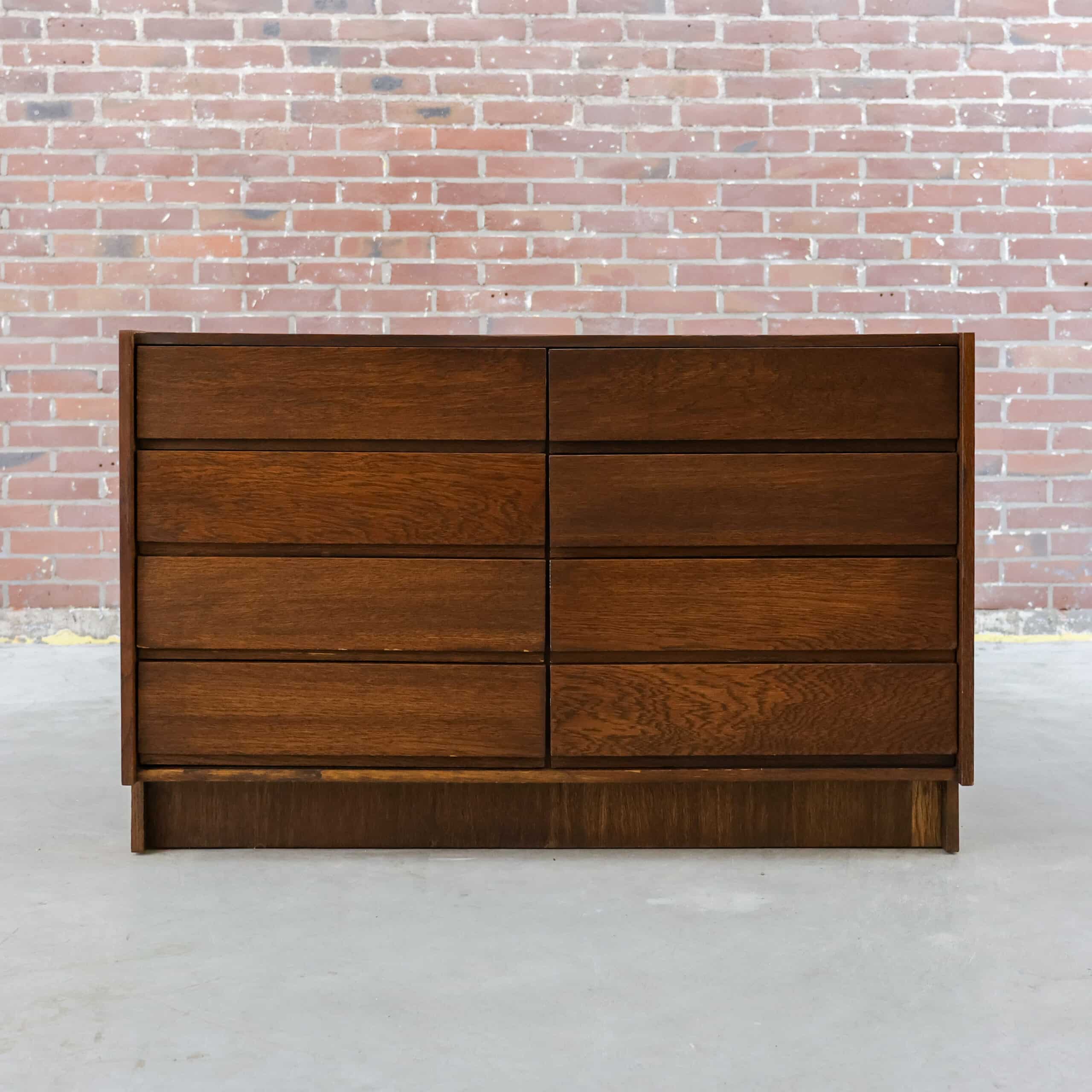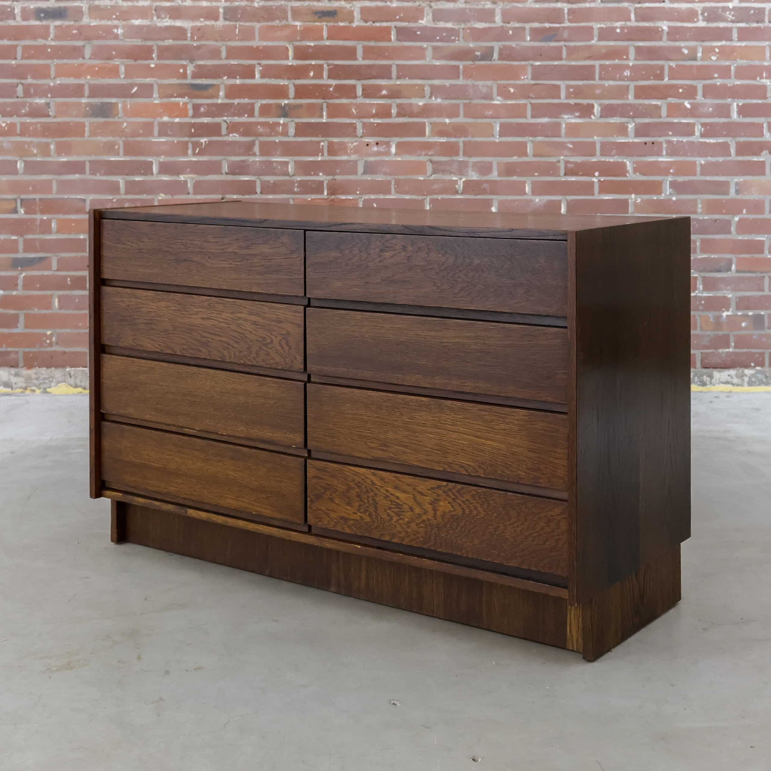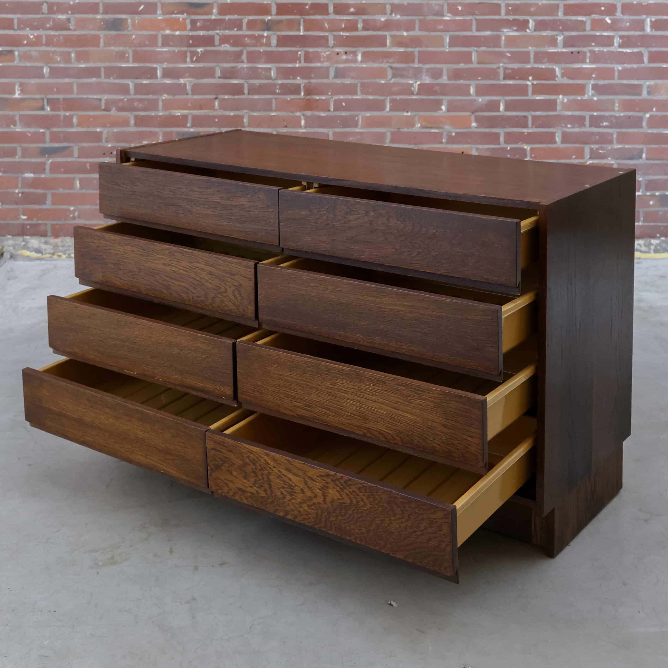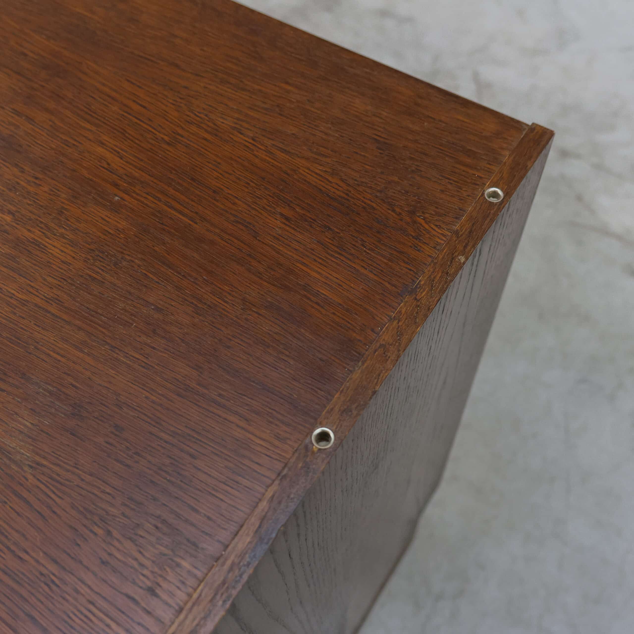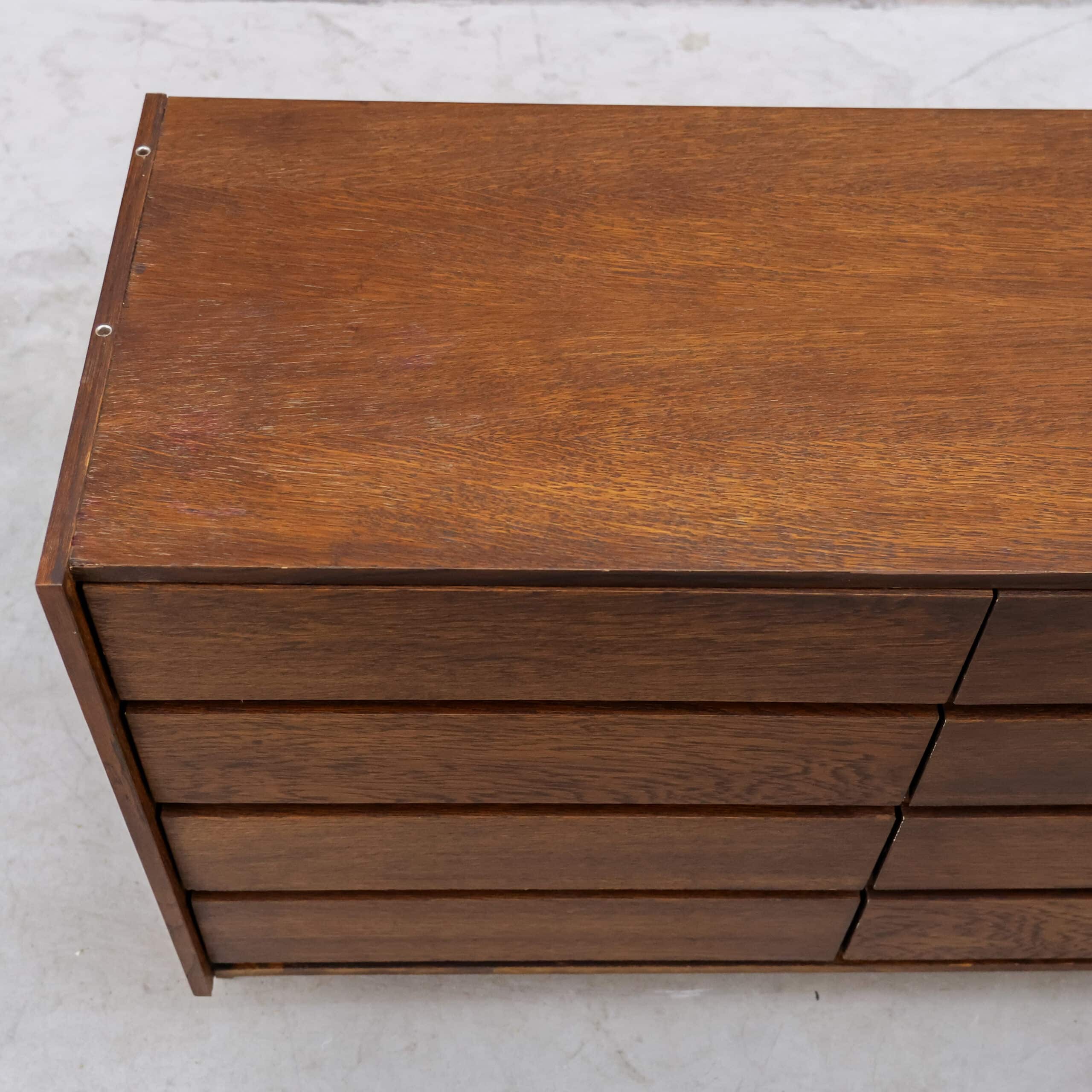 Prachtige vintage ladekast U-453 van Interiér Praha uit de jaren 60, uitgevoerd in warm massief eikenhout. Het strakke horizontale lijnenspel en de solide plint geven dit meubel een tijdloos modernistisch karakter. De originele gele ladebakken vormen een uniek grafisch contrast en zijn volledig intact. Inclusief origineel fabriekslabel – een zeldzaam en karaktervol stuk voor liefhebbers van mid-century design.