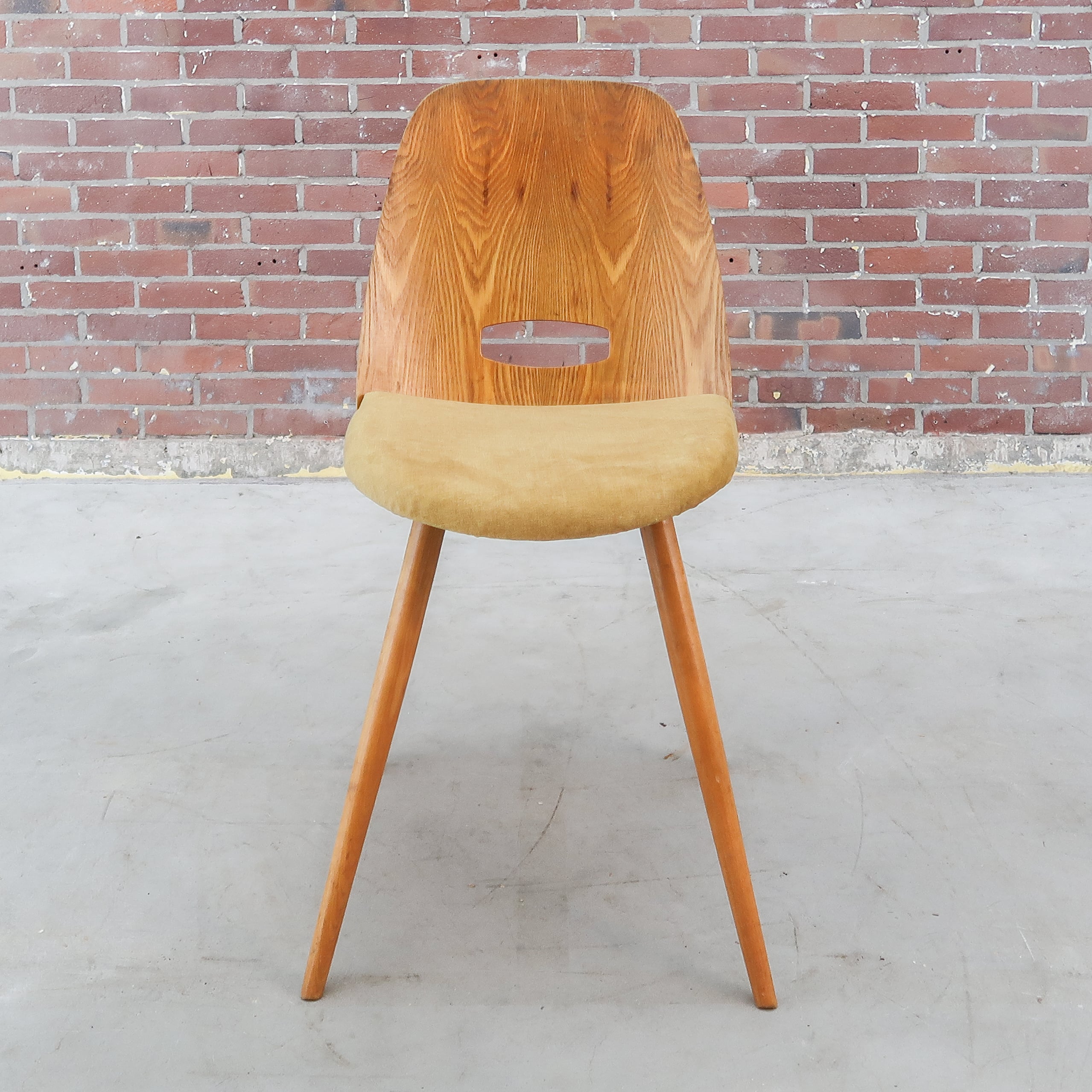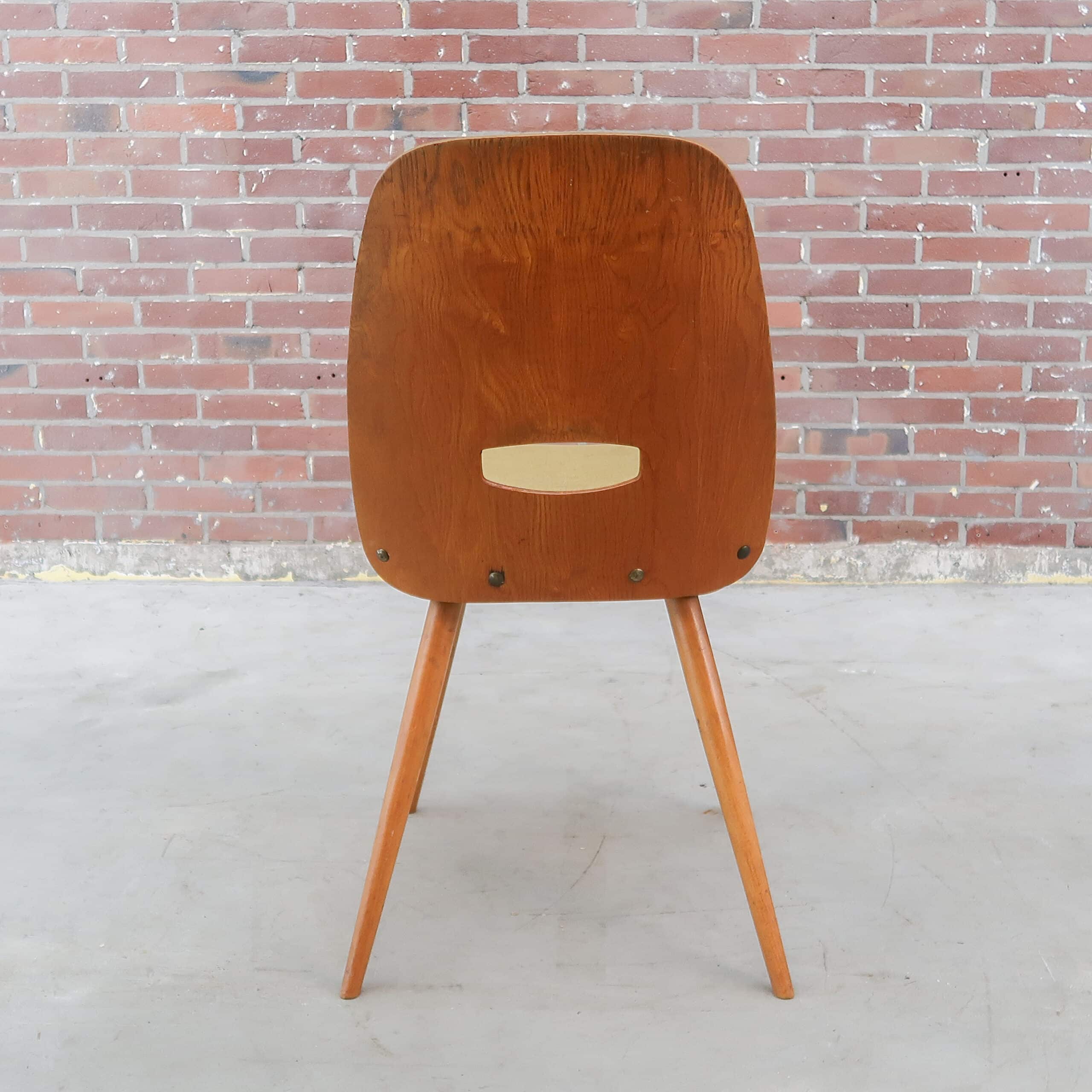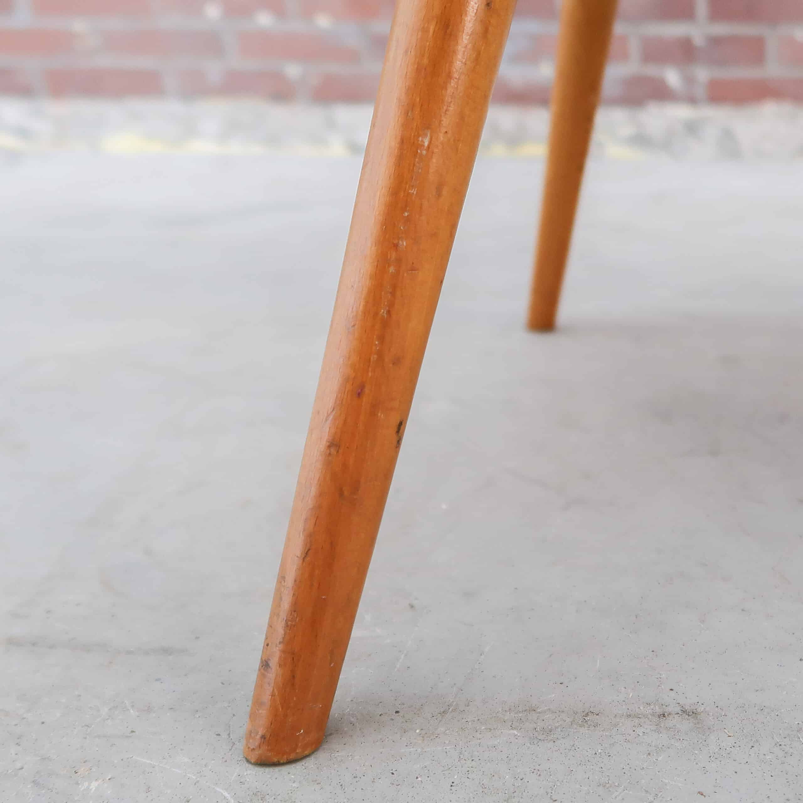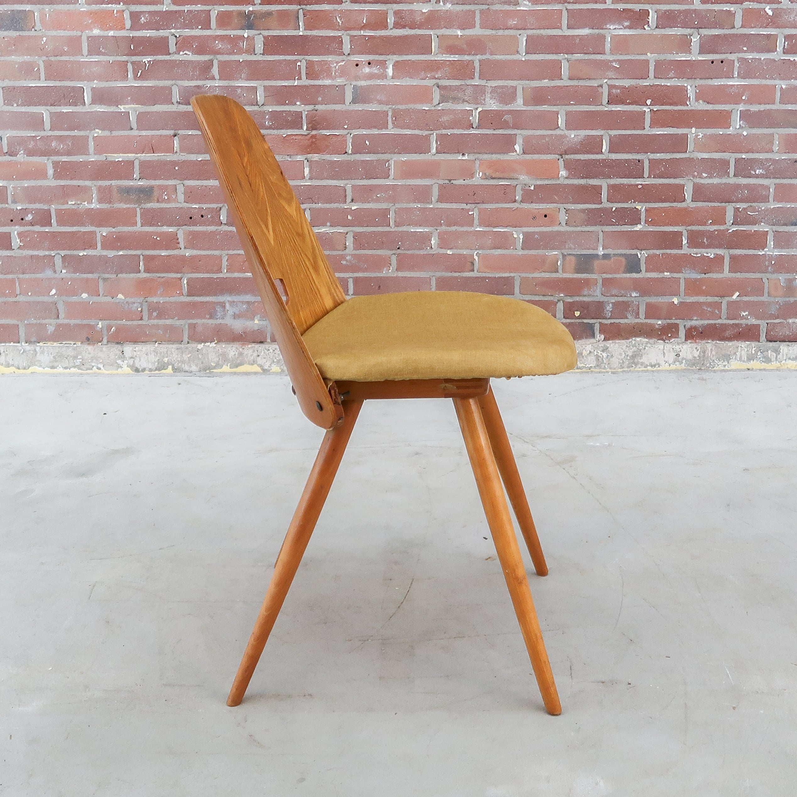 Vintage Lollipop stoel, ontworpen in de stijl van František Jirák en gedateerd rond de jaren 60. Met zijn gebogen houten rugleuning met handgreep, slanke taps toelopende poten en rode sixties-bekleding ademt hij het iconische modernisme van die tijd. Jirák stond bekend om zijn elegante, functionele ontwerpen die vandaag nog steeds geliefd zijn bij verzamelaars. Een zeldzaam en authentiek stuk met label.