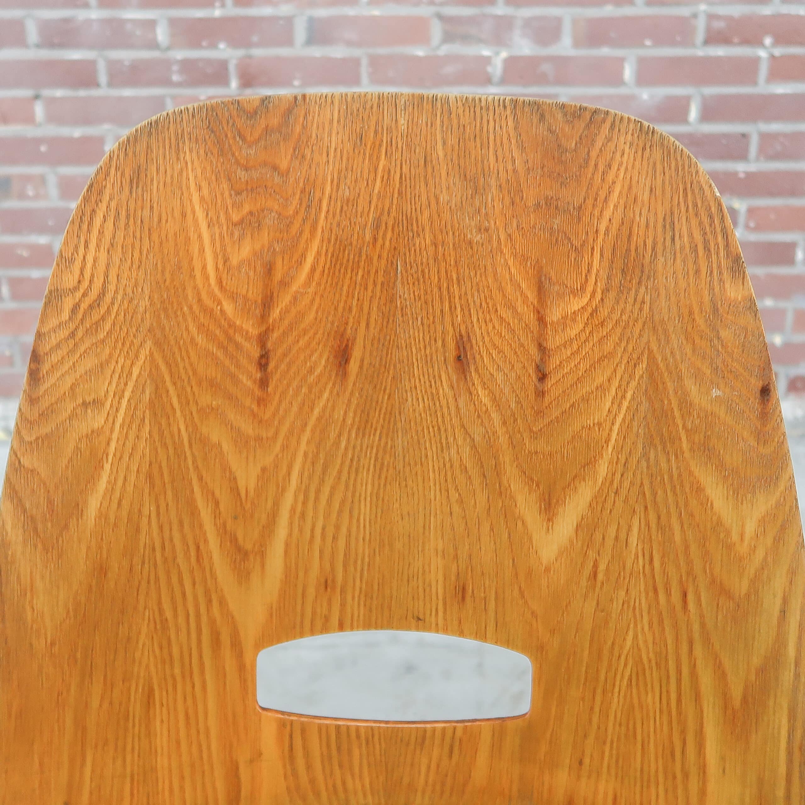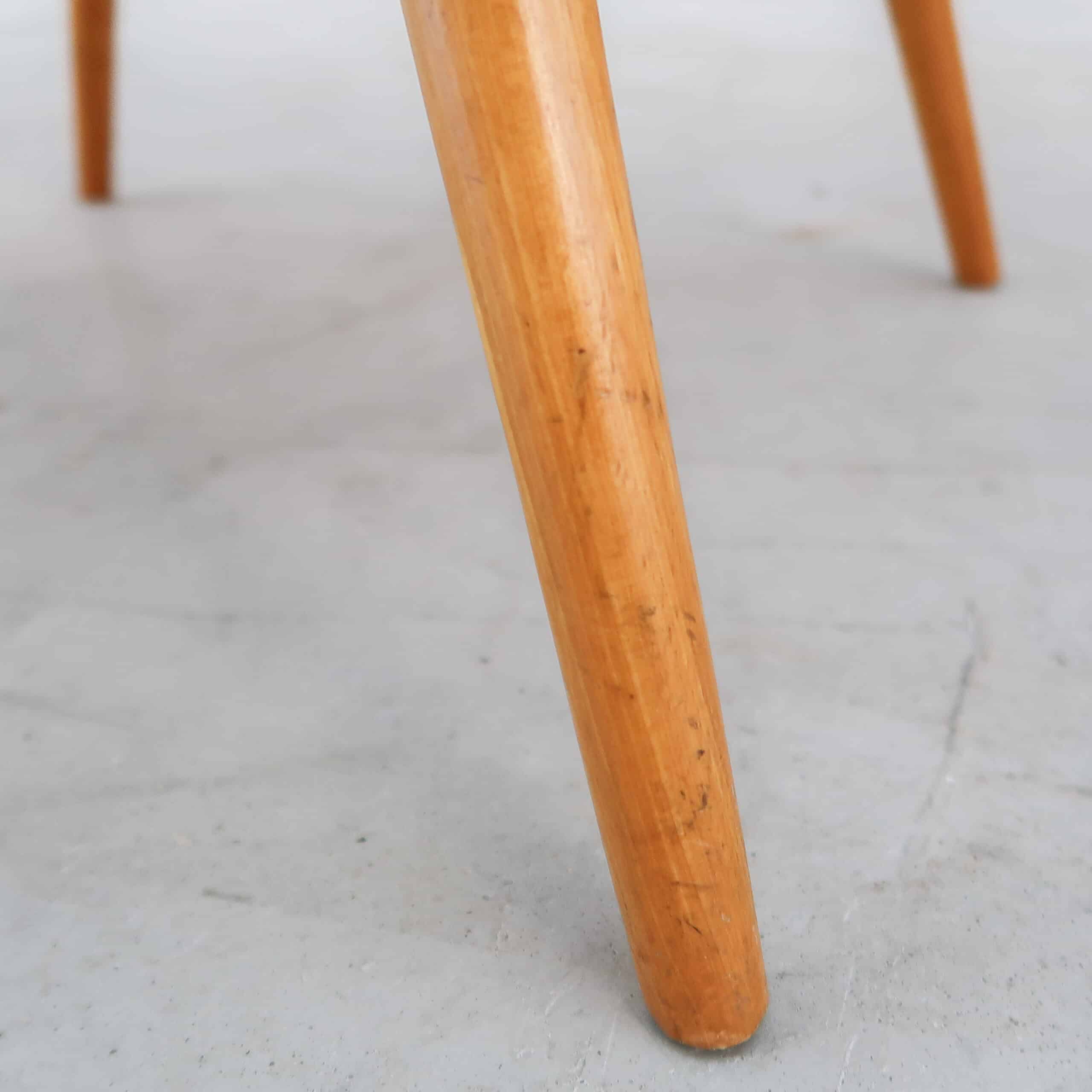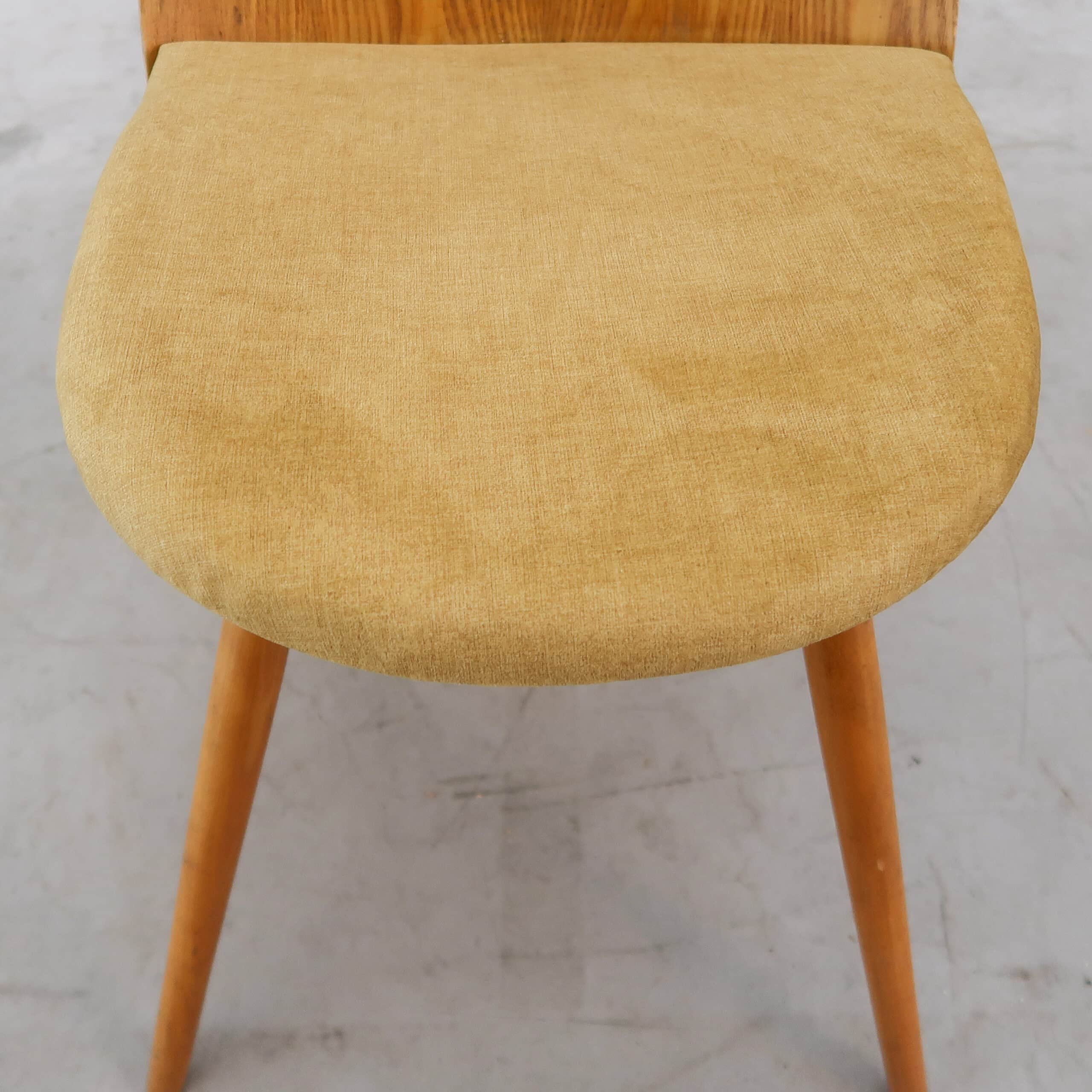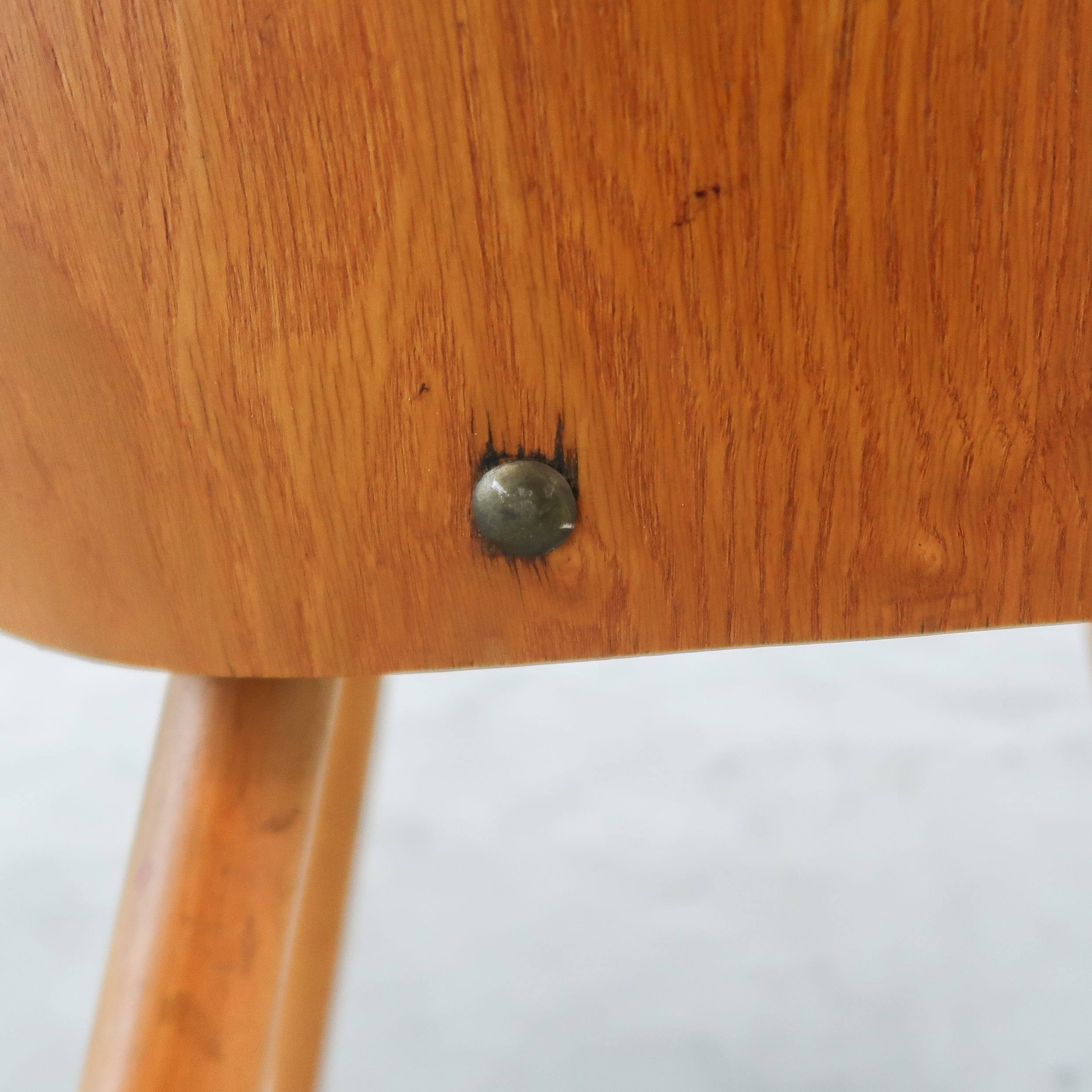 Vintage Lollipop stoel, ontworpen in de stijl van František Jirák en gedateerd rond de jaren 60. Met zijn gebogen houten rugleuning met handgreep, slanke taps toelopende poten en rode sixties-bekleding ademt hij het iconische modernisme van die tijd. Jirák stond bekend om zijn elegante, functionele ontwerpen die vandaag nog steeds geliefd zijn bij verzamelaars. Een zeldzaam en authentiek stuk met label.