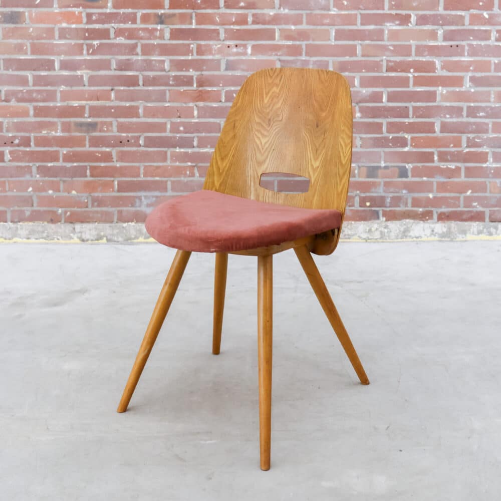 Vintage Lollipop stoel, ontworpen in de stijl van František Jirák en gedateerd rond de jaren 60. Met zijn gebogen houten rugleuning met handgreep, slanke taps toelopende poten en rode sixties-bekleding ademt hij het iconische modernisme van die tijd. Jirák stond bekend om zijn elegante, functionele ontwerpen die vandaag nog steeds geliefd zijn bij verzamelaars. Een zeldzaam en authentiek stuk met label.