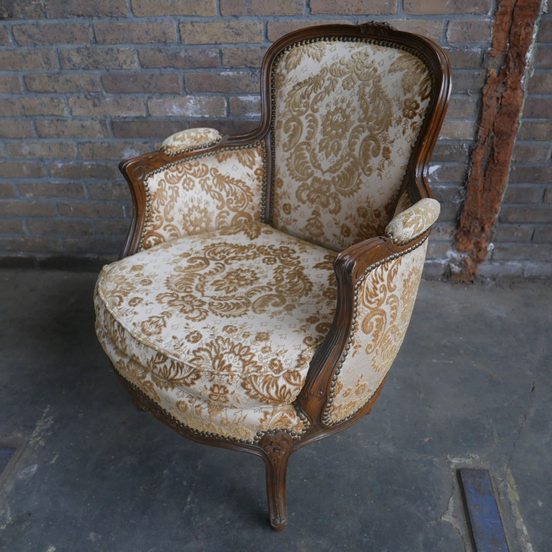 Deze klassieke vintage Louis XV fauteuils zijn gemaakt van hout en hebben een gele katoenen bloemen bekleding. Ook de armleuningen zijn bekleed. We hebben er twee. De stoelen tonen gebruikerssporen.