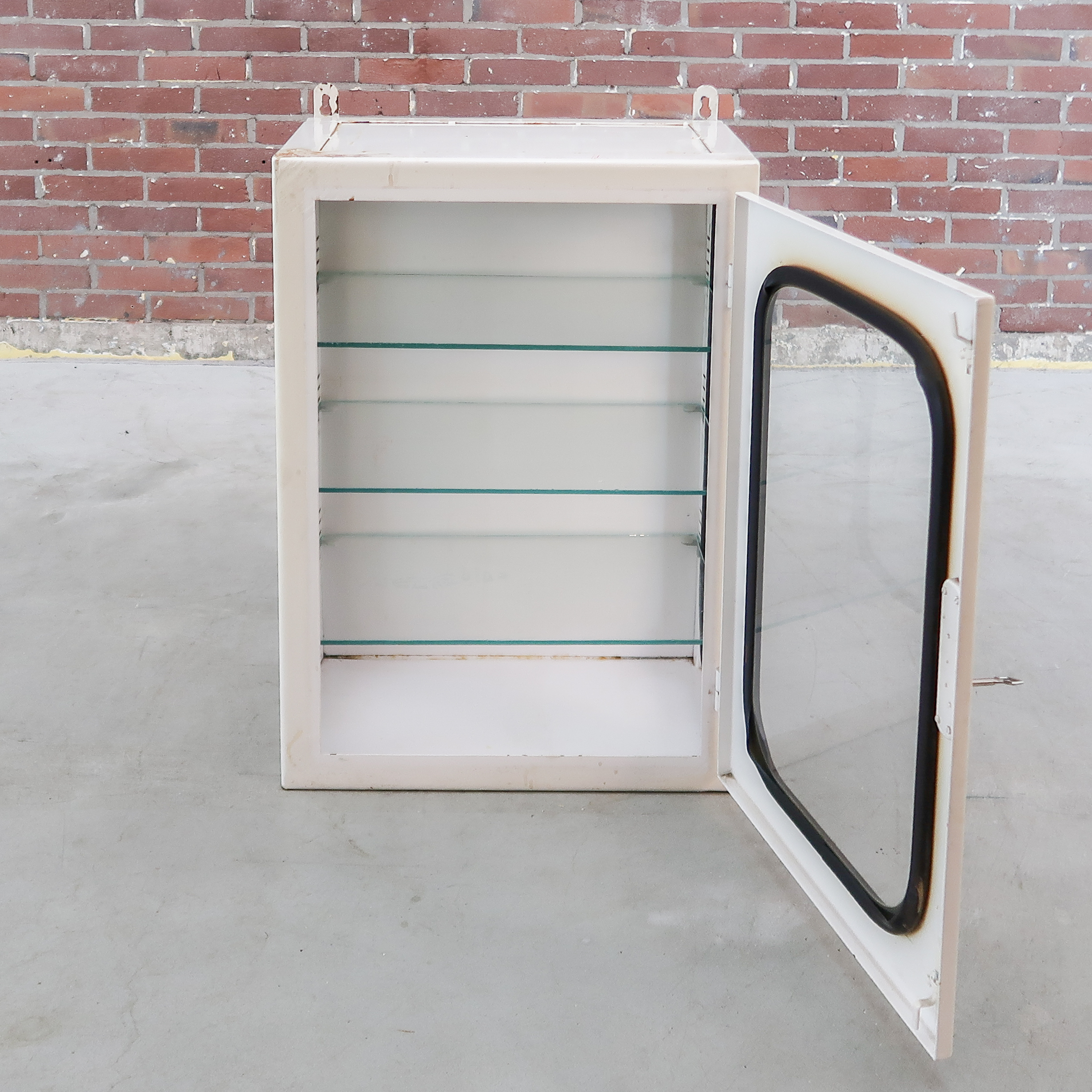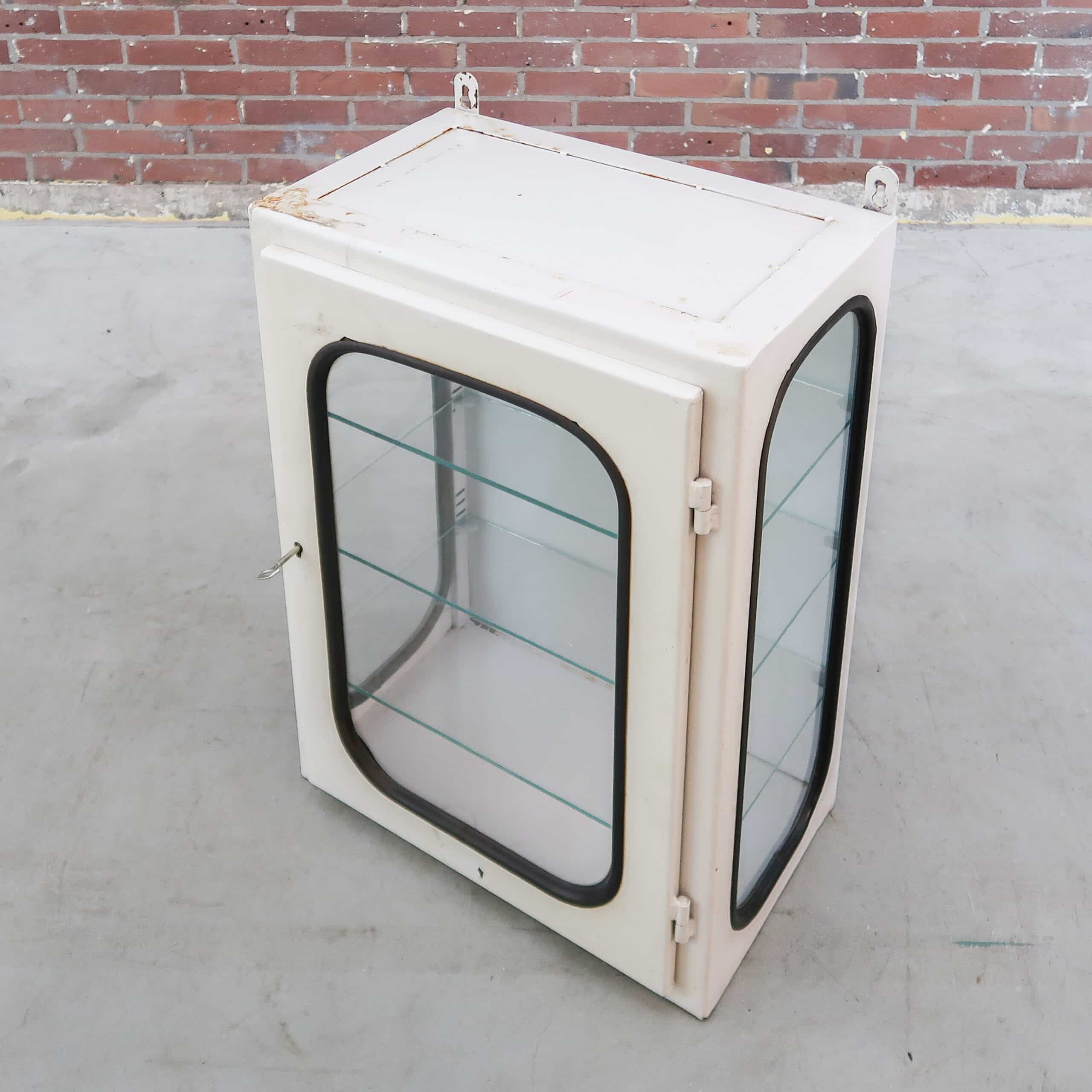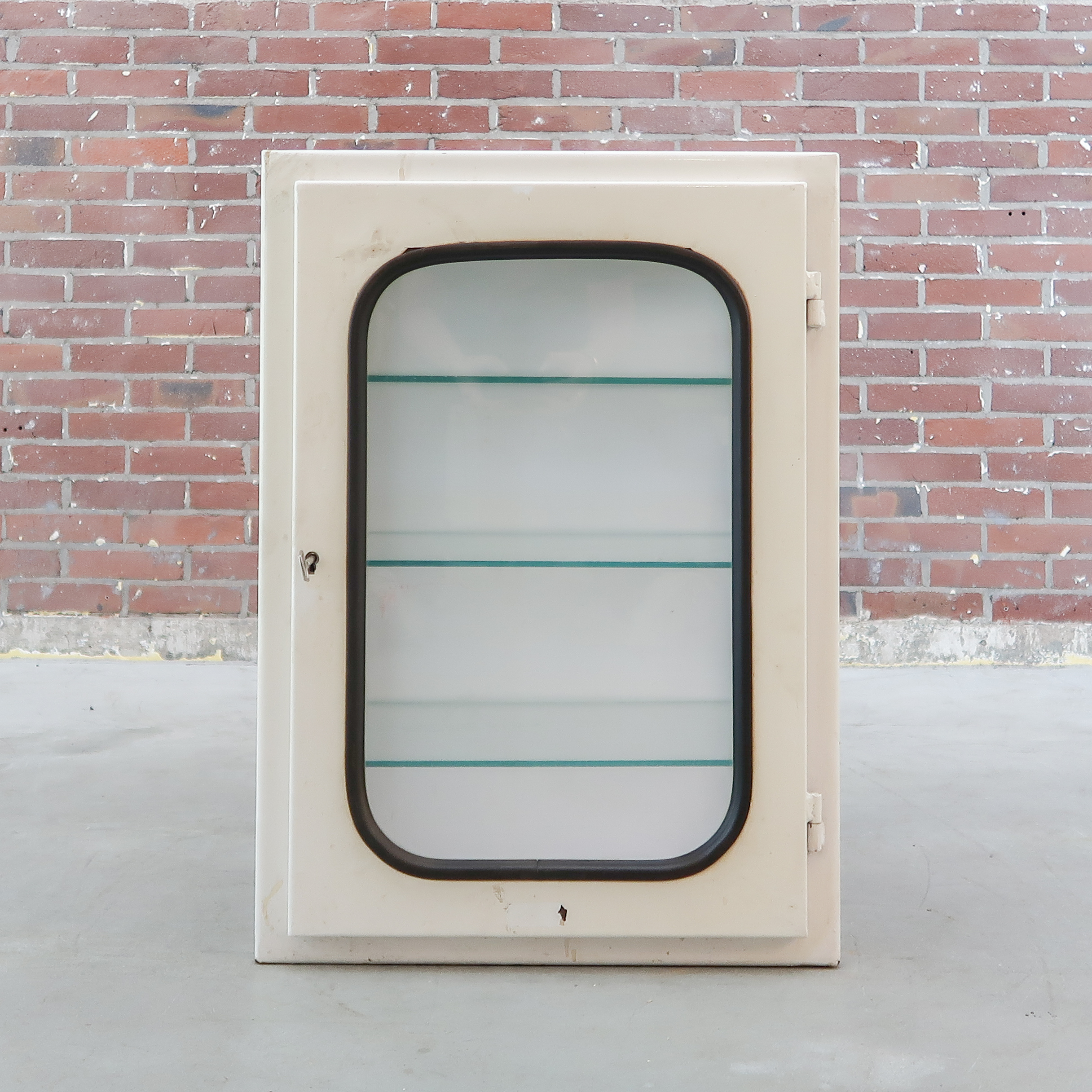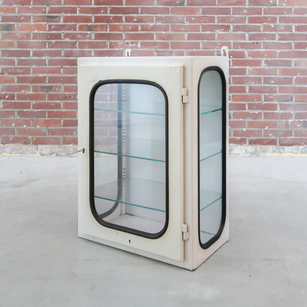 Stoer en stijlvol, dit vintage metalen kastje met glazen legplanken is een echte blikvanger aan de muur. Oorspronkelijk bedoeld als medicijnkast, maar nu perfect als mini-vitrinekast voor je mooiste spulletjes. Functioneel én karaktervol.