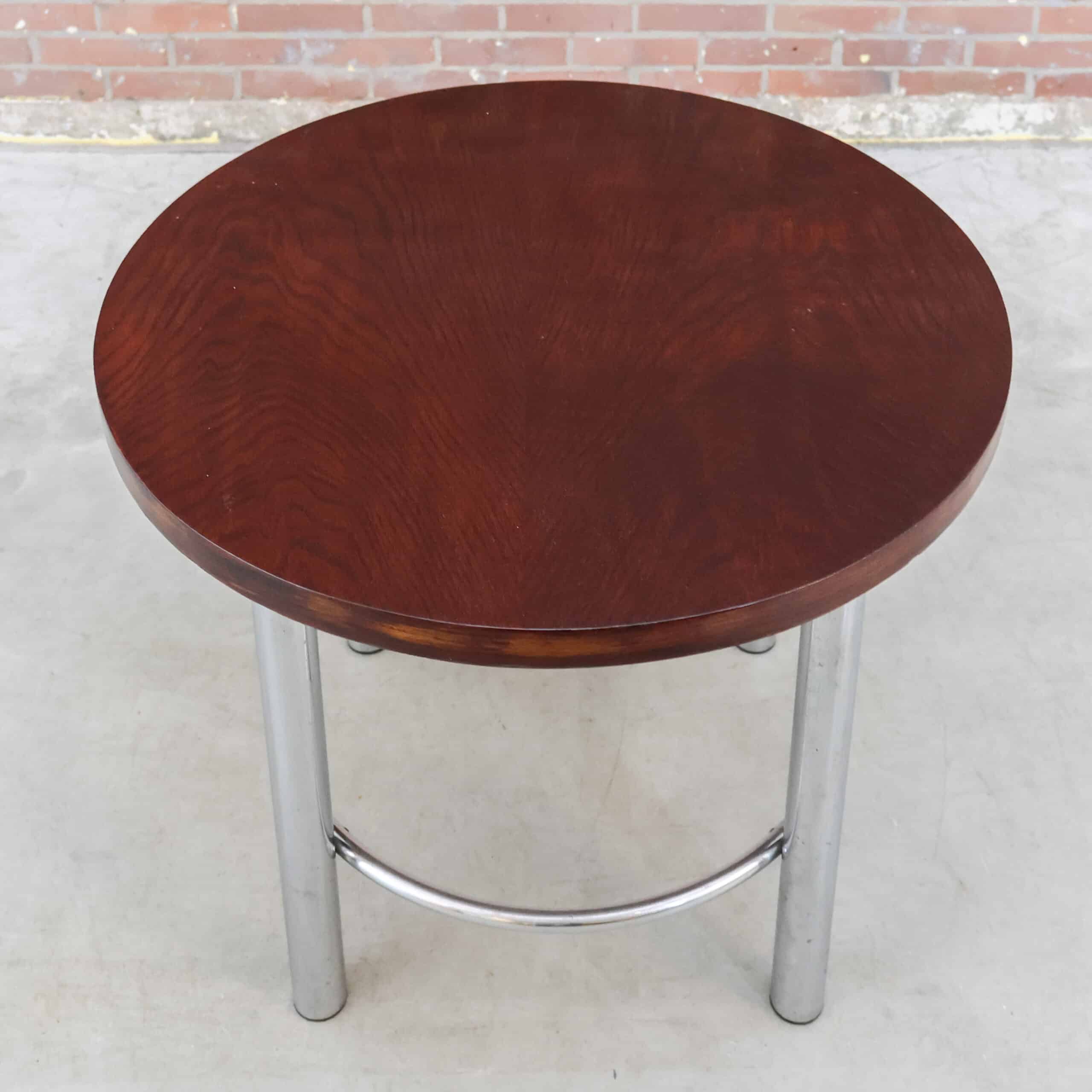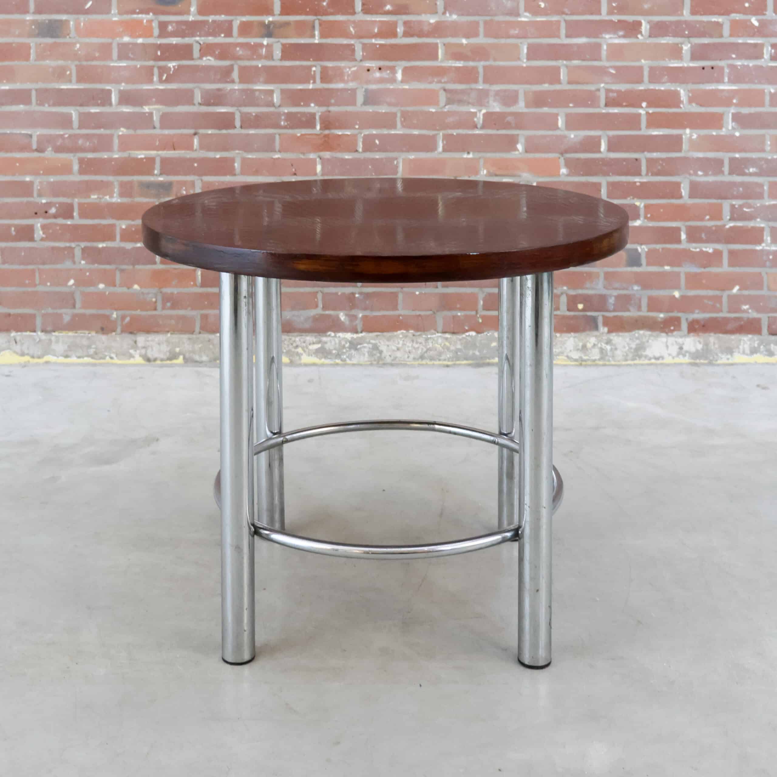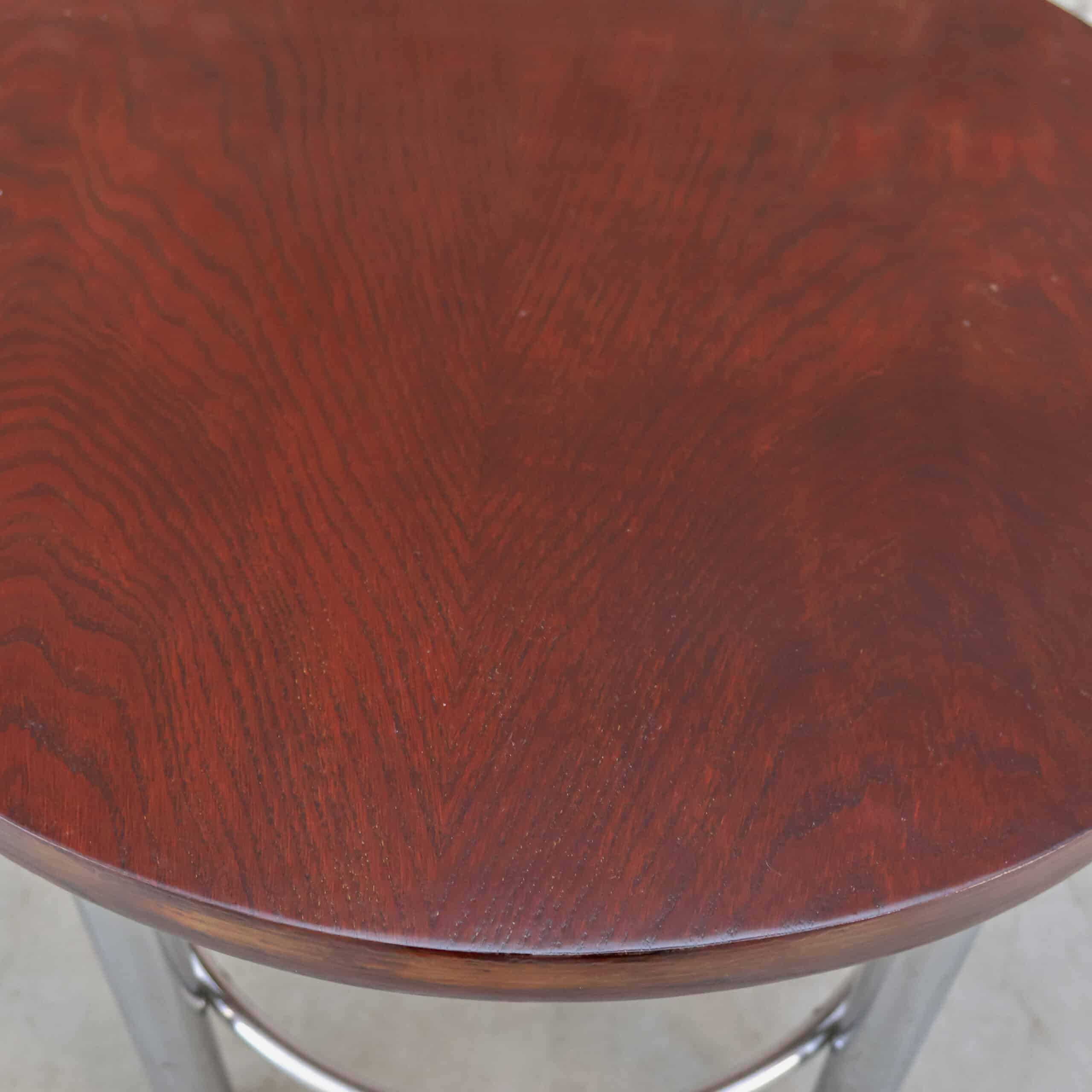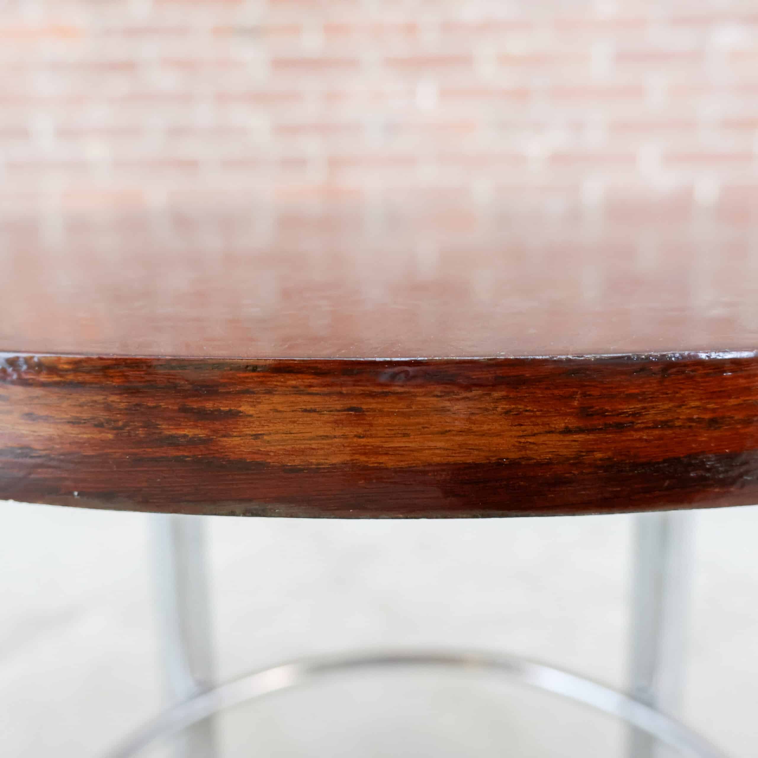 Deze ronde vintage tafel combineert een warm, rijk houtblad met een stoer chromen onderstel. Door het compacte formaat is ze ideaal als bijzettafel, salontafel of stijlvolle plantentafel. De combinatie van het diepe hout en het industriële frame geeft haar een mooi spanningsveld tussen warm en strak.