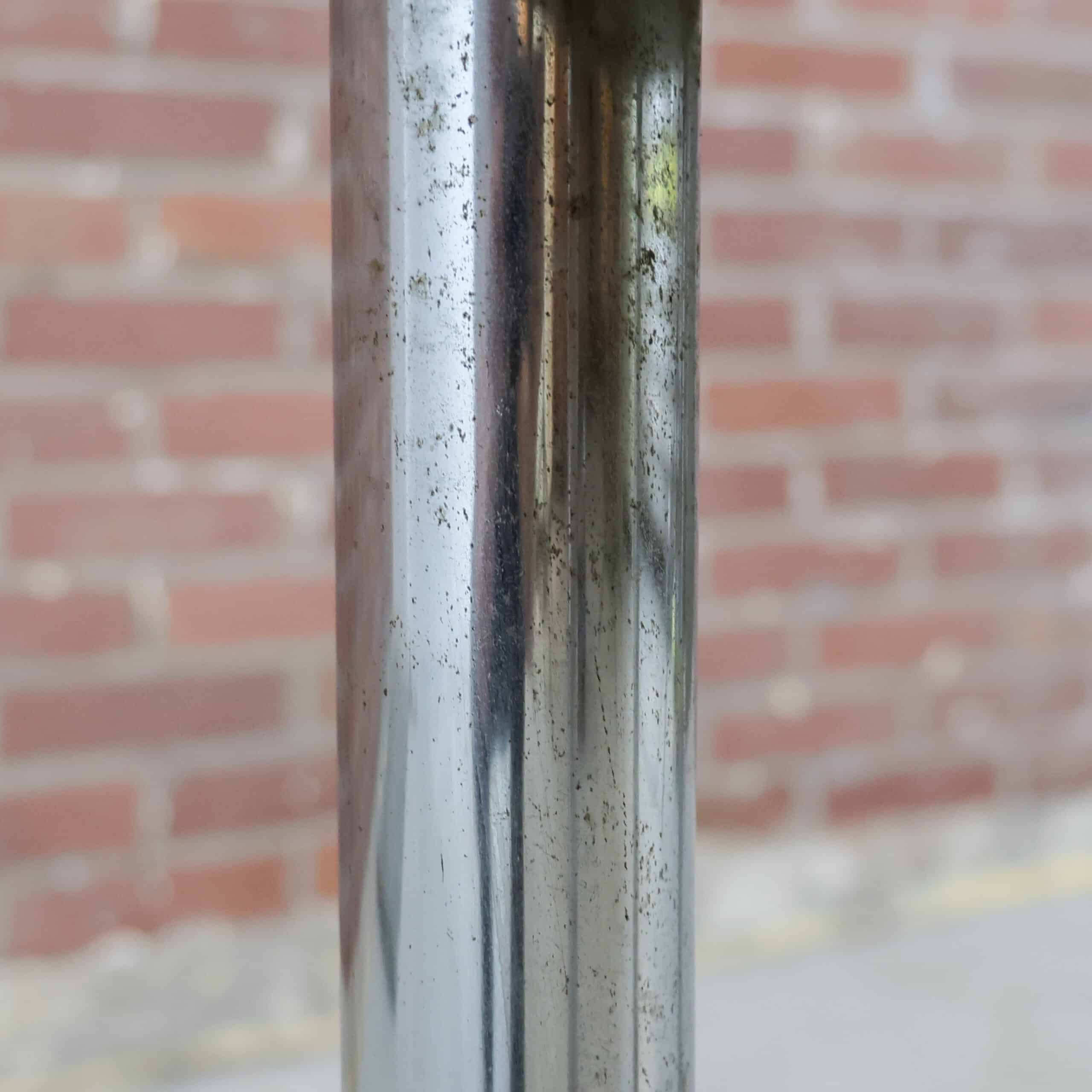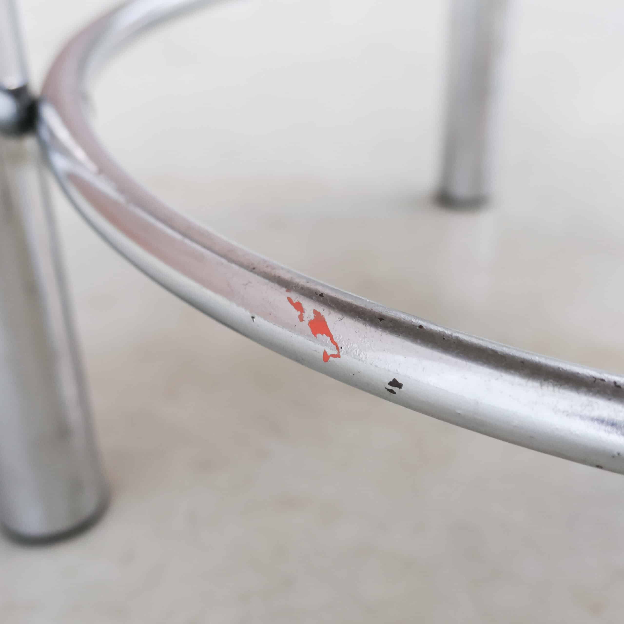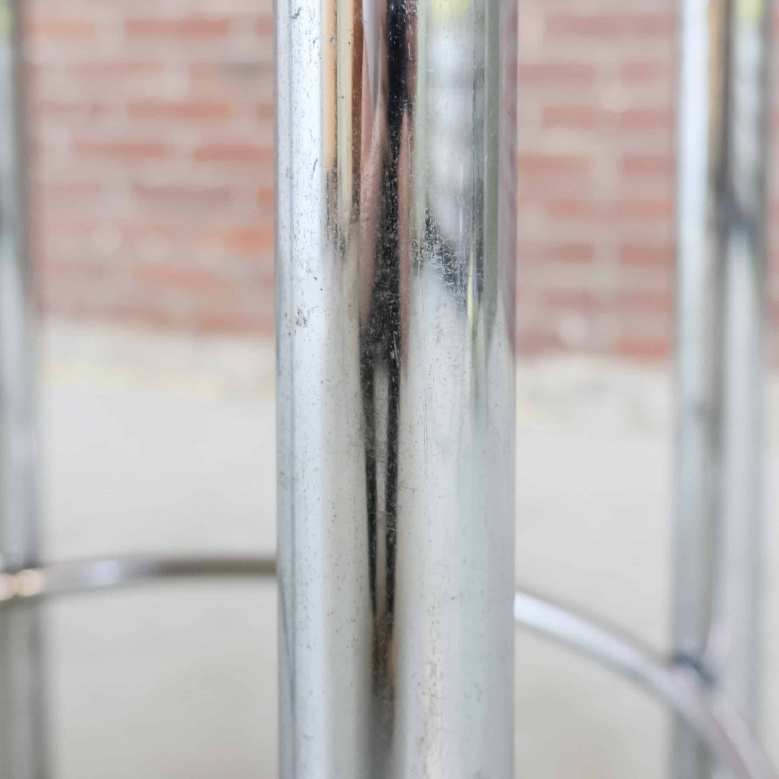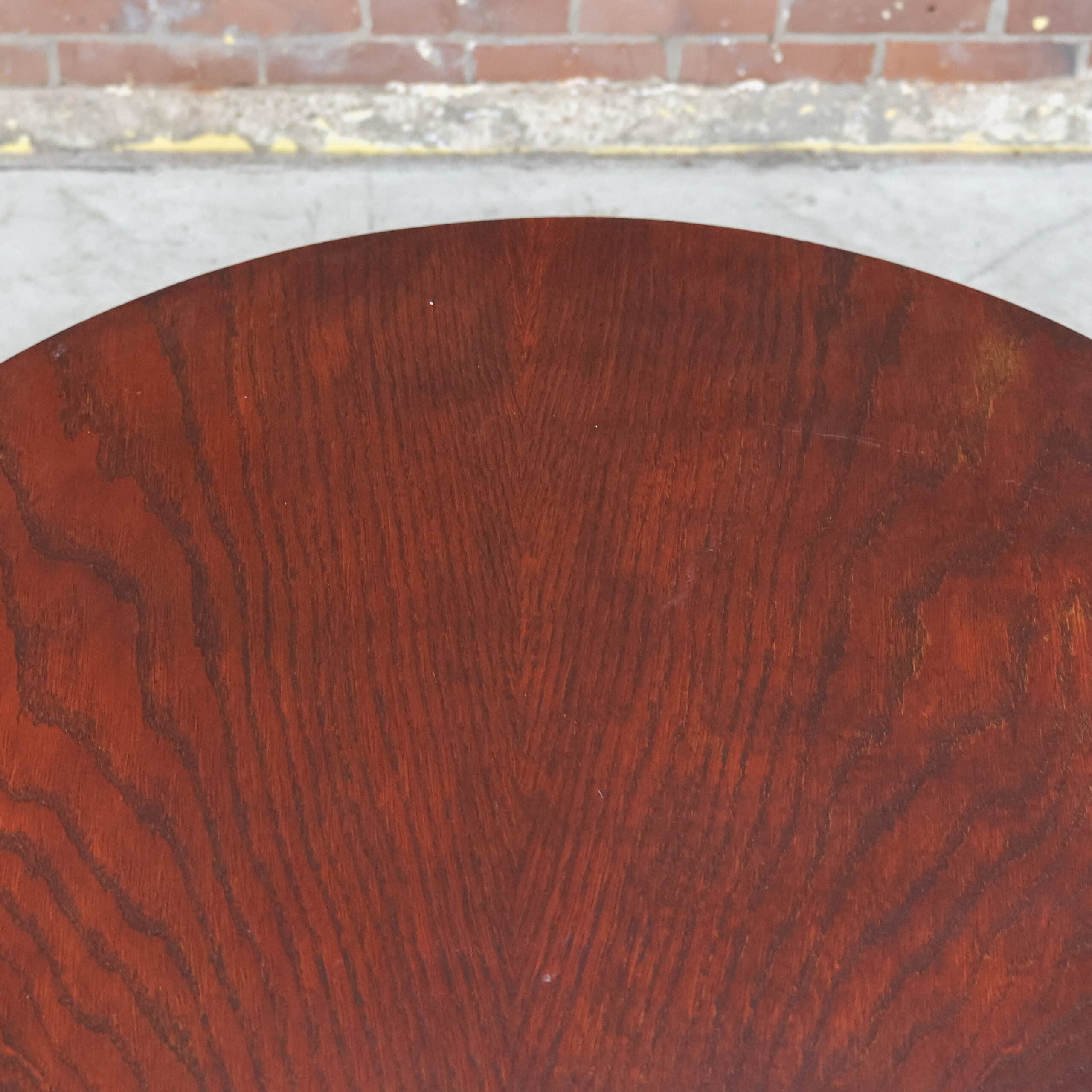 Deze ronde vintage tafel combineert een warm, rijk houtblad met een stoer chromen onderstel. Door het compacte formaat is ze ideaal als bijzettafel, salontafel of stijlvolle plantentafel. De combinatie van het diepe hout en het industriële frame geeft haar een mooi spanningsveld tussen warm en strak.