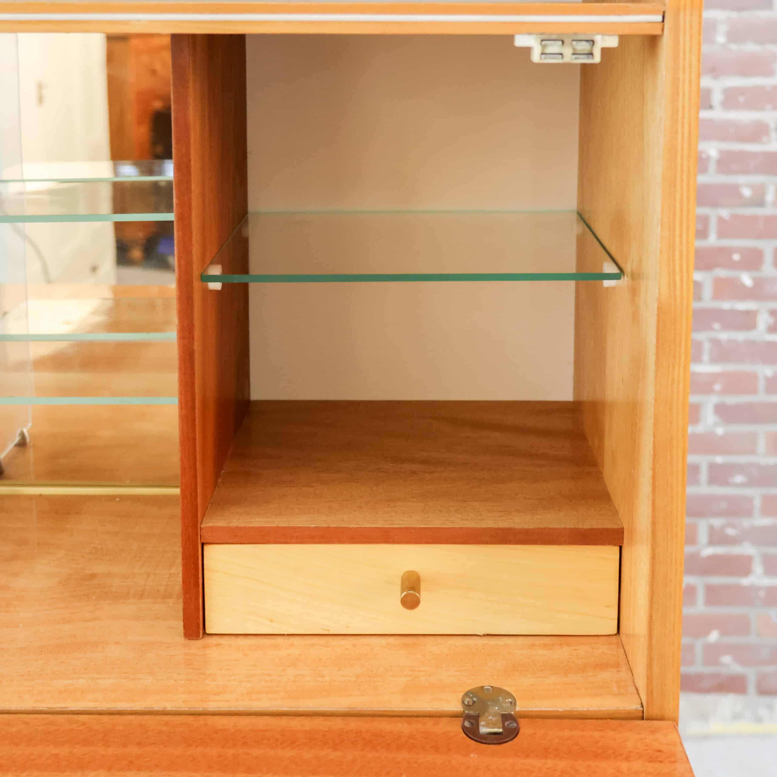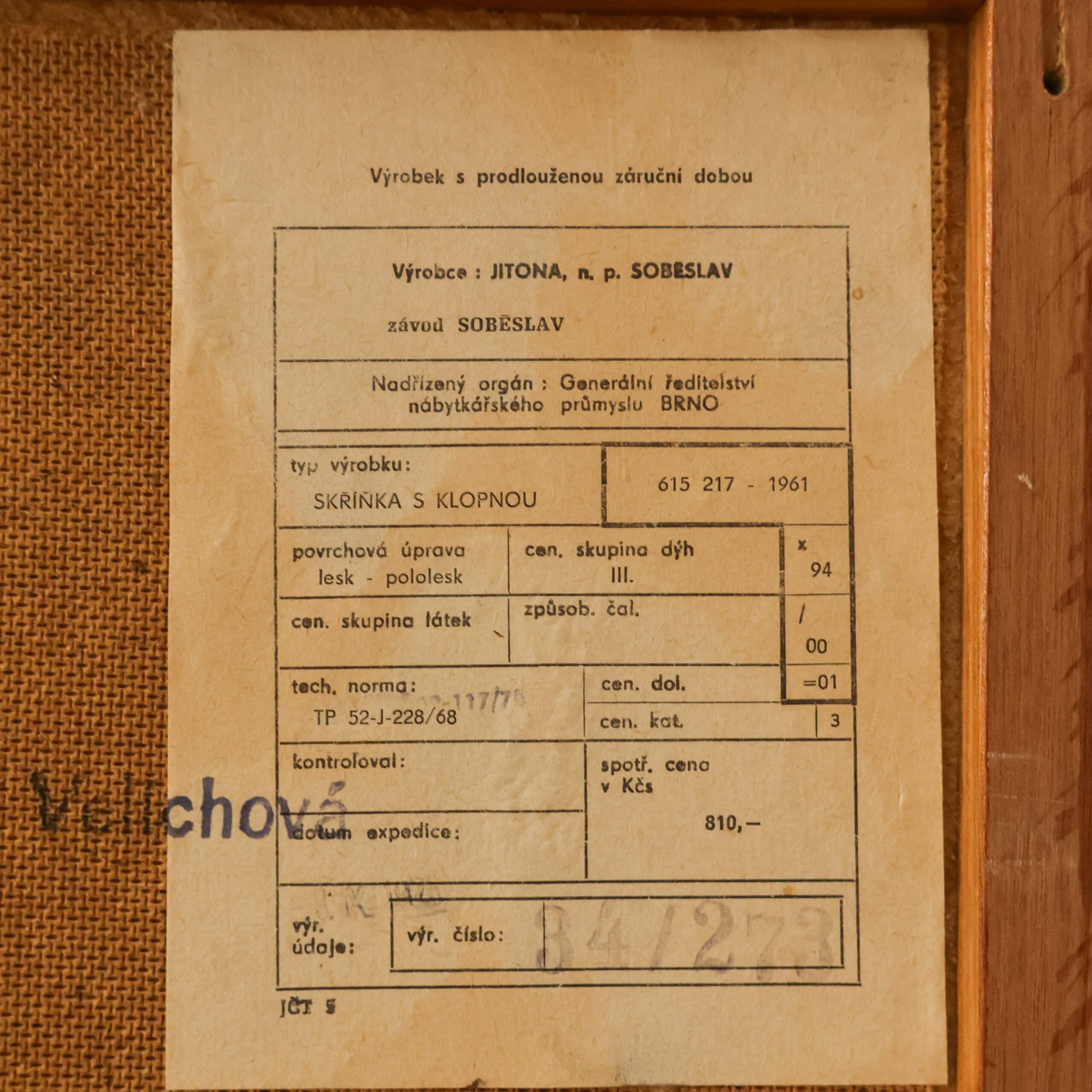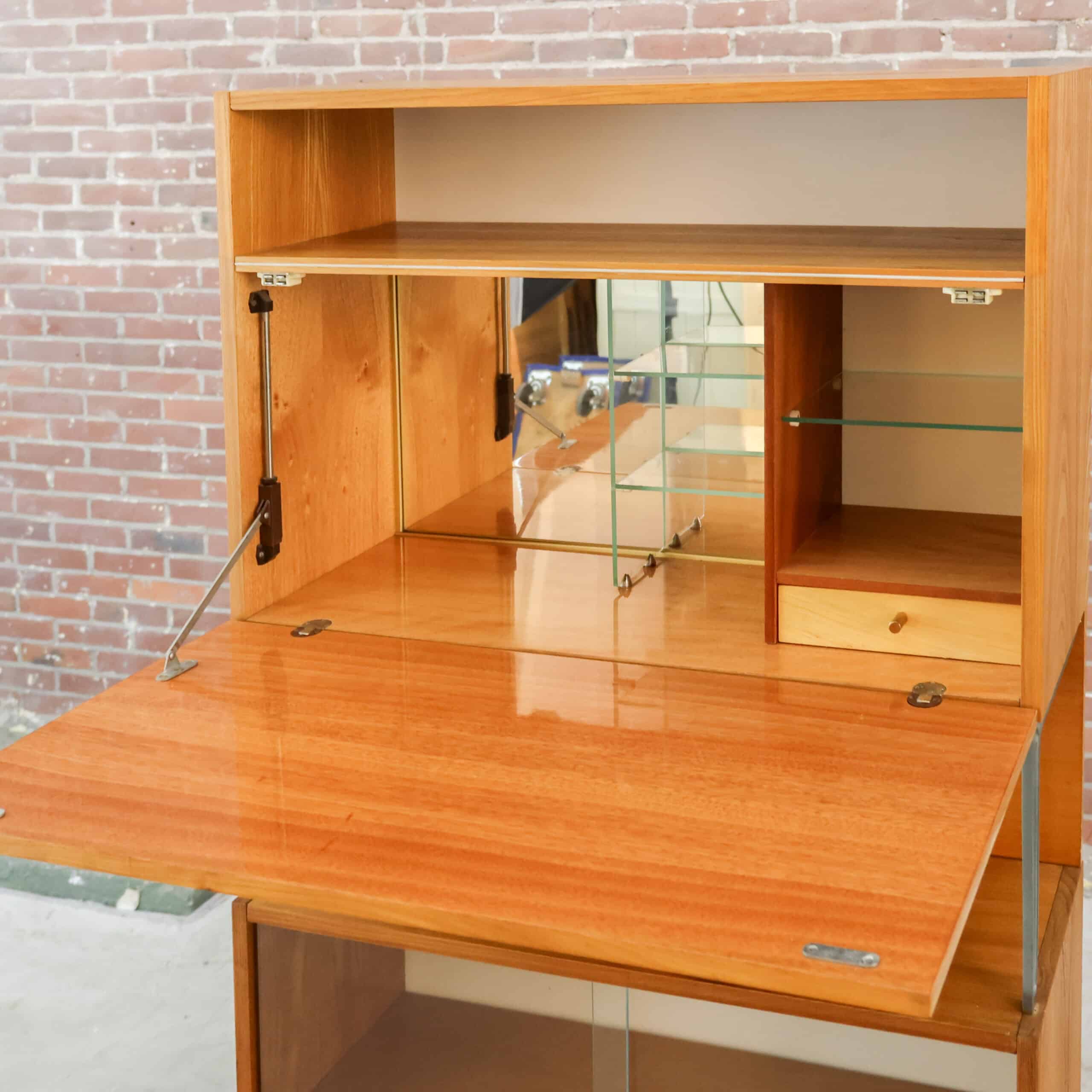 Vintage secretaire van de Tsjechische fabrikant Jitona uit 1961. Achter de klep bevindt zich een verrassend praktisch interieur met vakken en een glazen plankje, ideaal als bureau of barkast. Het warme hout en de slanke zwarte poten geven het meubel een elegante mid-century uitstraling. Een karaktervol designstuk met originele details en authentieke charme.