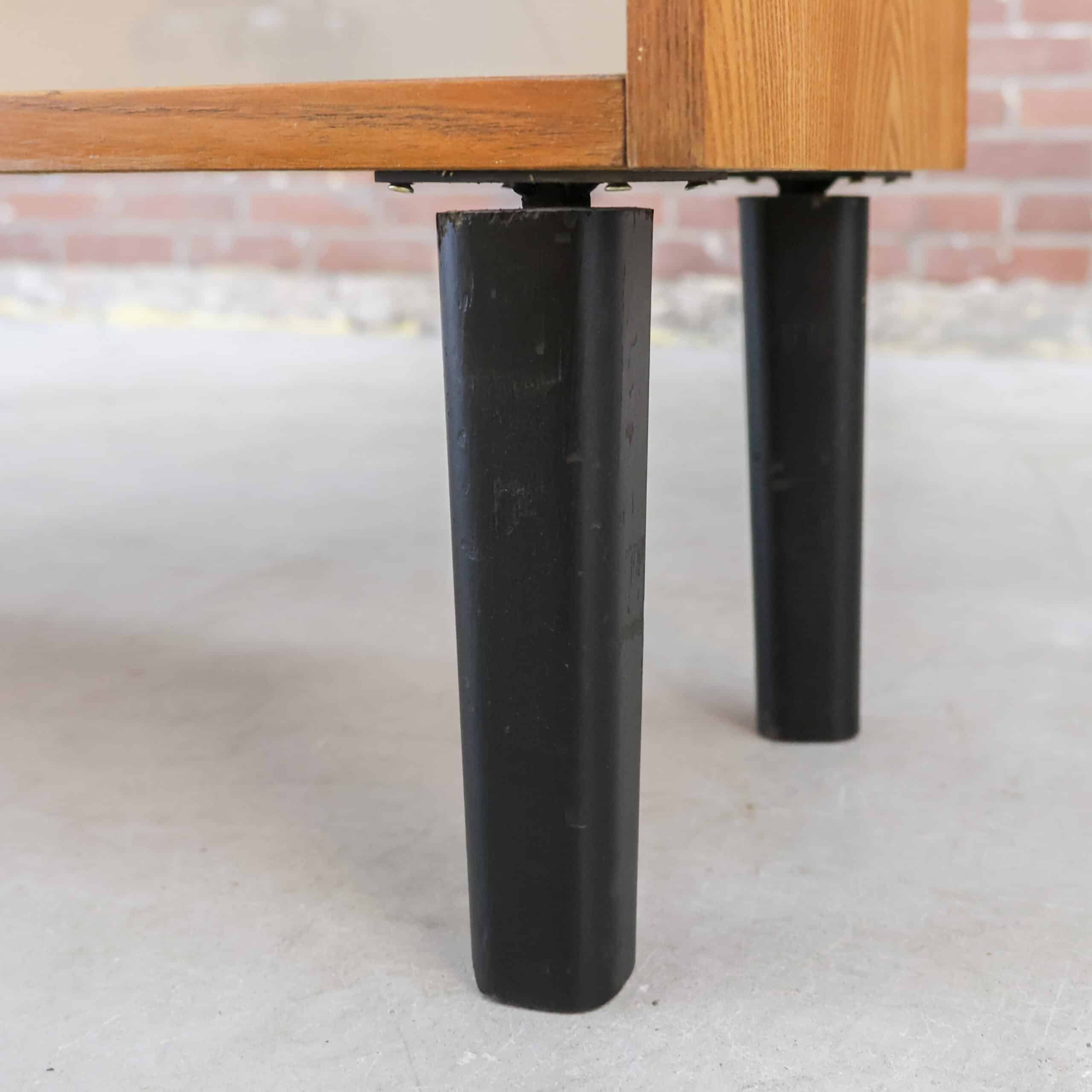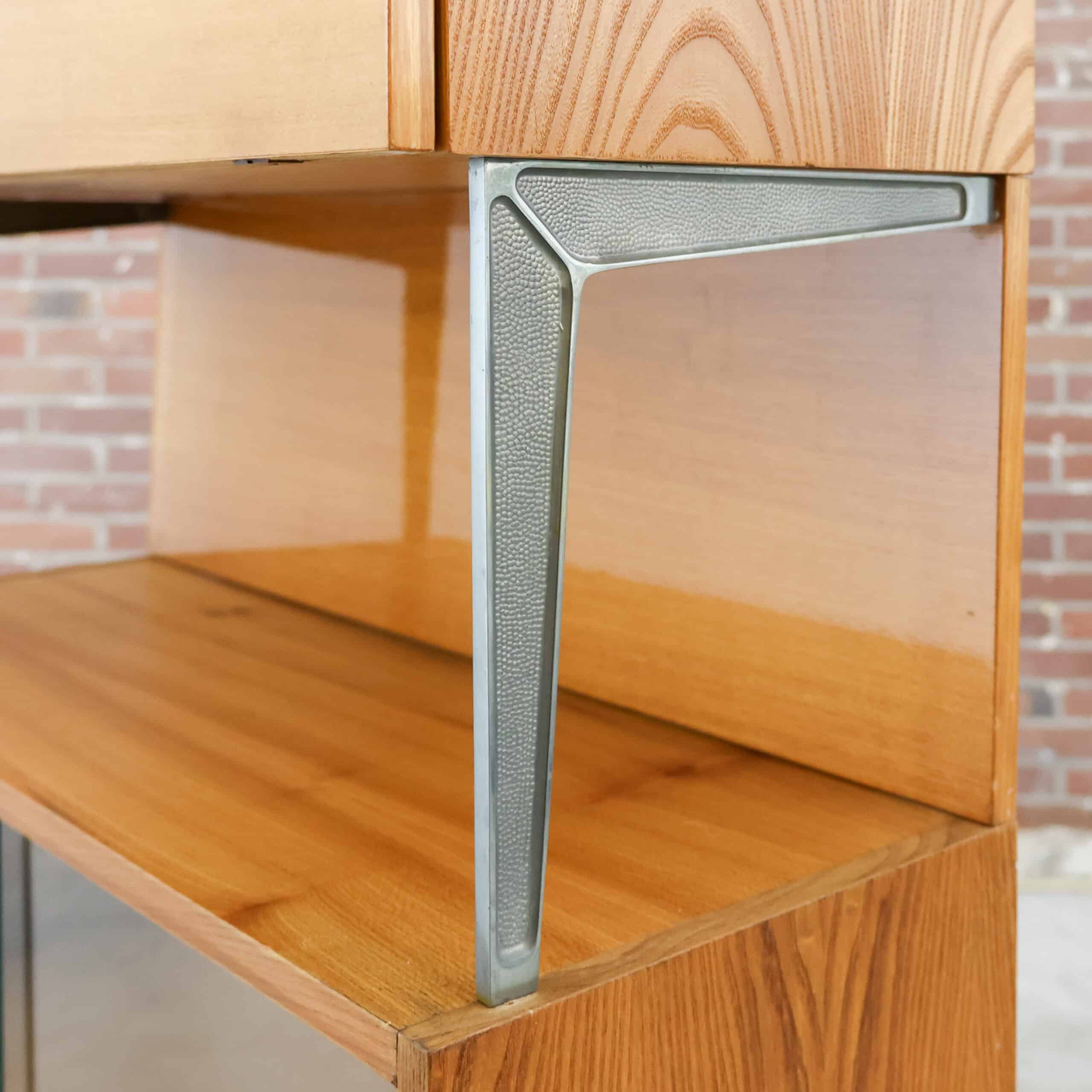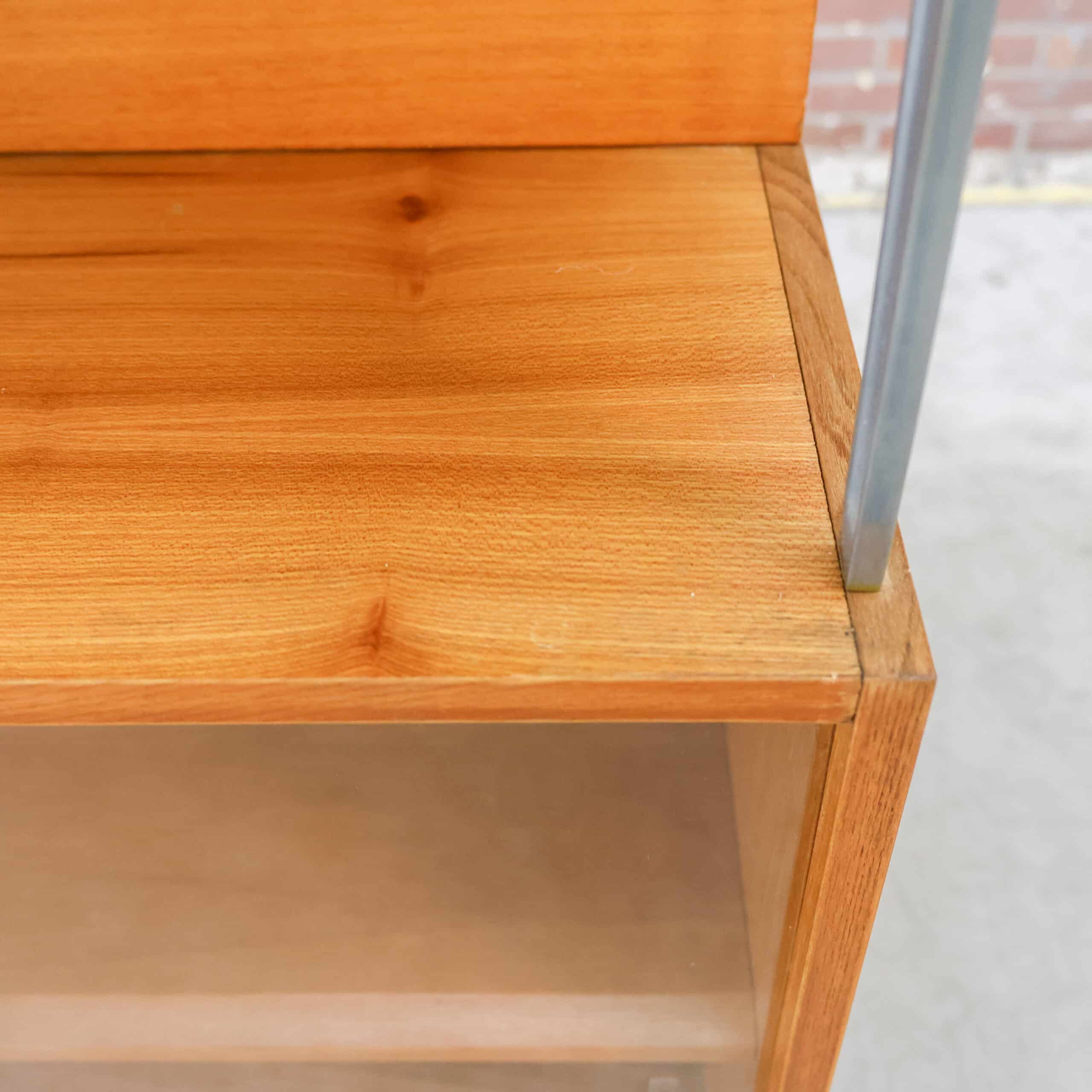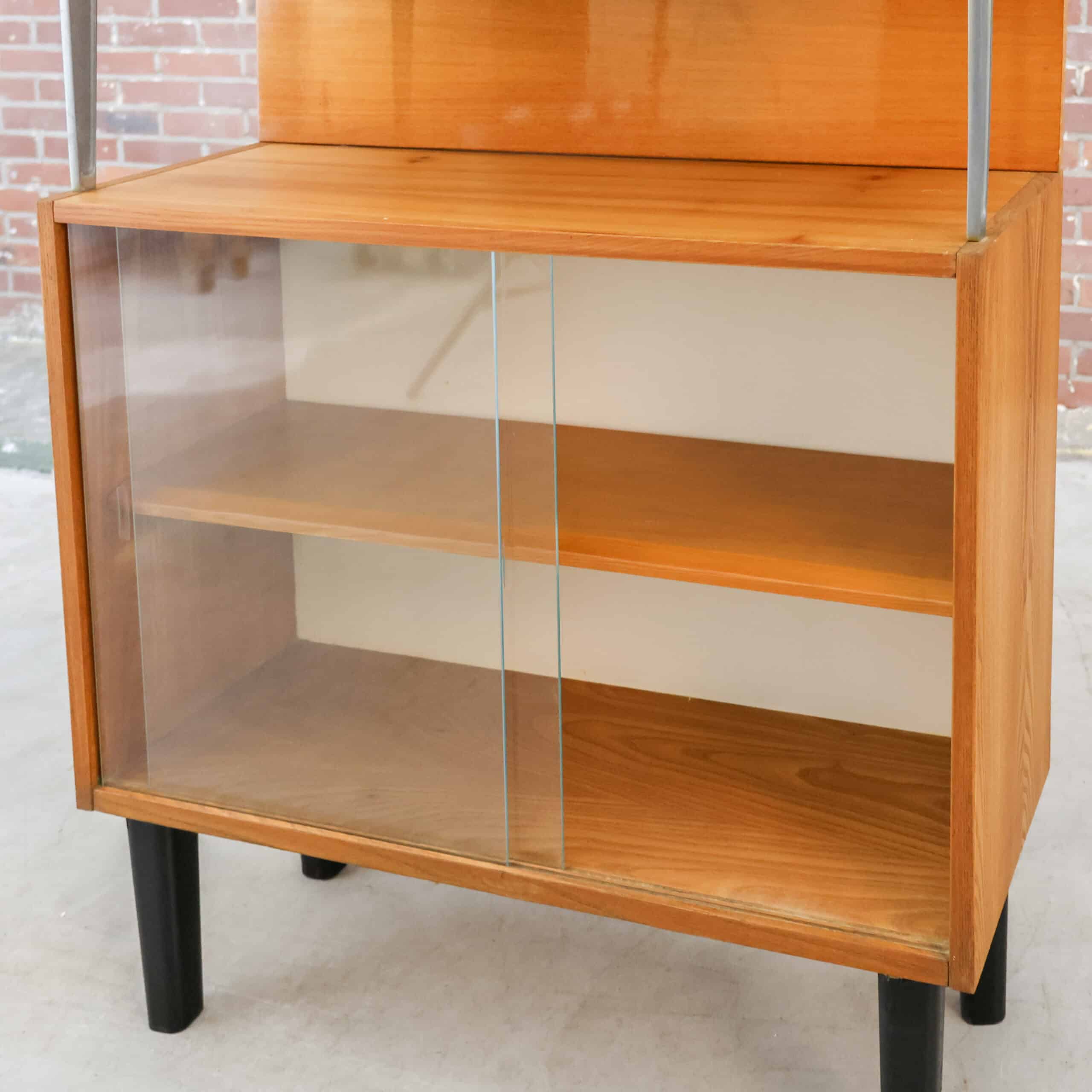 Vintage secretaire van de Tsjechische fabrikant Jitona uit 1961. Achter de klep bevindt zich een verrassend praktisch interieur met vakken en een glazen plankje, ideaal als bureau of barkast. Het warme hout en de slanke zwarte poten geven het meubel een elegante mid-century uitstraling. Een karaktervol designstuk met originele details en authentieke charme.