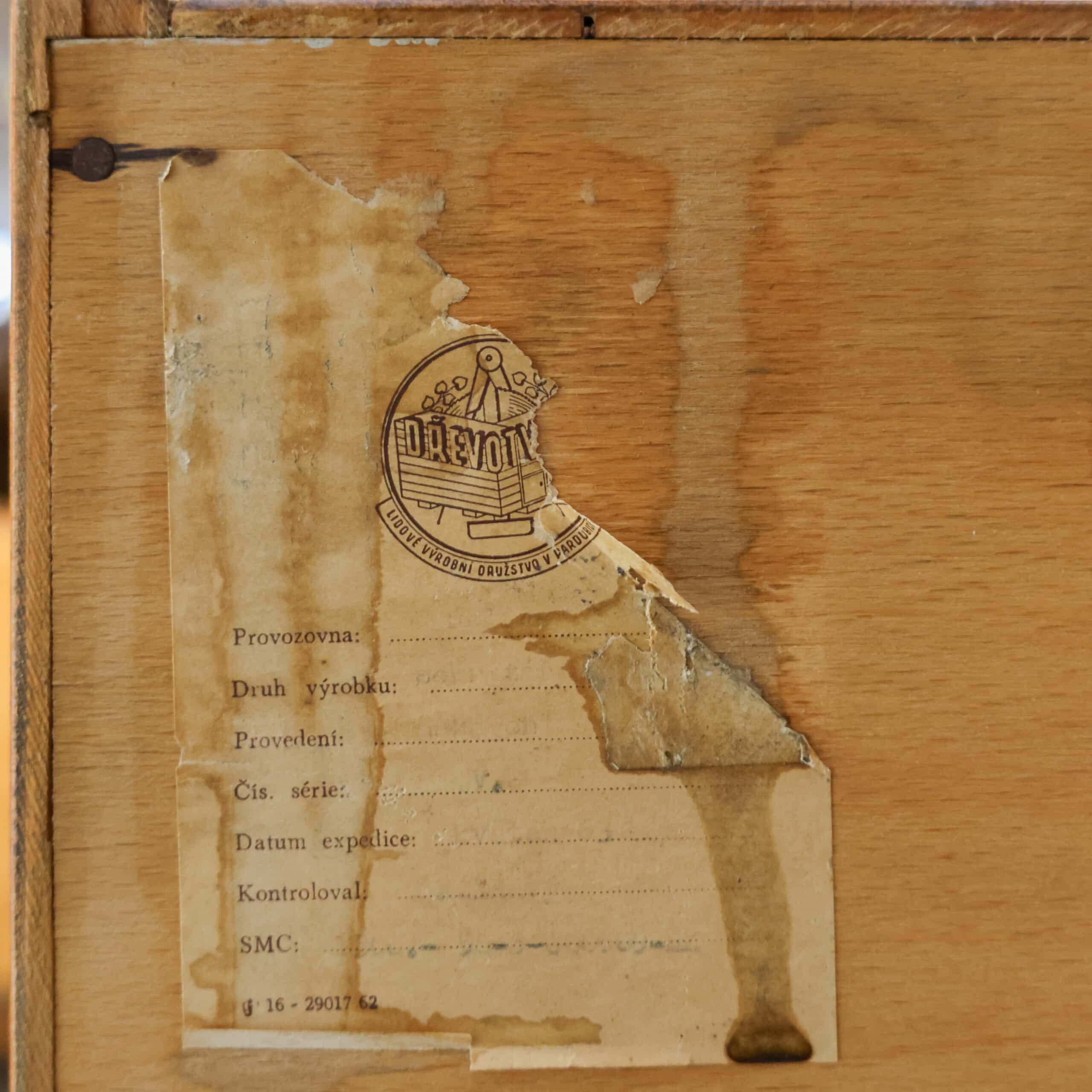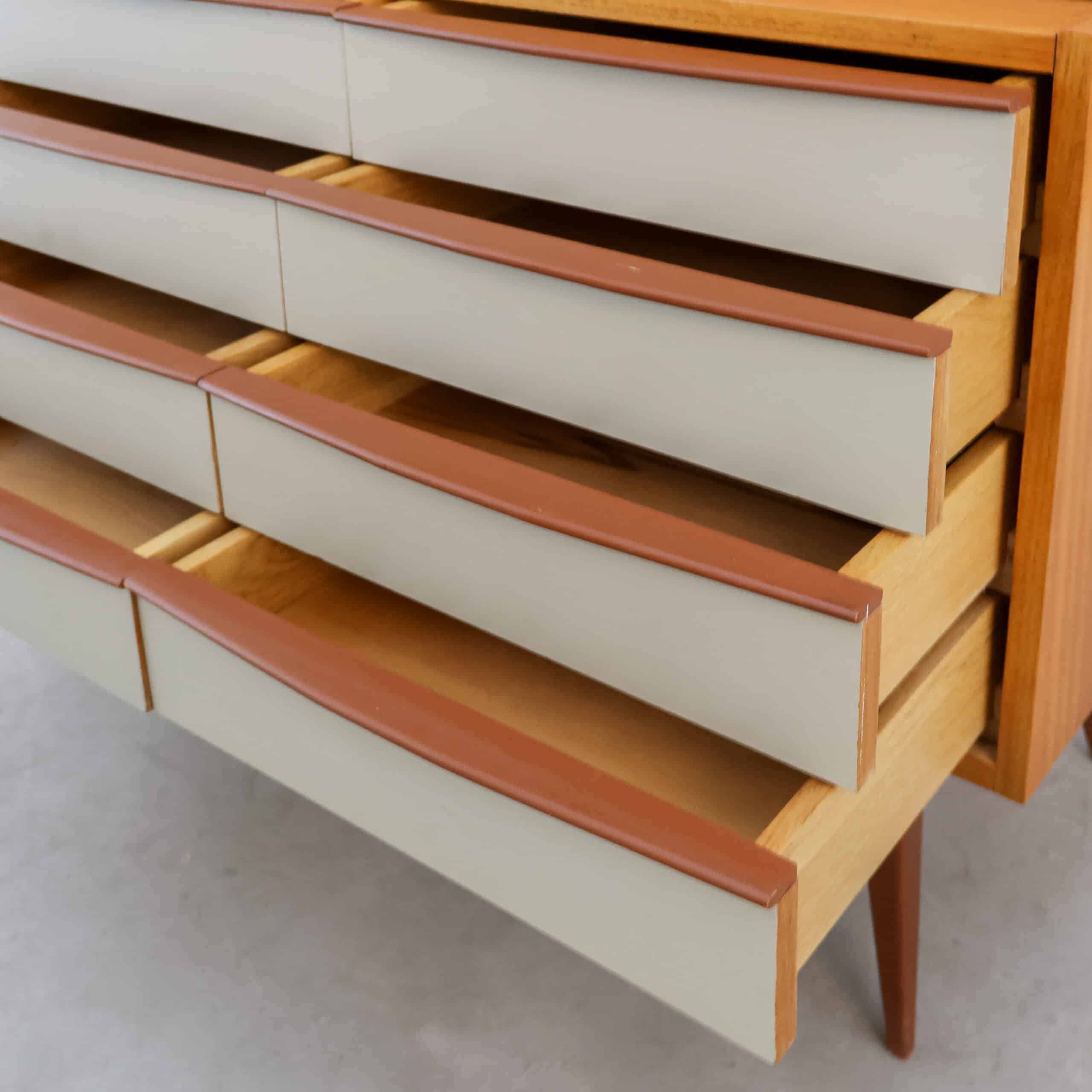 Een stijlvolle vintage mid century secretaire / boekenkast. Geproduceerd door Drevotvar in Tsjechië. Deze kast heeft een functionele indeling met acht lades en diverse opbergvakken. Een fijn opbergmeubel. Hier en daar zitten wat kleine beschadigingen die je mag verwachten van een uit de mid century kast maar verder is ze in een goede vintage staat.