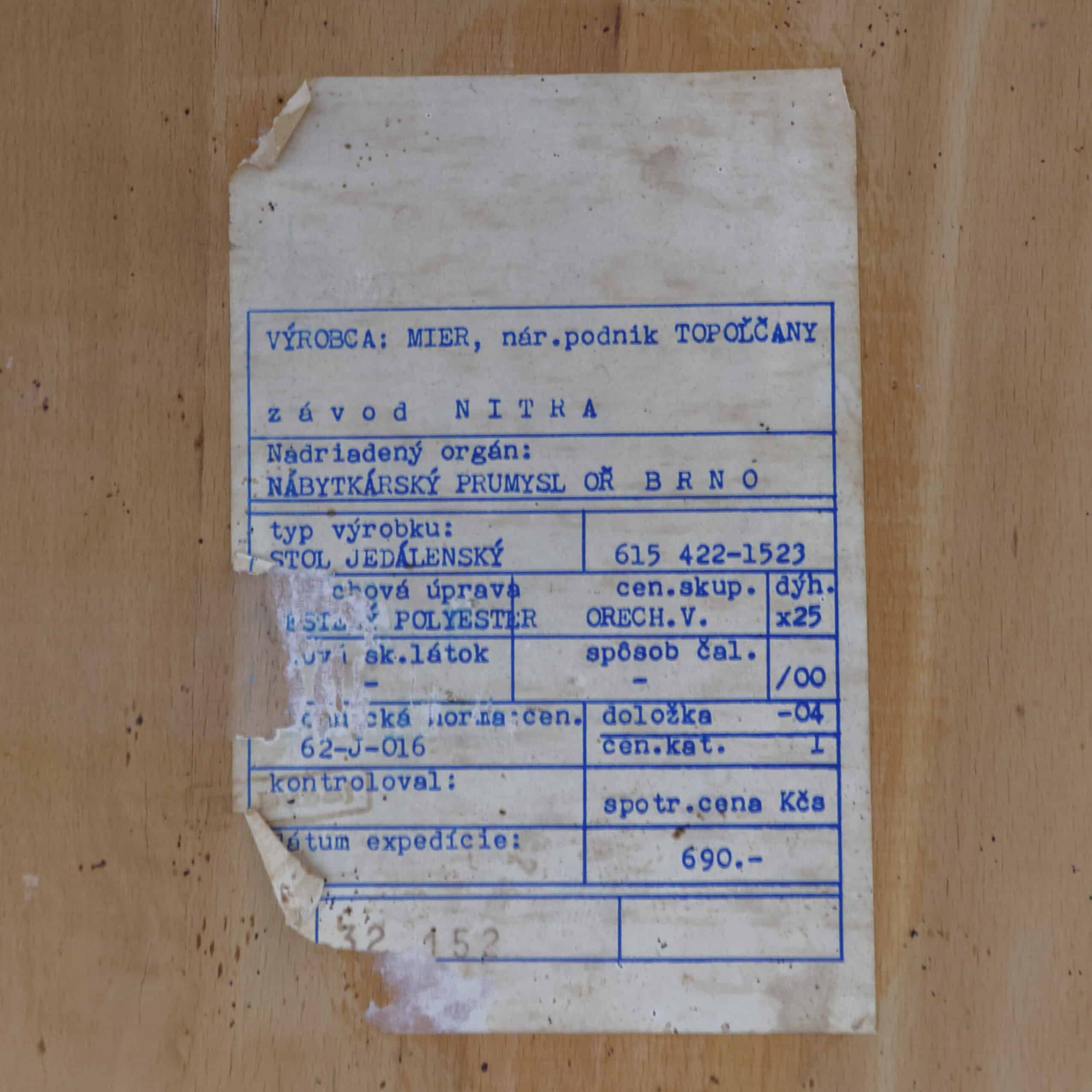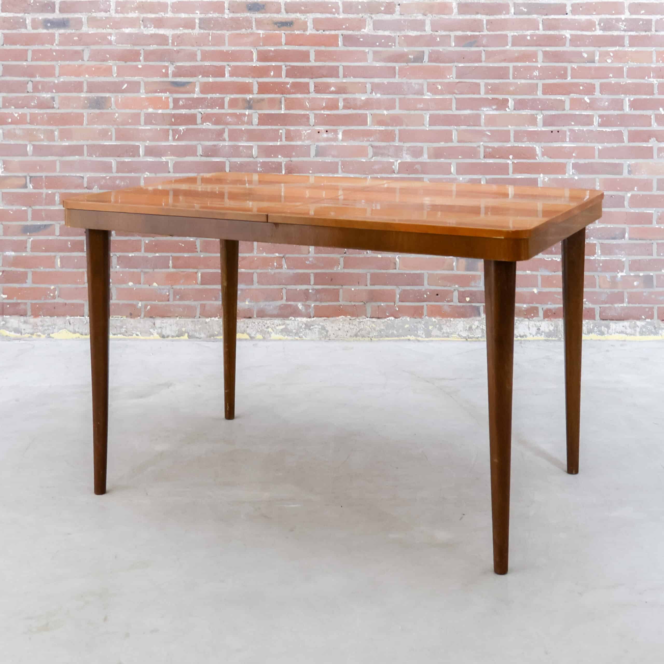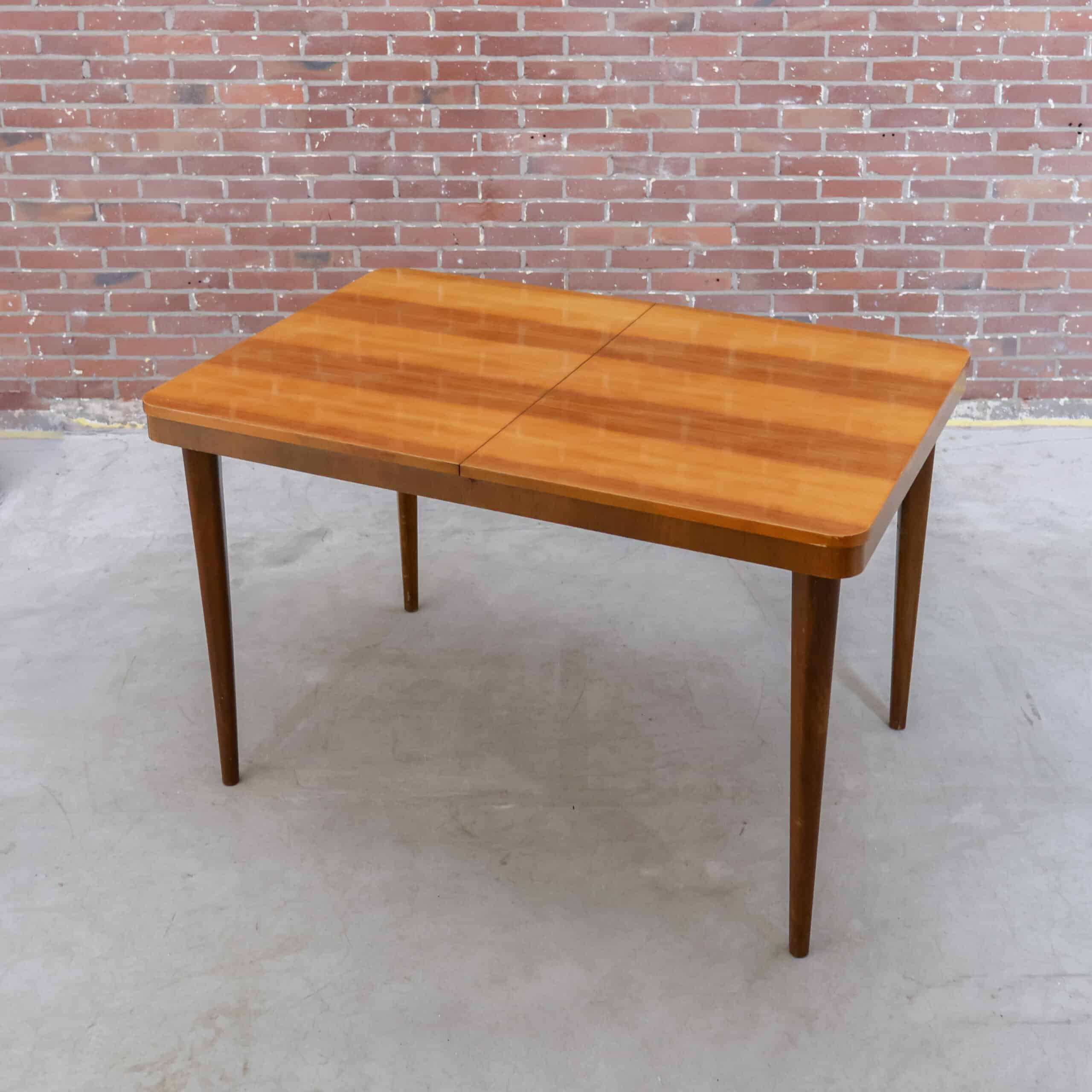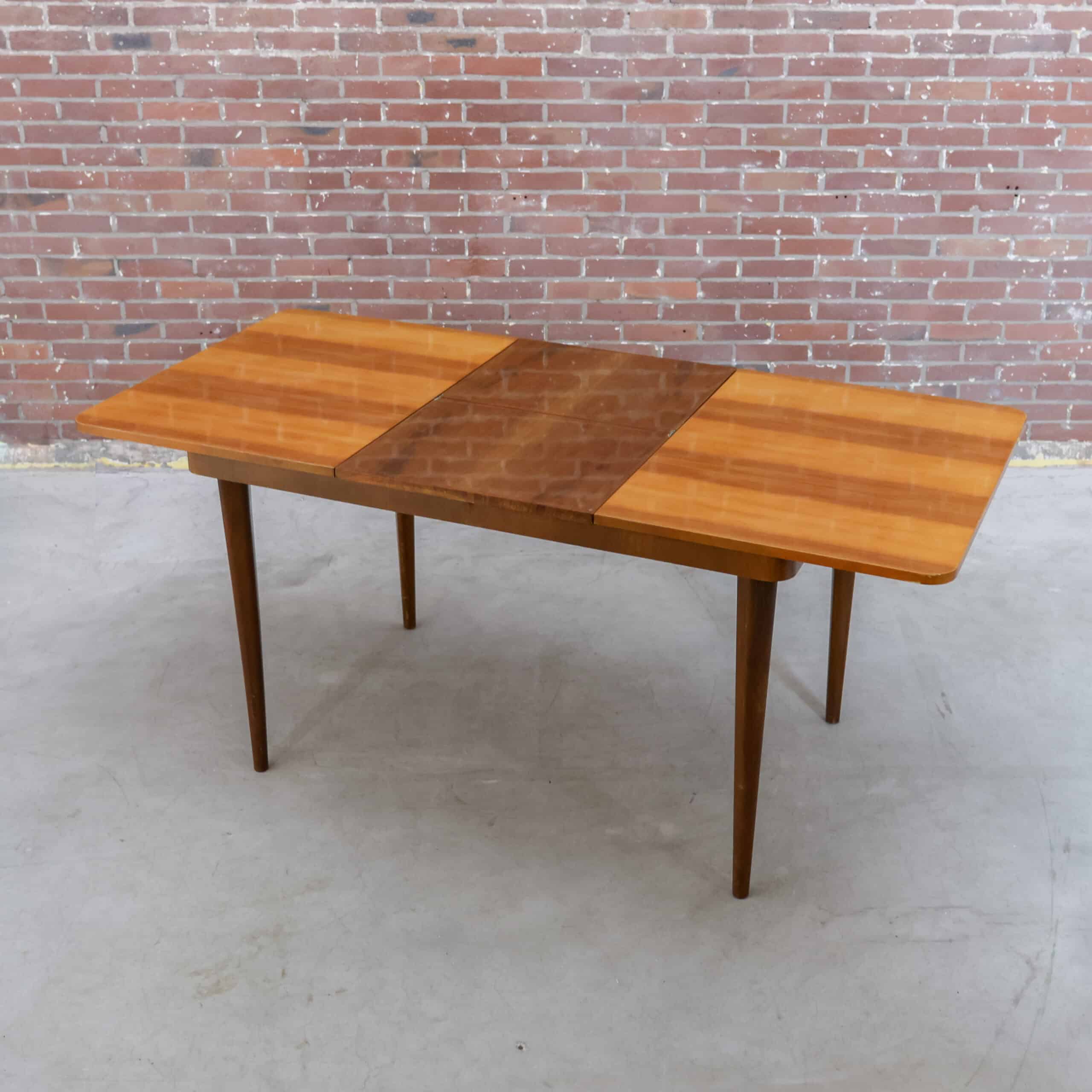Elegante vintage uitschuifbare eettafel uit de jaren 60, vervaardigd door MIER (Tsjechoslowakije) en uitgevoerd in warm houtfineer. Het slanke blad met afgeronde hoeken en de taps toelopende poten geven de tafel een luchtige mid-century uitstraling. Dankzij het uitschuifsysteem is de tafel zowel compact als ruim inzetbaar. Inclusief origineel fabriekslabel, met lichte gebruikssporen passend bij de leeftijd.