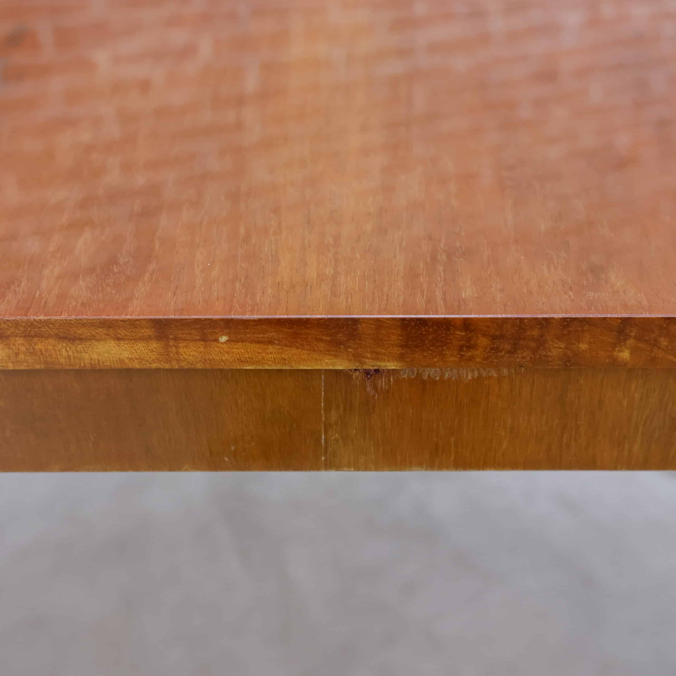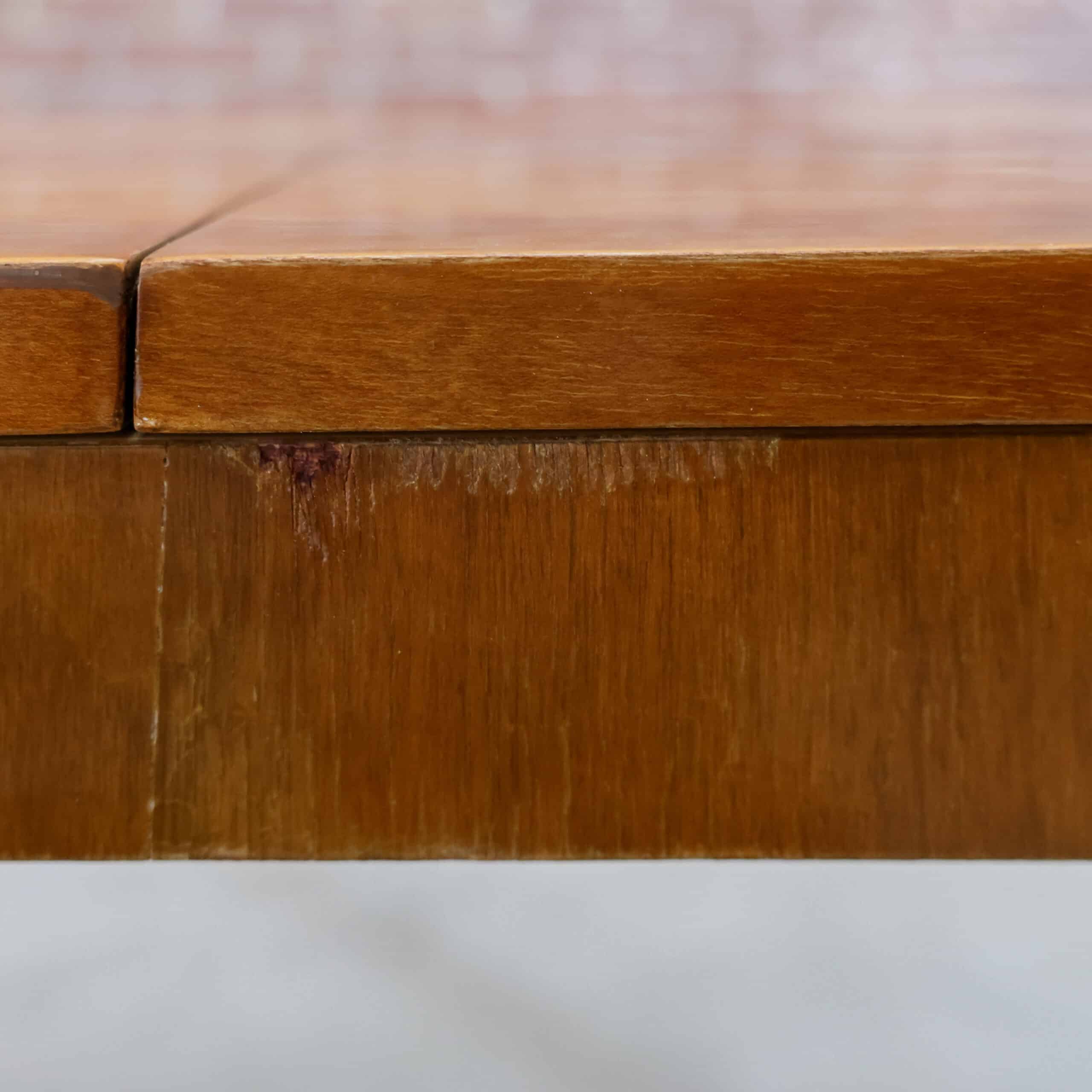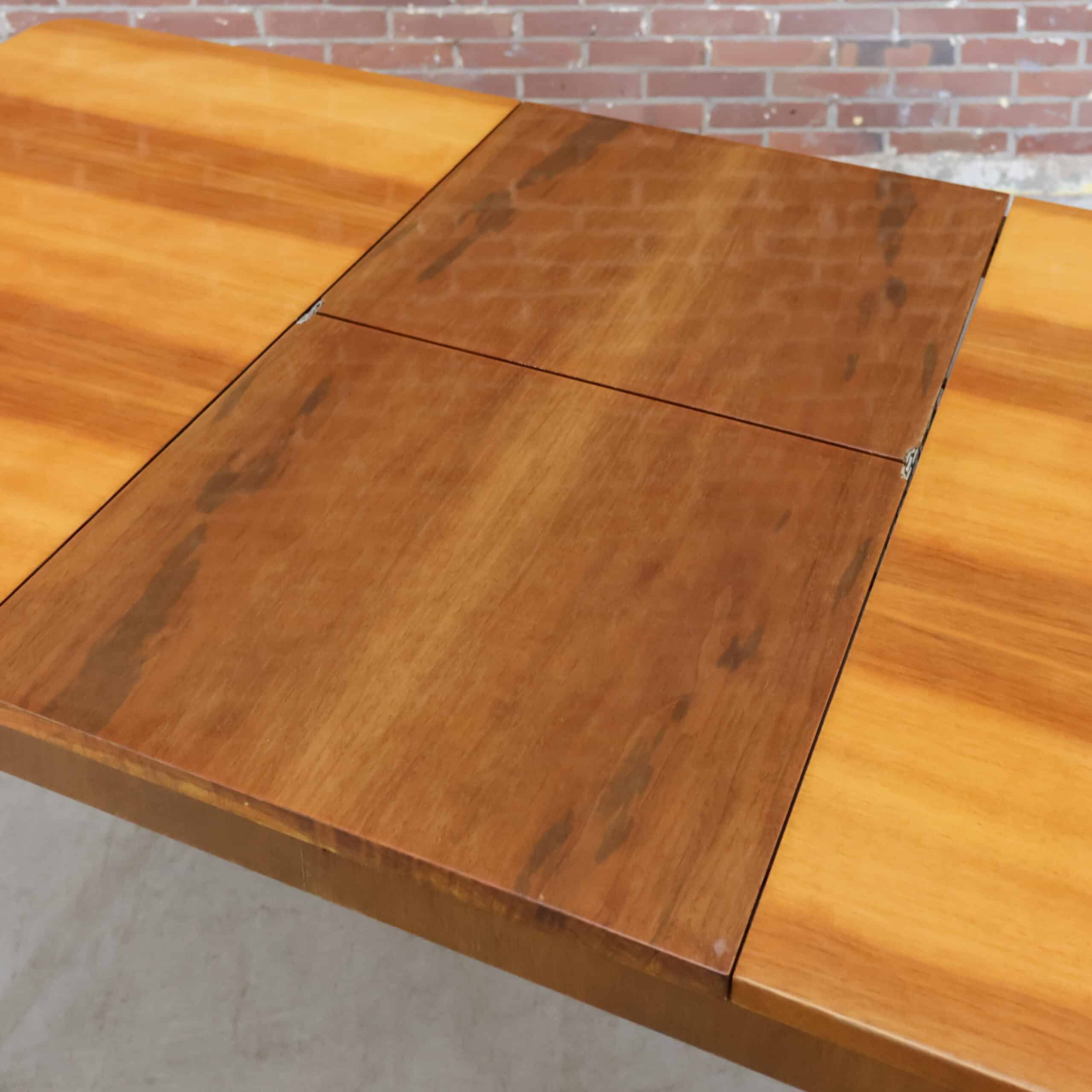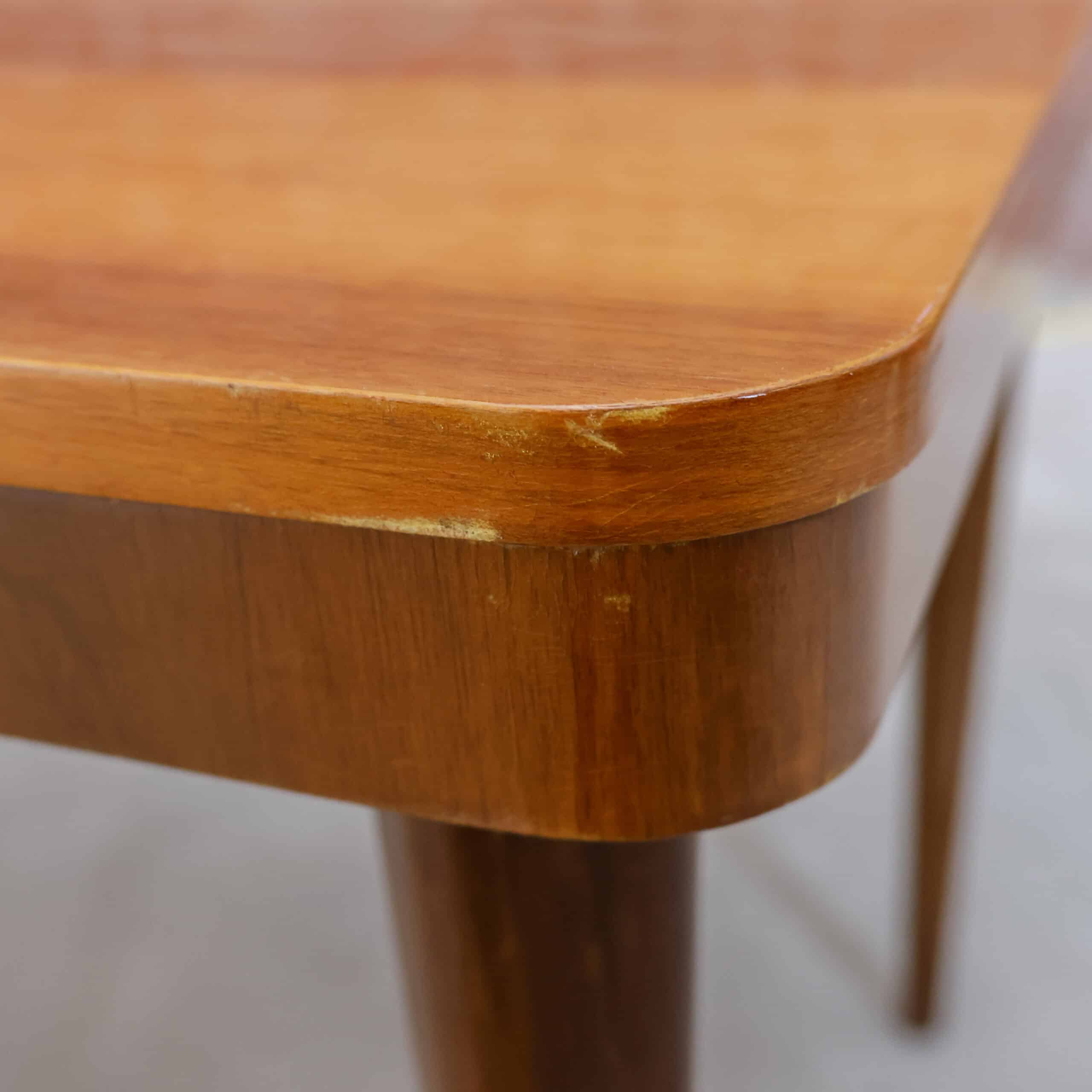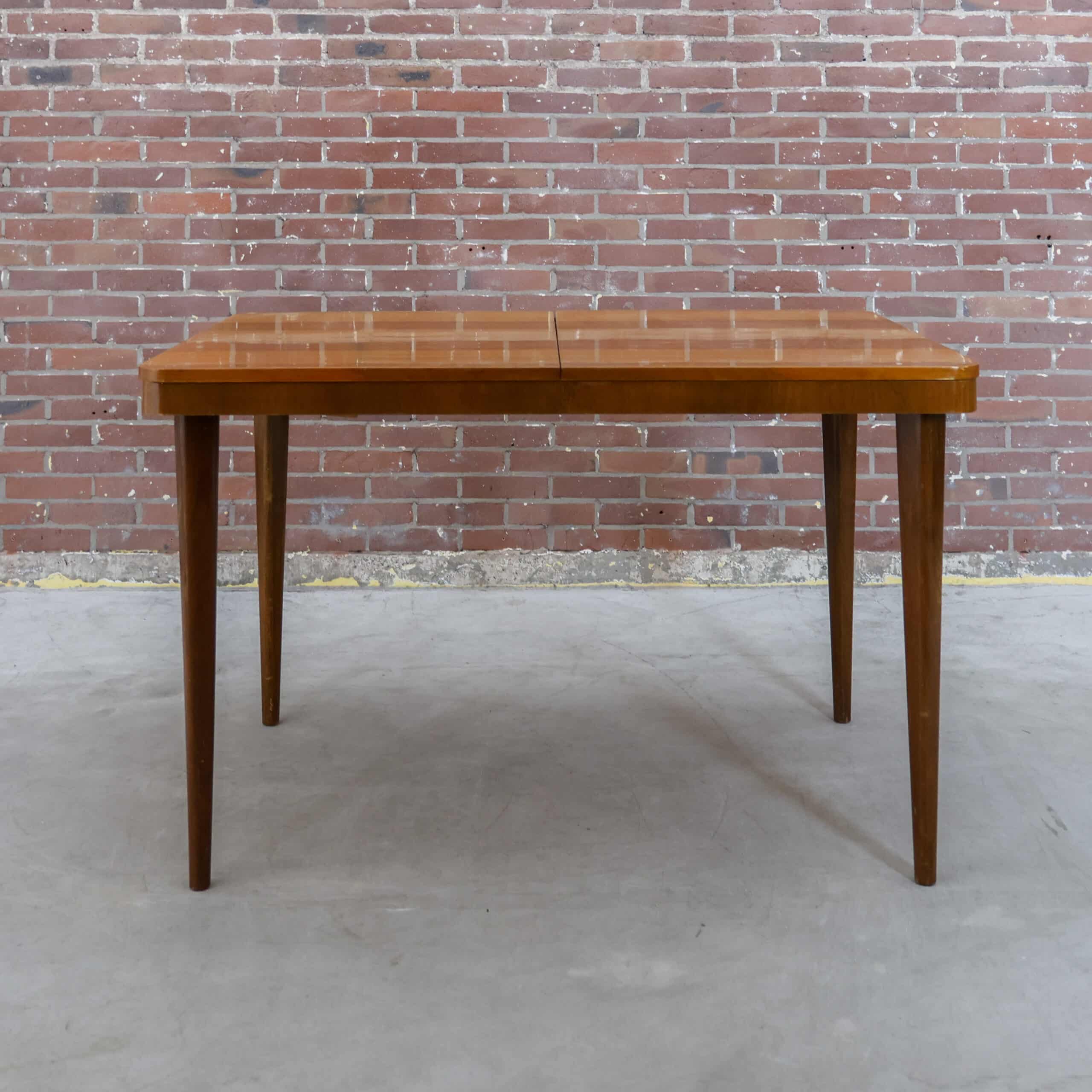 Elegante vintage uitschuifbare eettafel uit de jaren 60, vervaardigd door MIER (Tsjechoslowakije) en uitgevoerd in warm houtfineer. Het slanke blad met afgeronde hoeken en de taps toelopende poten geven de tafel een luchtige mid-century uitstraling. Dankzij het uitschuifsysteem is de tafel zowel compact als ruim inzetbaar. Inclusief origineel fabriekslabel, met lichte gebruikssporen passend bij de leeftijd.