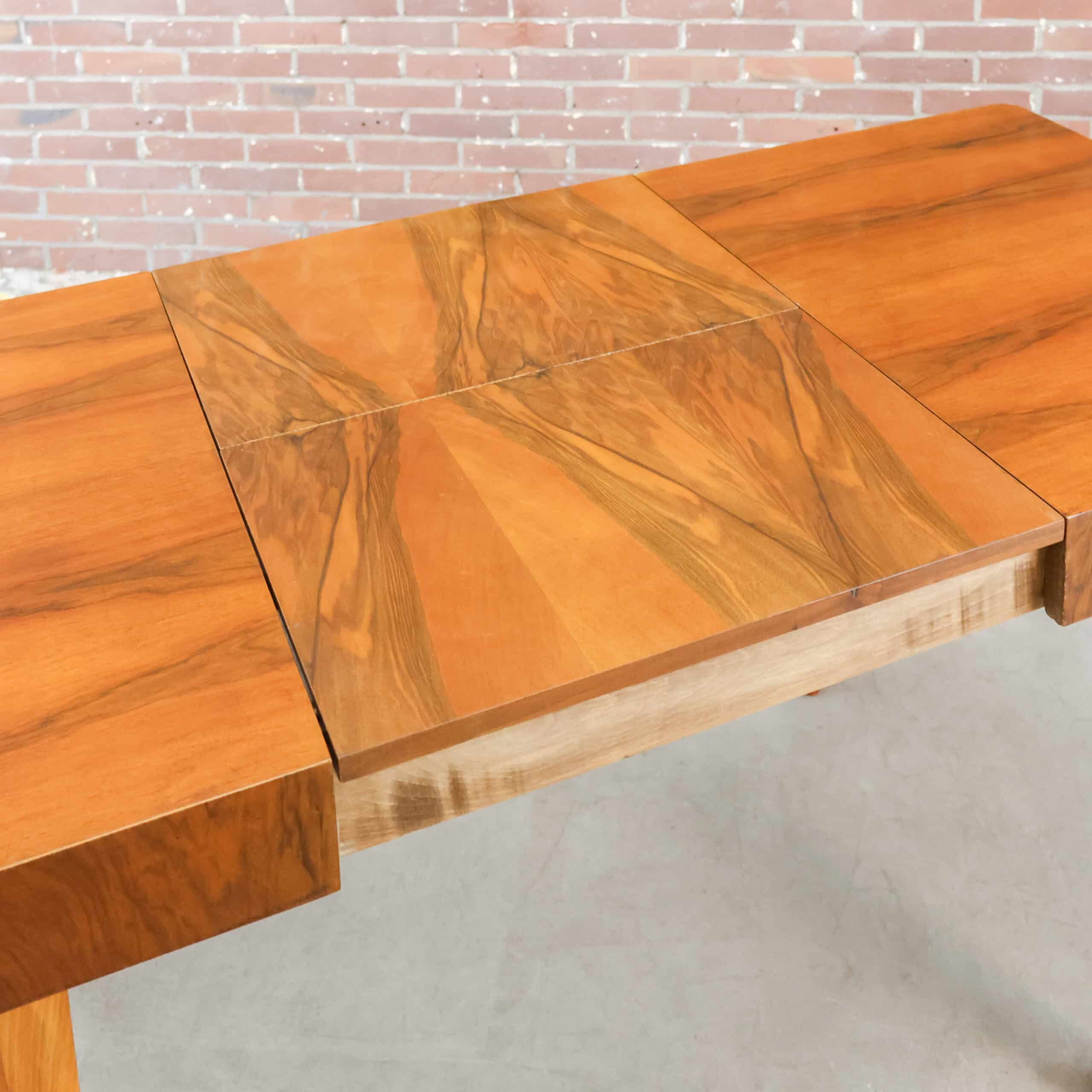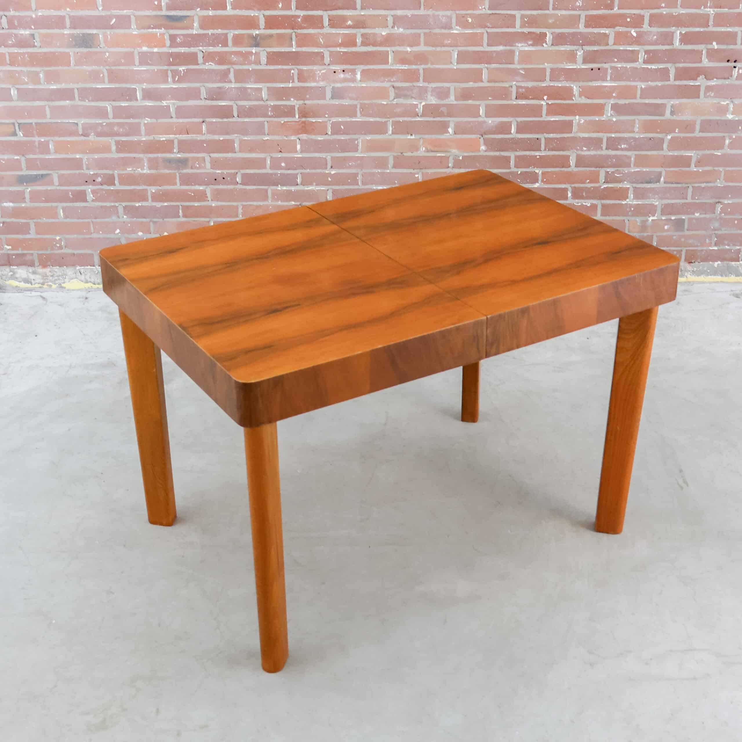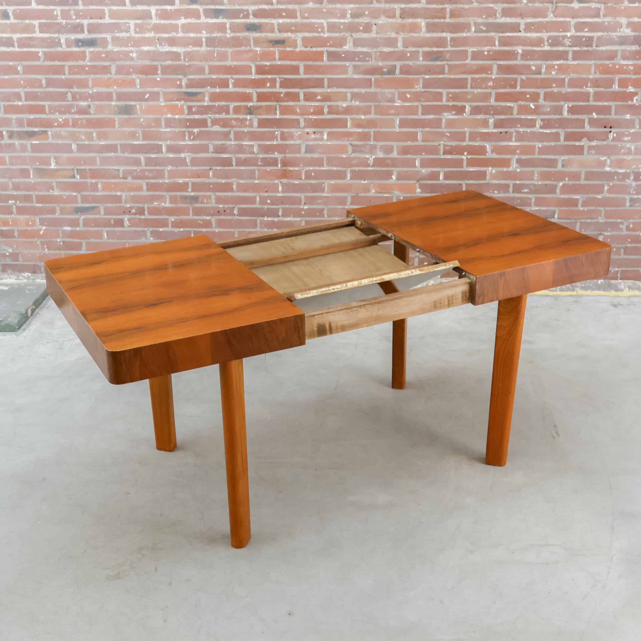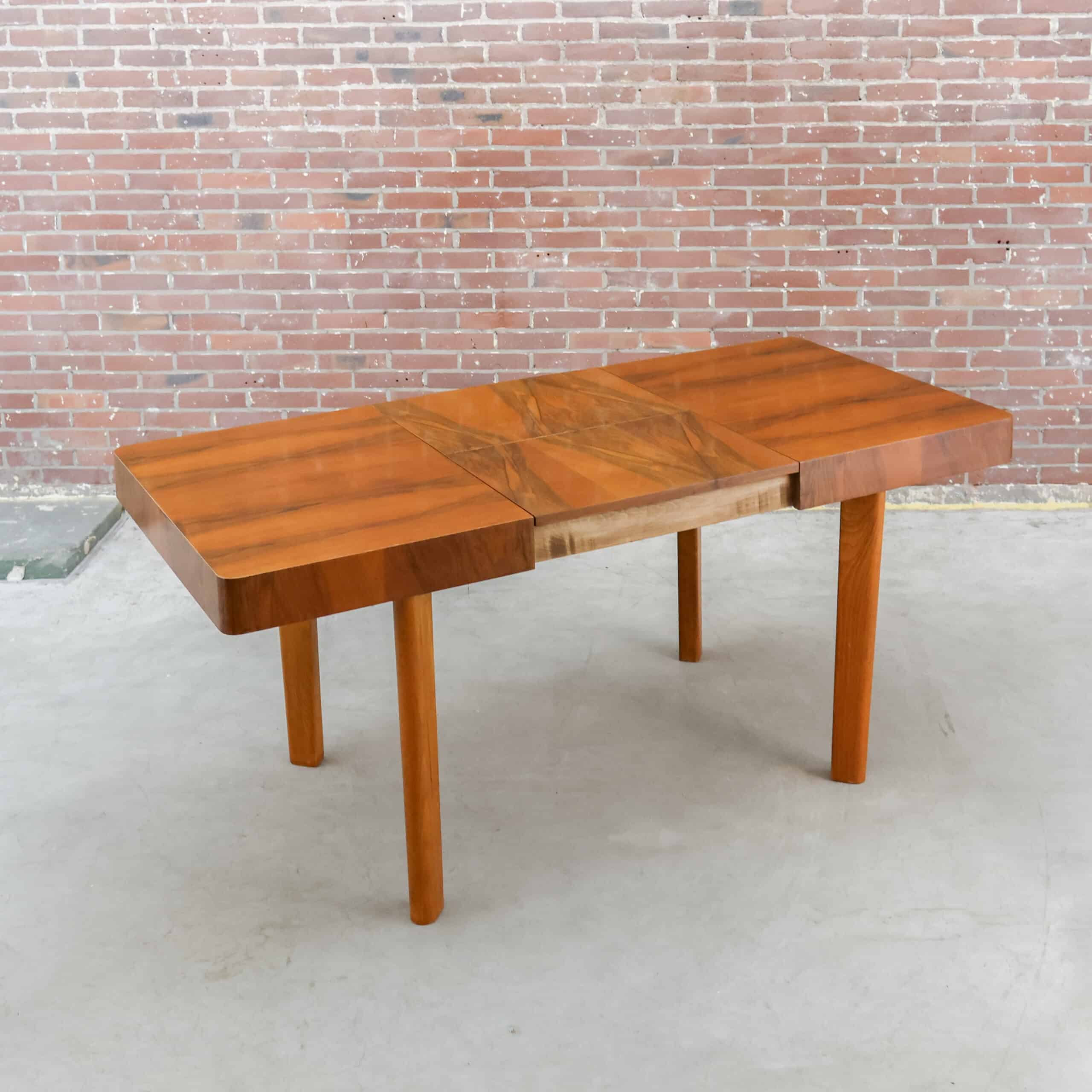Mooie tafel uit Tsjechië, geproduceerd door Tatra in de jaren vijftig. De tafel is uitschuifbaar en heeft een elegant, tijdloos ontwerp. Kenmerkend voor deze modellen is de vaak duidelijk zichtbare vlamtekening in het houtfineer, die ieder stuk een uniek karakter geeft.