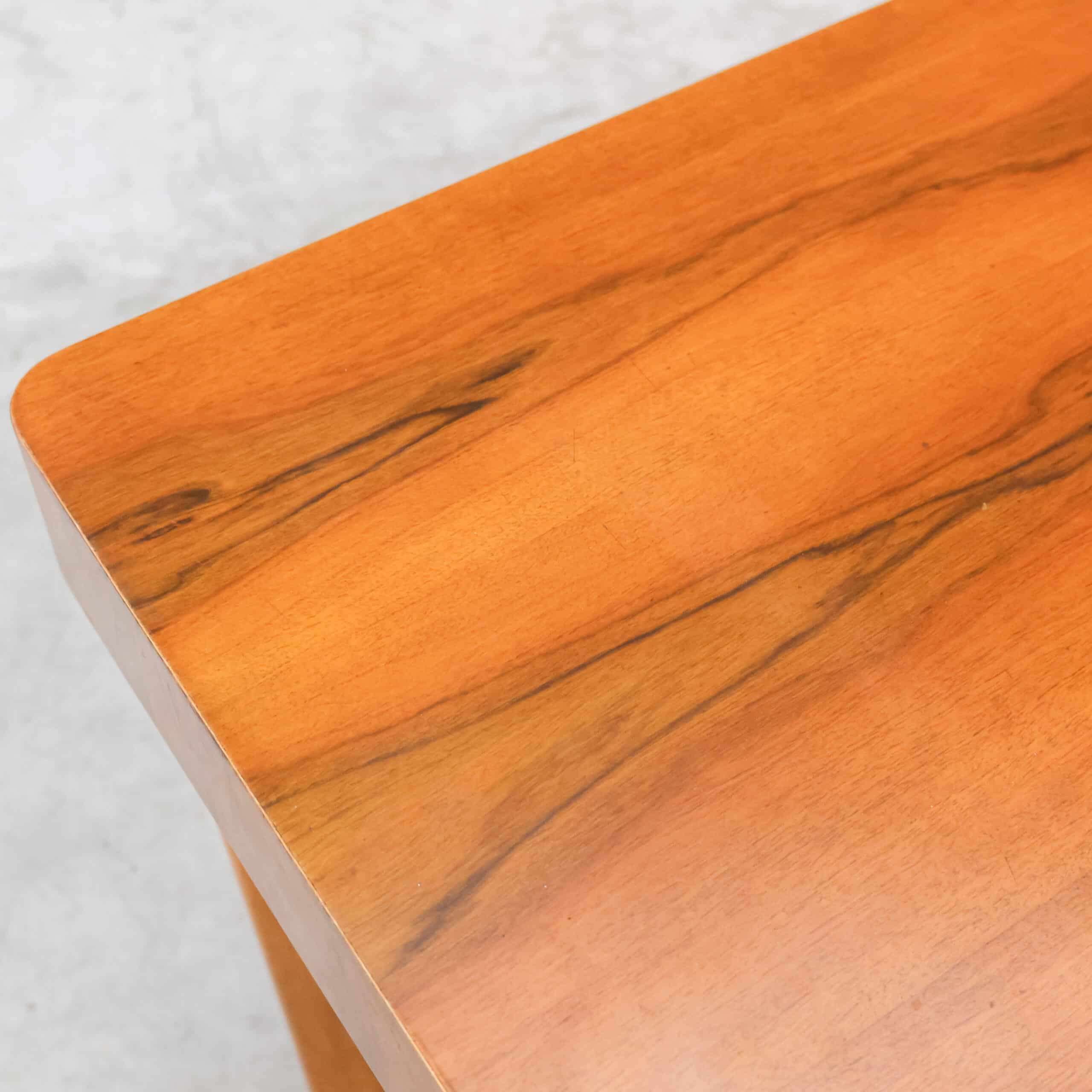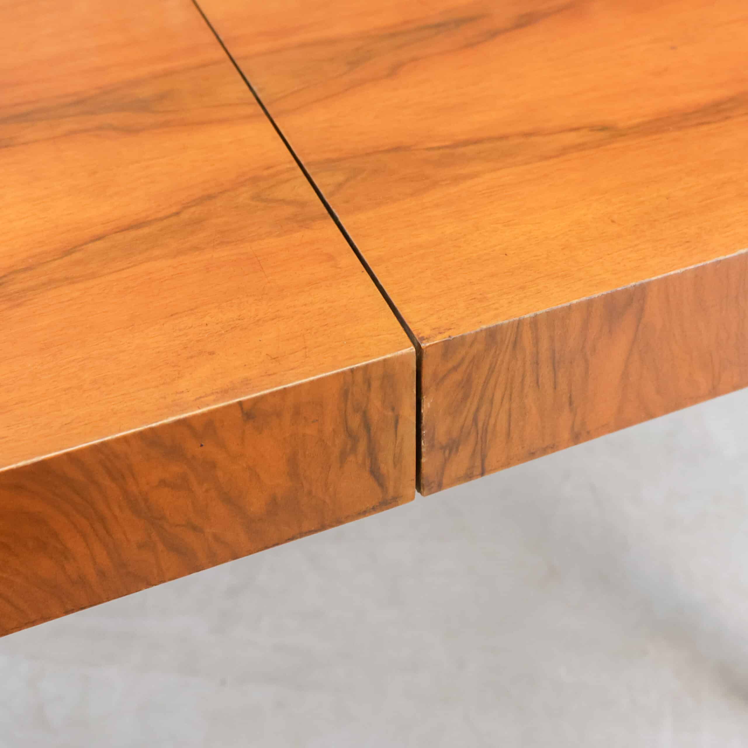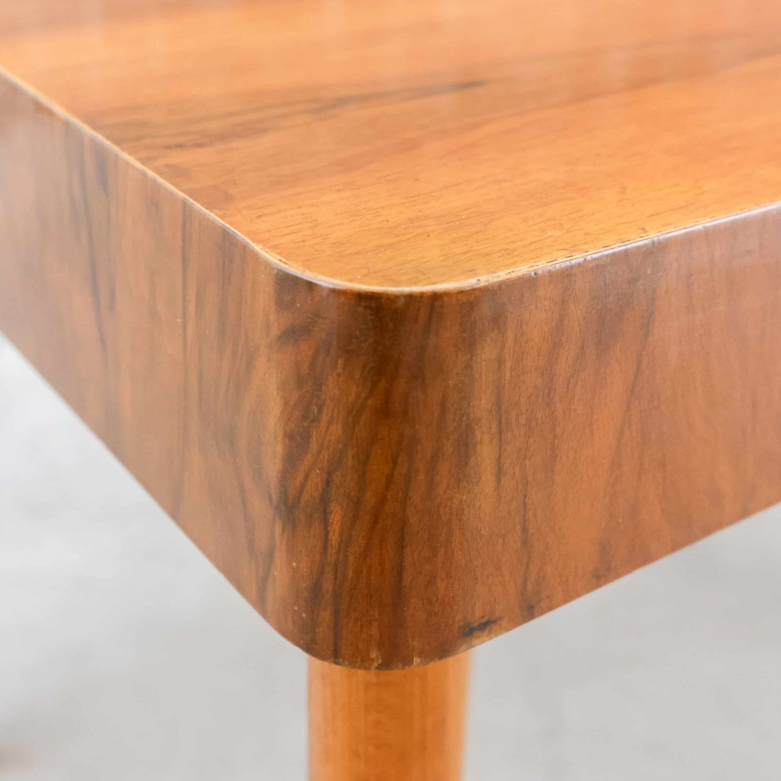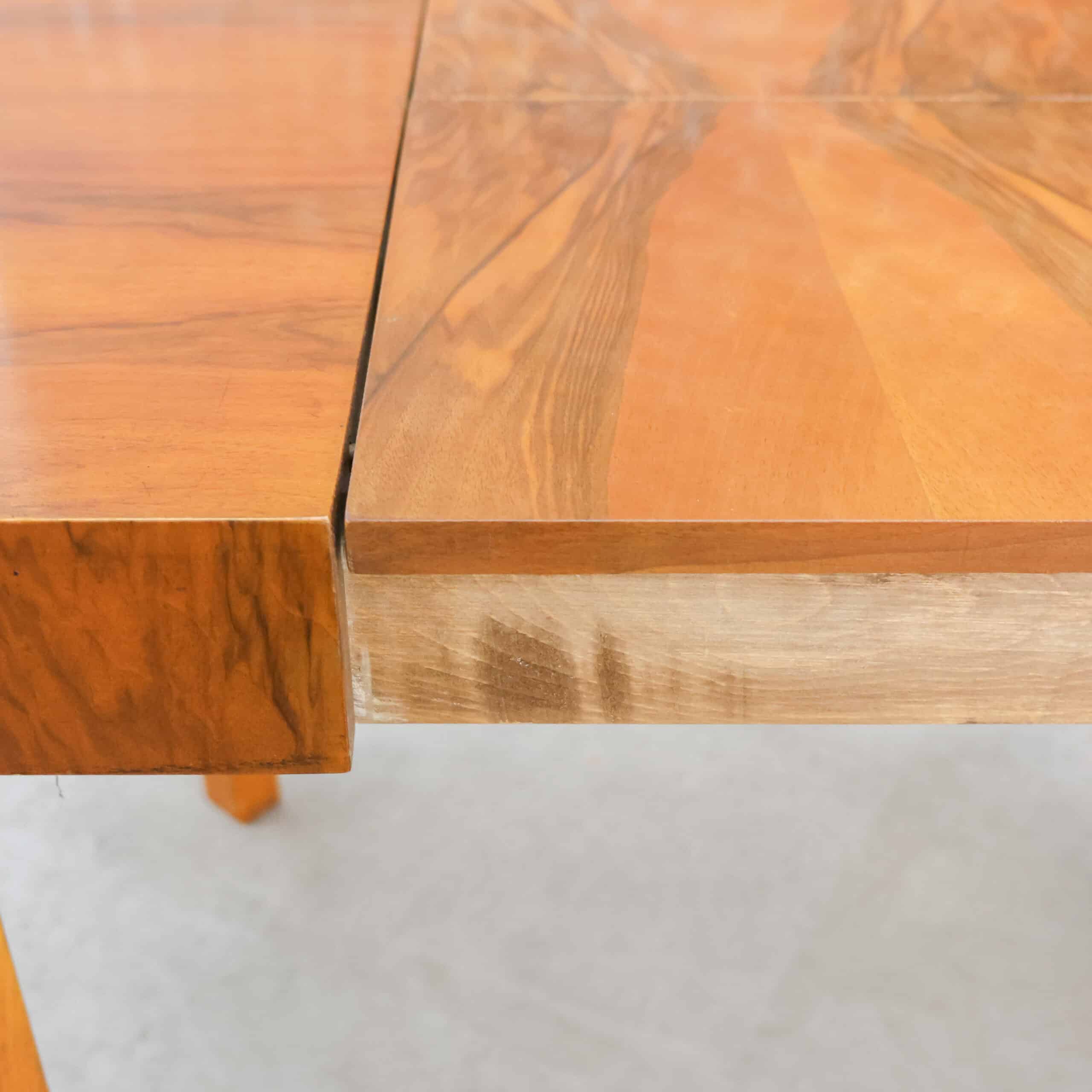 Mooie tafel uit Tsjechië, geproduceerd door Tatra in de jaren vijftig. De tafel is uitschuifbaar en heeft een elegant, tijdloos ontwerp. Kenmerkend voor deze modellen is de vaak duidelijk zichtbare vlamtekening in het houtfineer, die ieder stuk een uniek karakter geeft.