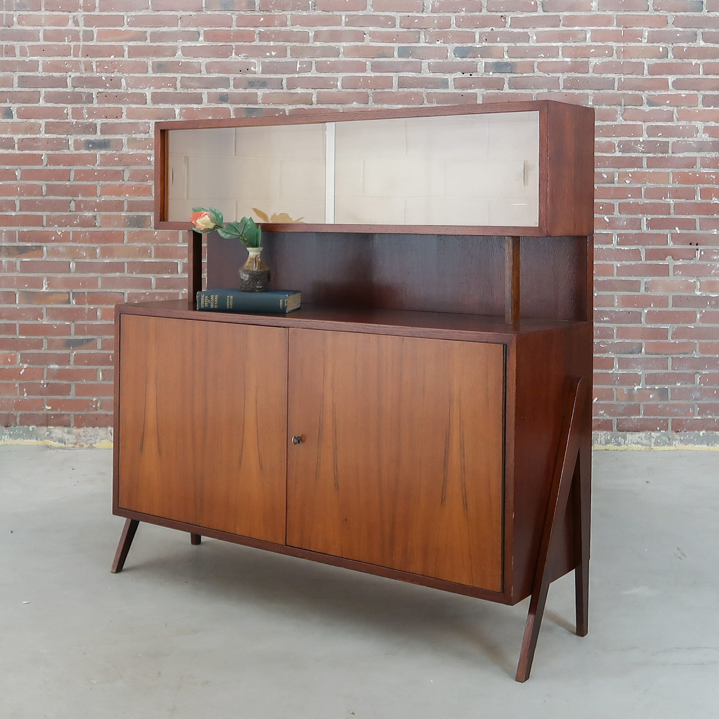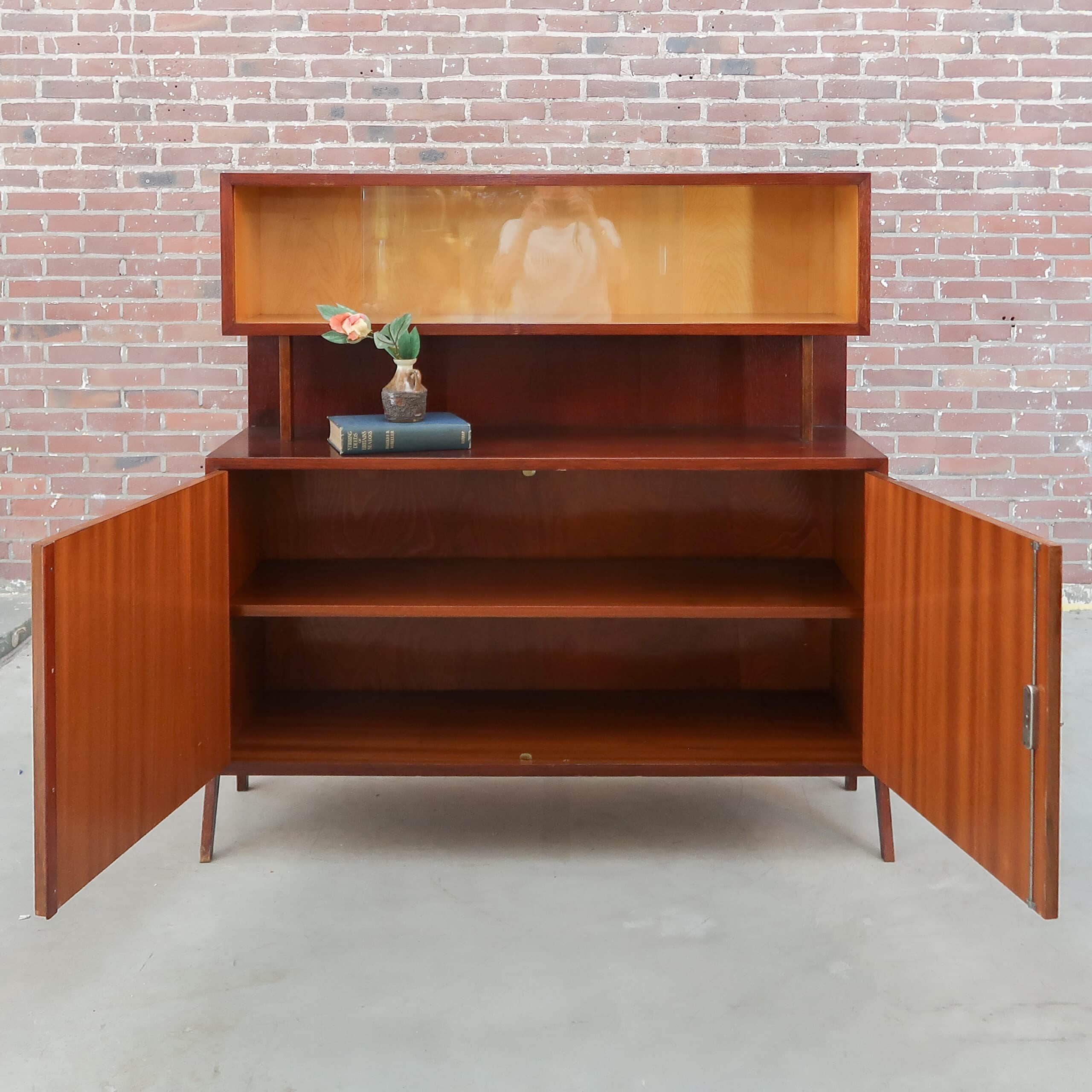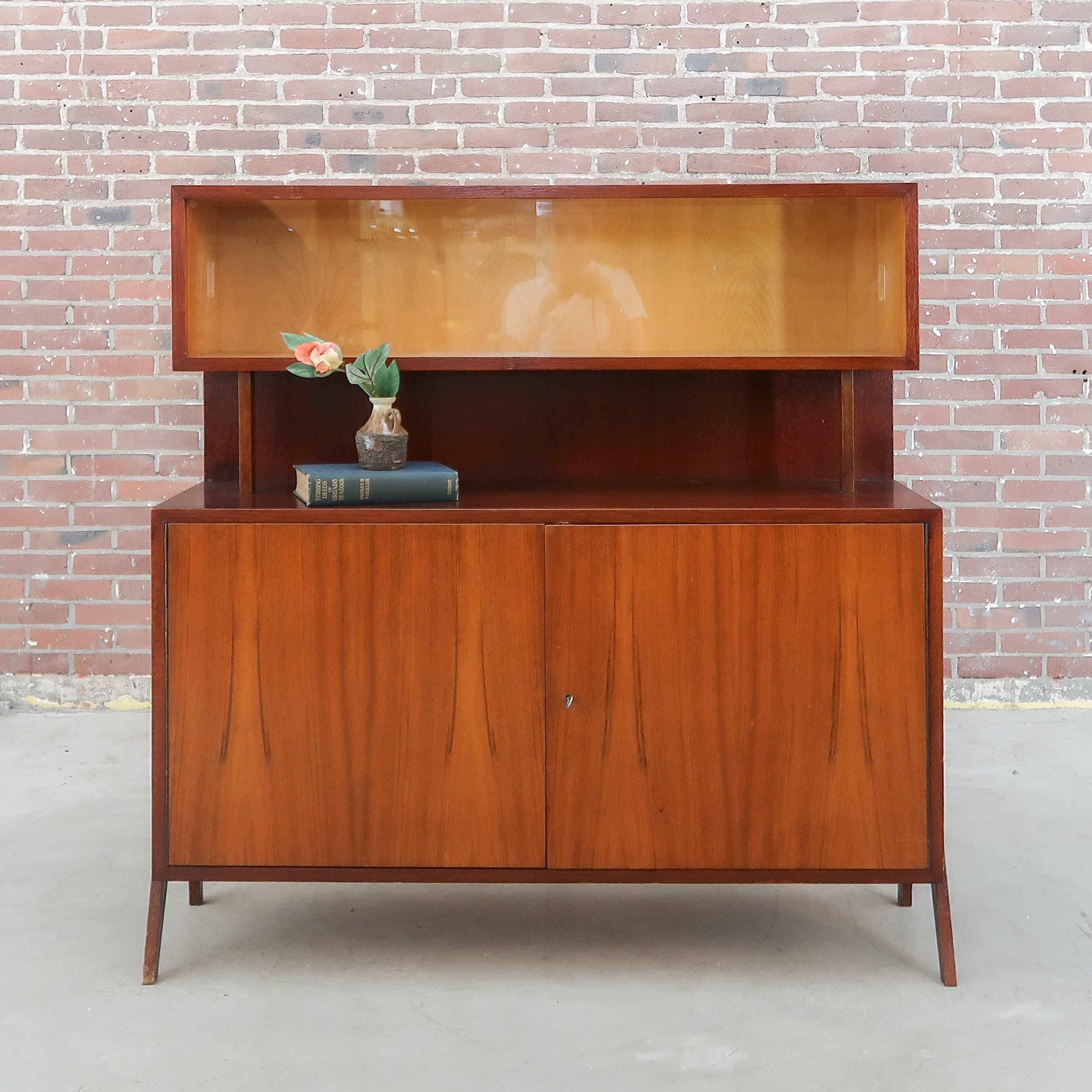 Deze karaktervolle vitrinekast komt uit het voormalige Oostblok en stamt uit de jaren 60. De strakke vormgeving, slanke pootjes en warme houttonen geven ‘m die typische mid-century modern uitstraling. Het open bovenvak is perfect voor je mooiste objecten of servies, terwijl het ondergedeelte met deuren volop opbergruimte biedt.