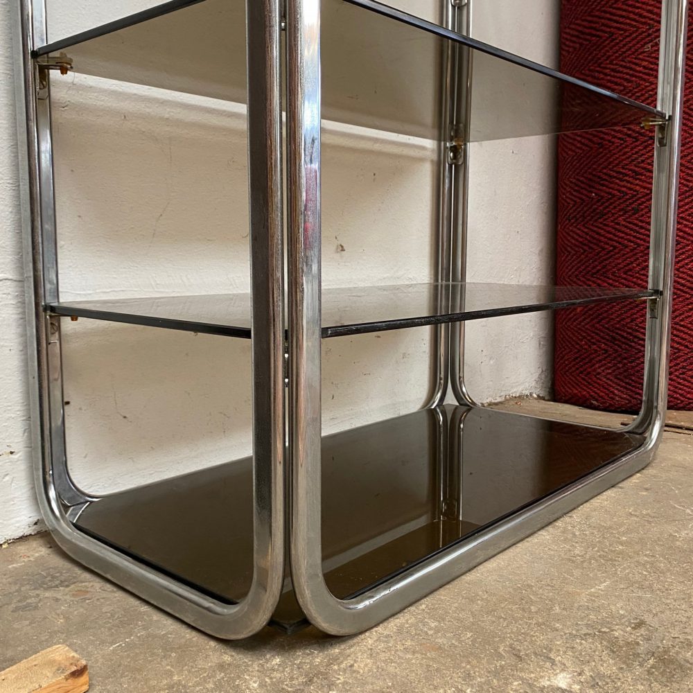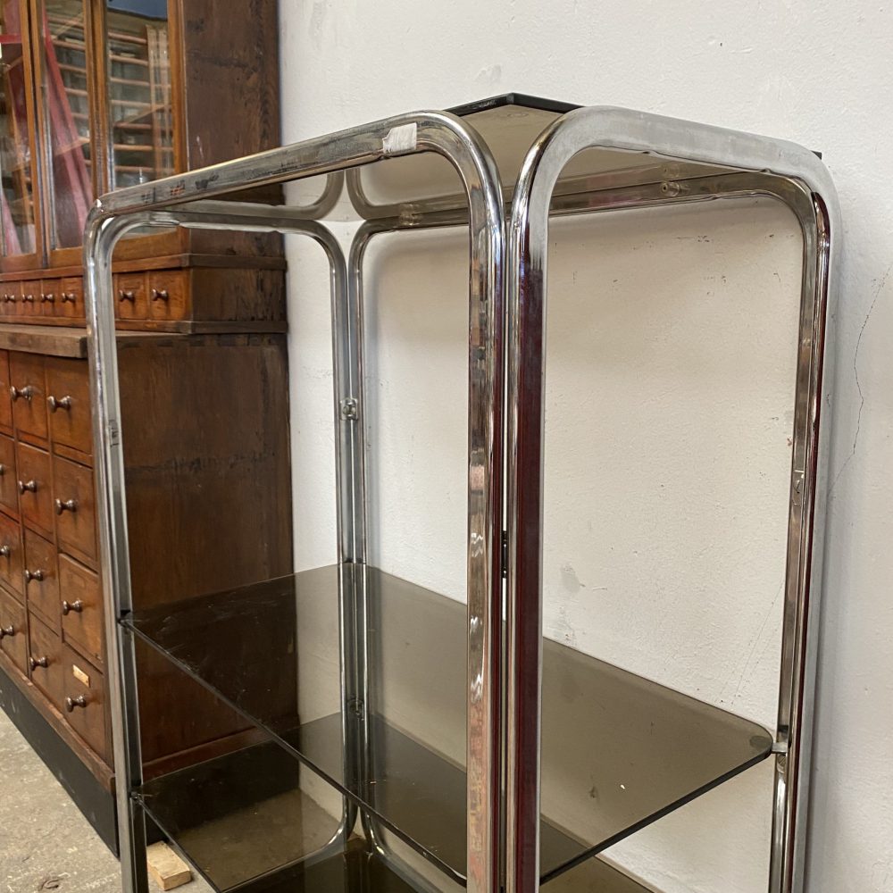 Dit vintage kastje is gemaakt van metaal in een leuke retro vorm. De kast heeft vier glazen planken. Het glas is donker getint.