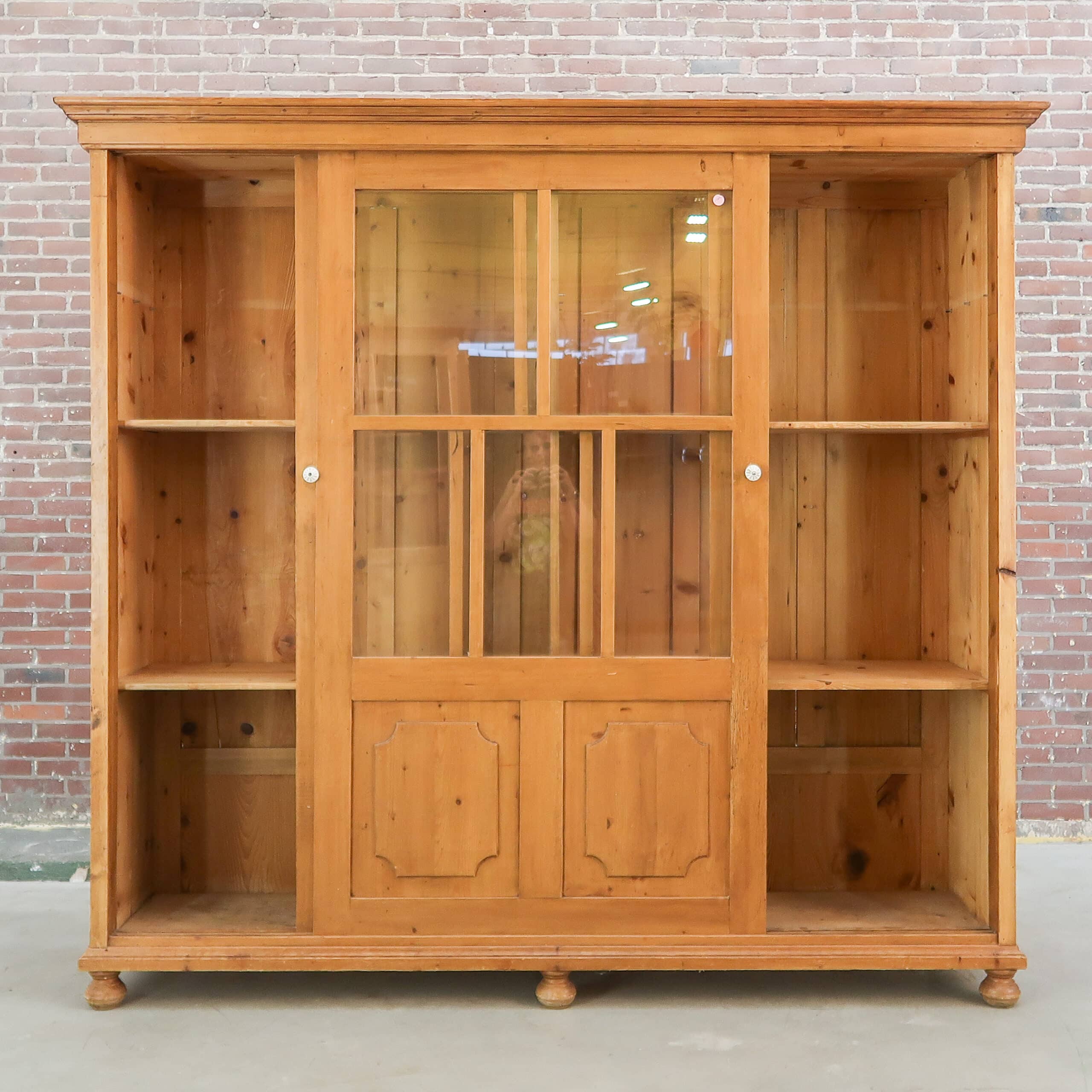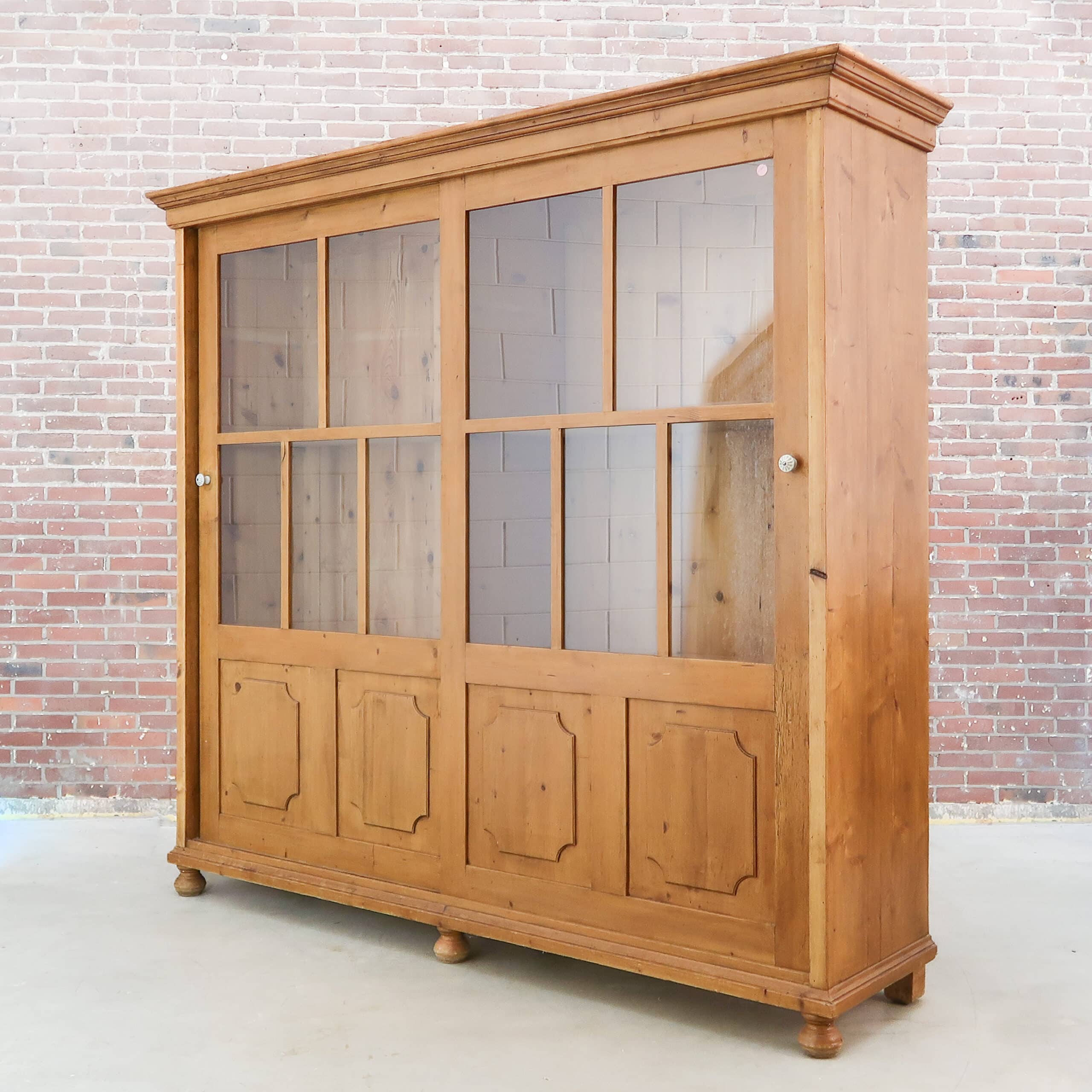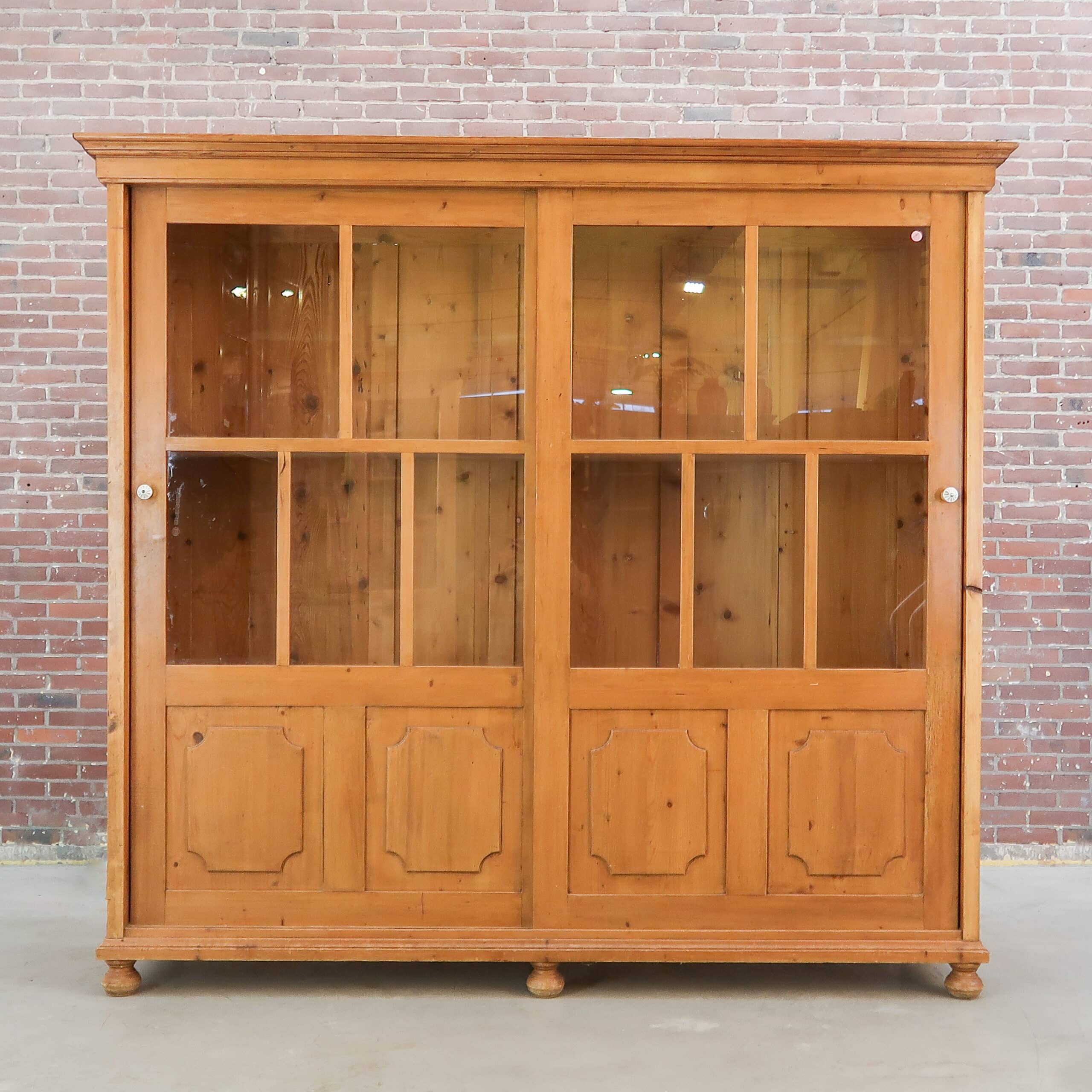 Prachtige grote vitrinekast van massief hout, met een warme doorleefde uitstraling en originele details. De kast heeft royale glazen schuifdeuren bovenin en fraai geprofileerde panelen onderin, perfect voor zowel display als opbergruimte. Het authentieke houtwerk toont mooie gebruikssporen die de kast karakter en charme geven. Een uniek, tijdloos meubel dat elke ruimte meteen sfeer en warmte geeft.