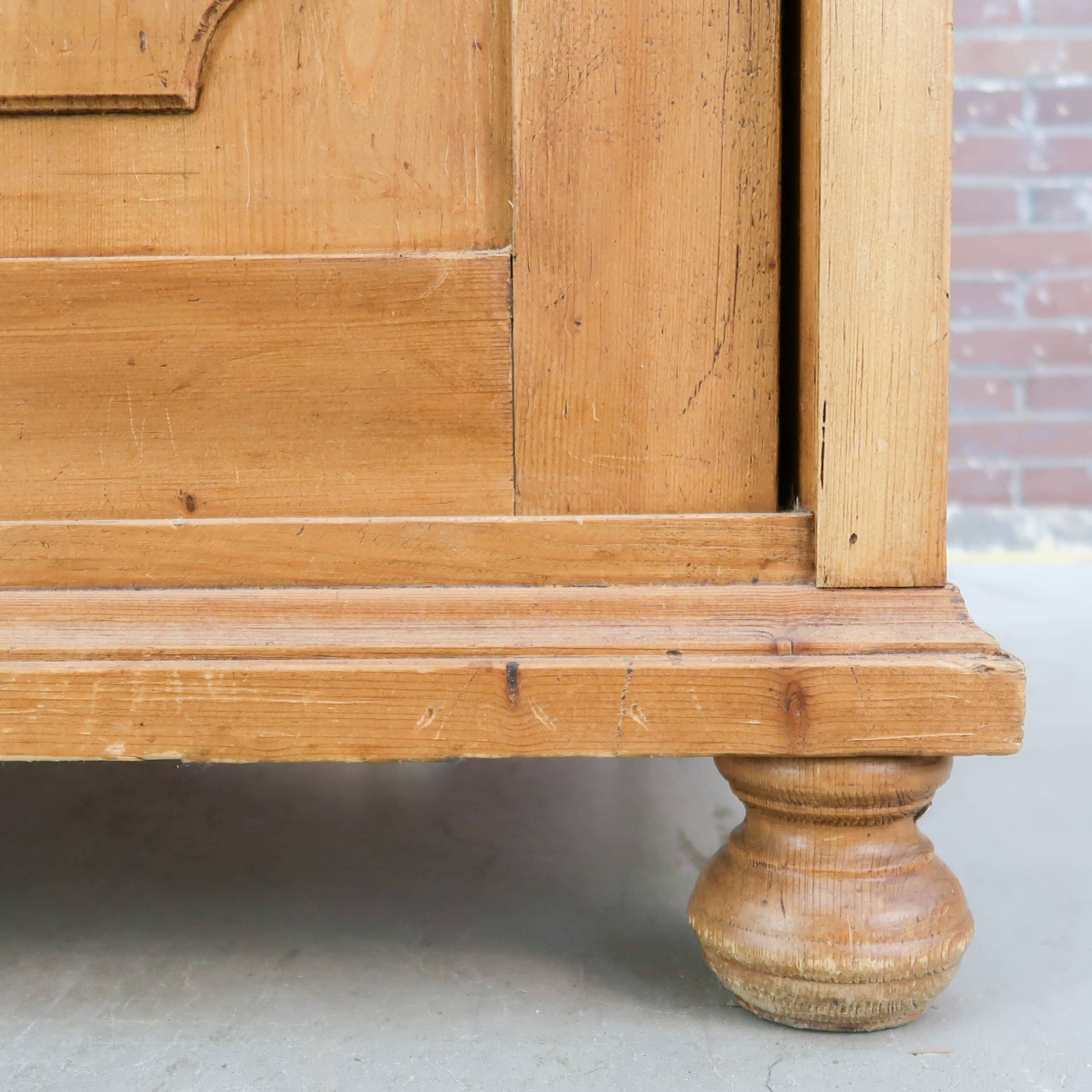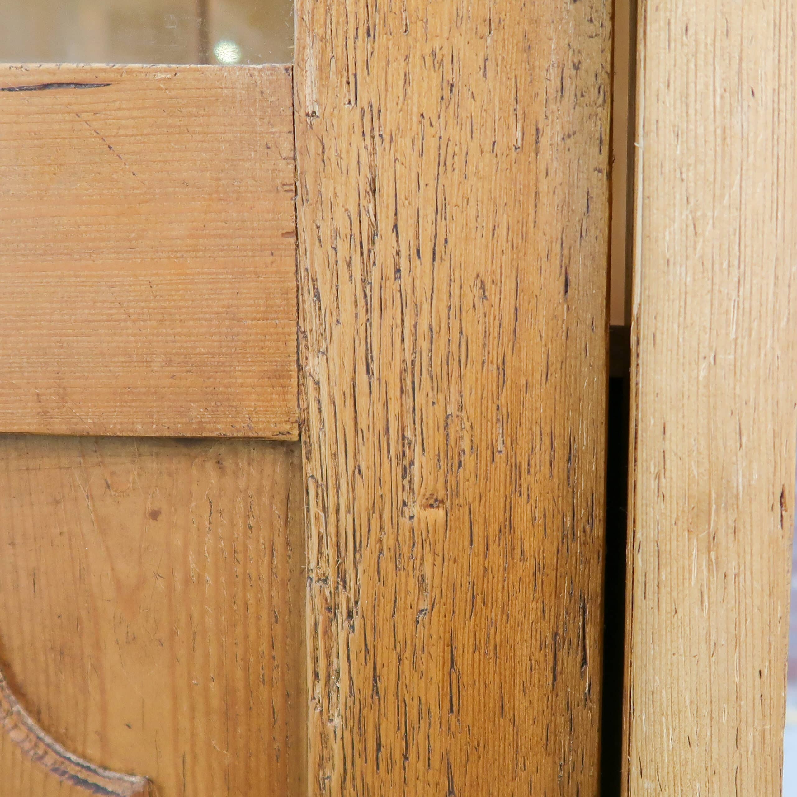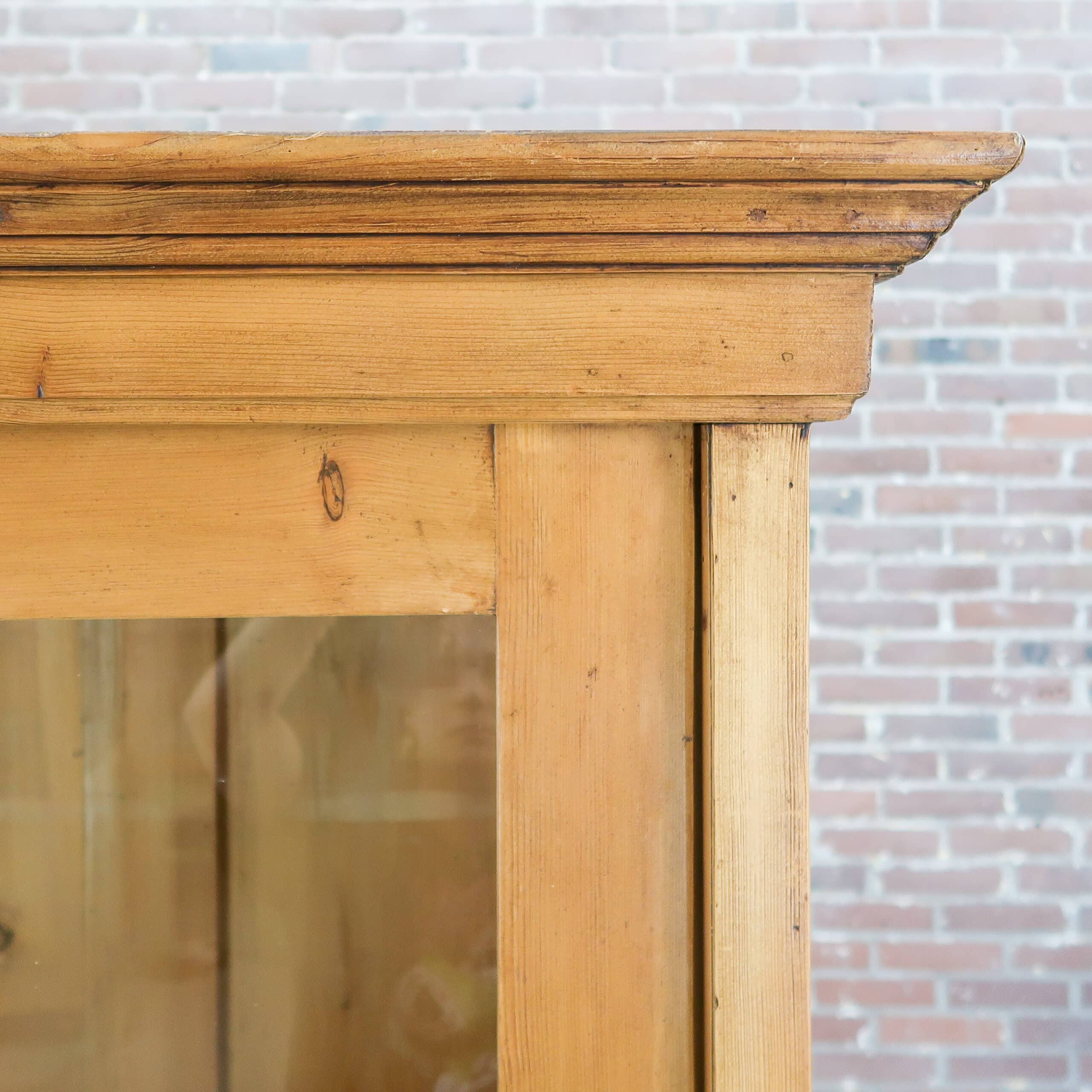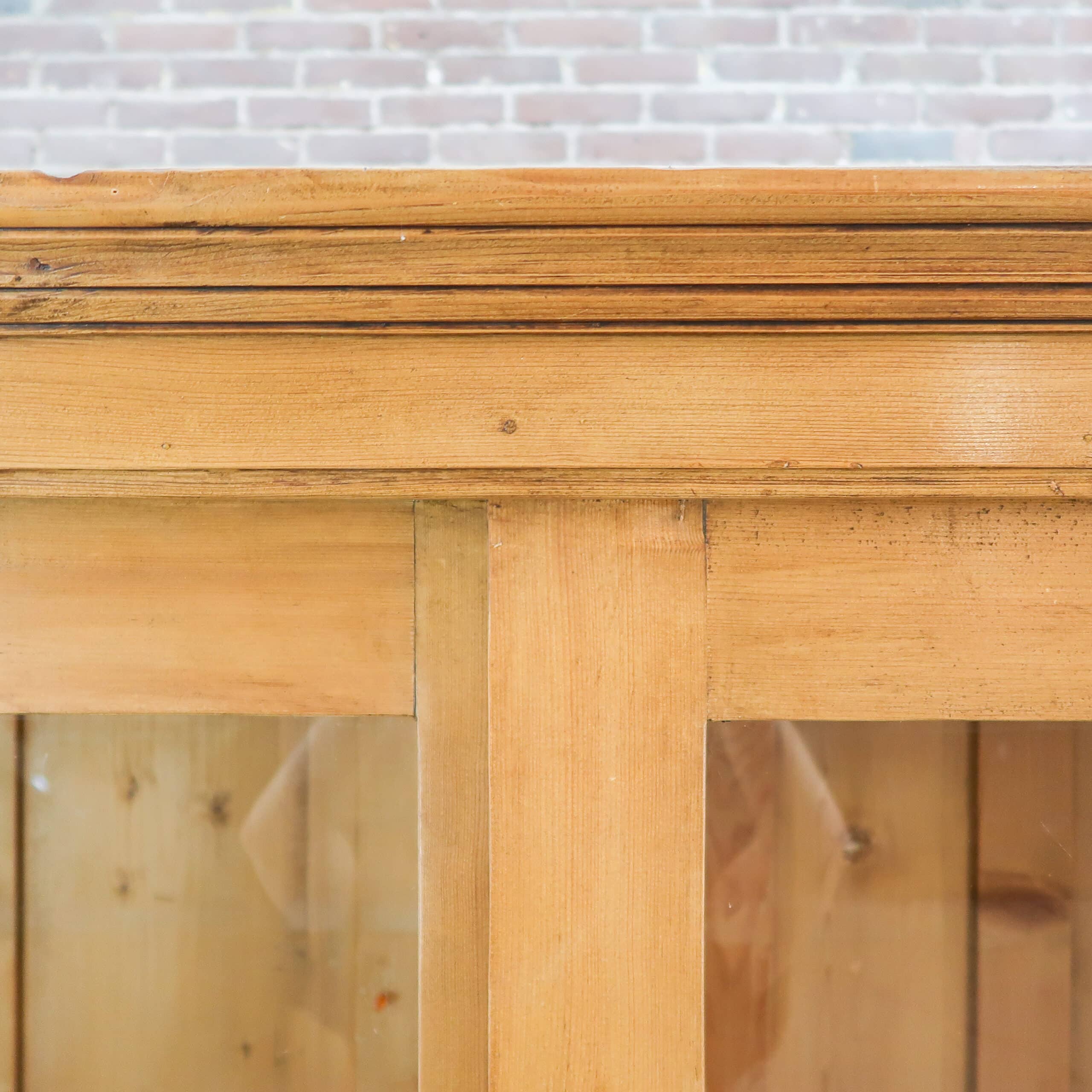 Prachtige grote vitrinekast van massief hout, met een warme doorleefde uitstraling en originele details. De kast heeft royale glazen schuifdeuren bovenin en fraai geprofileerde panelen onderin, perfect voor zowel display als opbergruimte. Het authentieke houtwerk toont mooie gebruikssporen die de kast karakter en charme geven. Een uniek, tijdloos meubel dat elke ruimte meteen sfeer en warmte geeft.