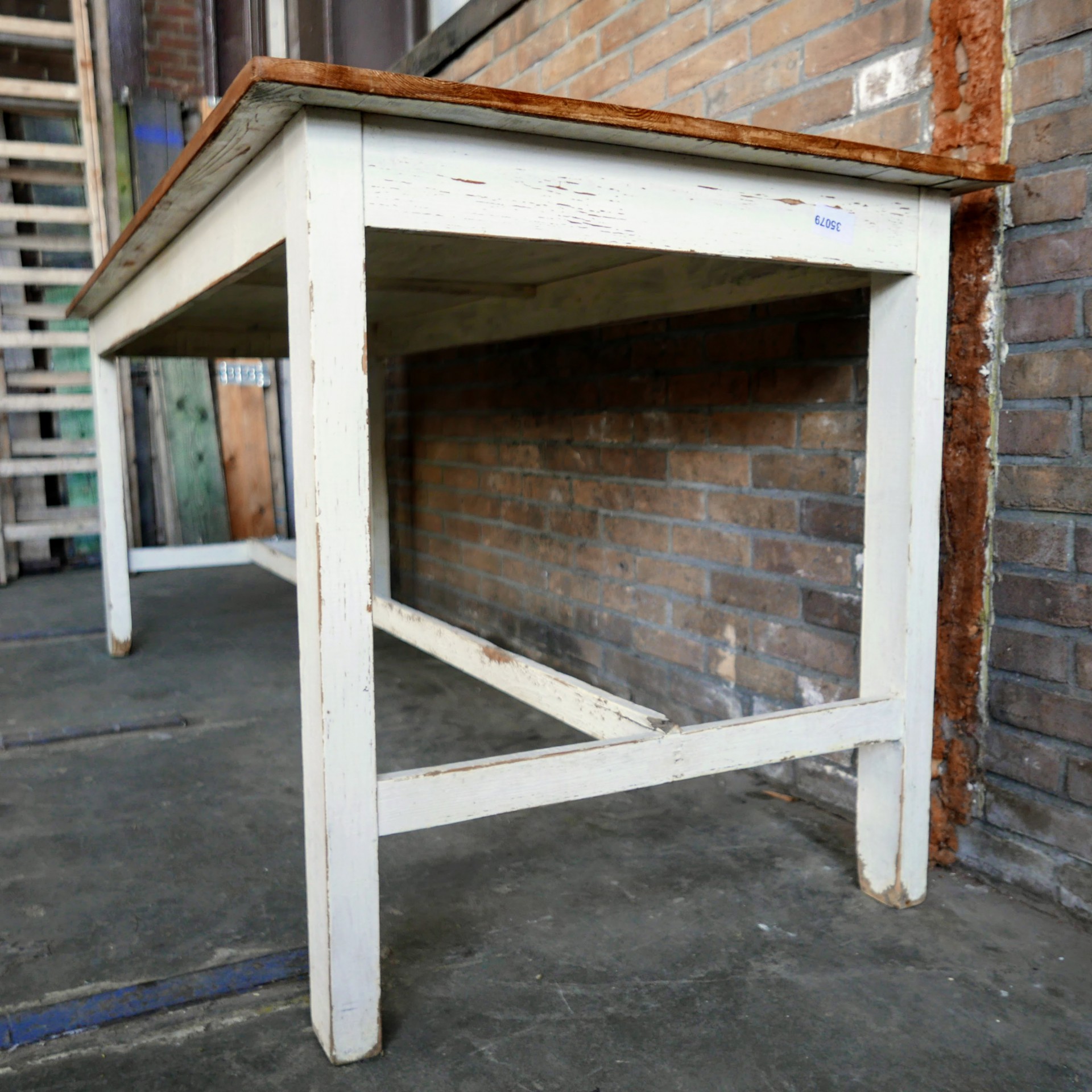 Brocante witte eettafel met houten bovenblad.