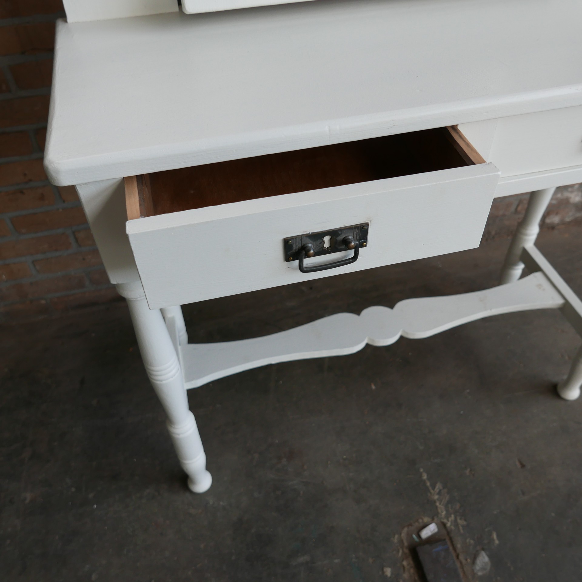 Prachtige houten kaptafel is speciaal gemaakt voor deze mooie spiegel. De kaptafel bestaat uit één stuk, de spiegel kan 360 graden om zijn as draaien. De tafel heeft twee lades onder de spiegel.