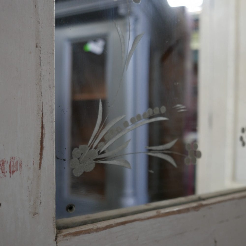 Een brocante kast gemaakt van hout. De kast is wit geschilderd en heeft een iets verweerde spiegel op de deur. De spiegel heeft onderin bloemen erin gegrafeerd. De deur, die je af kunt sluiten met een slot, opent naar rechts en heeft binnenin één plank met daaronder zijn originele kapstok roede.