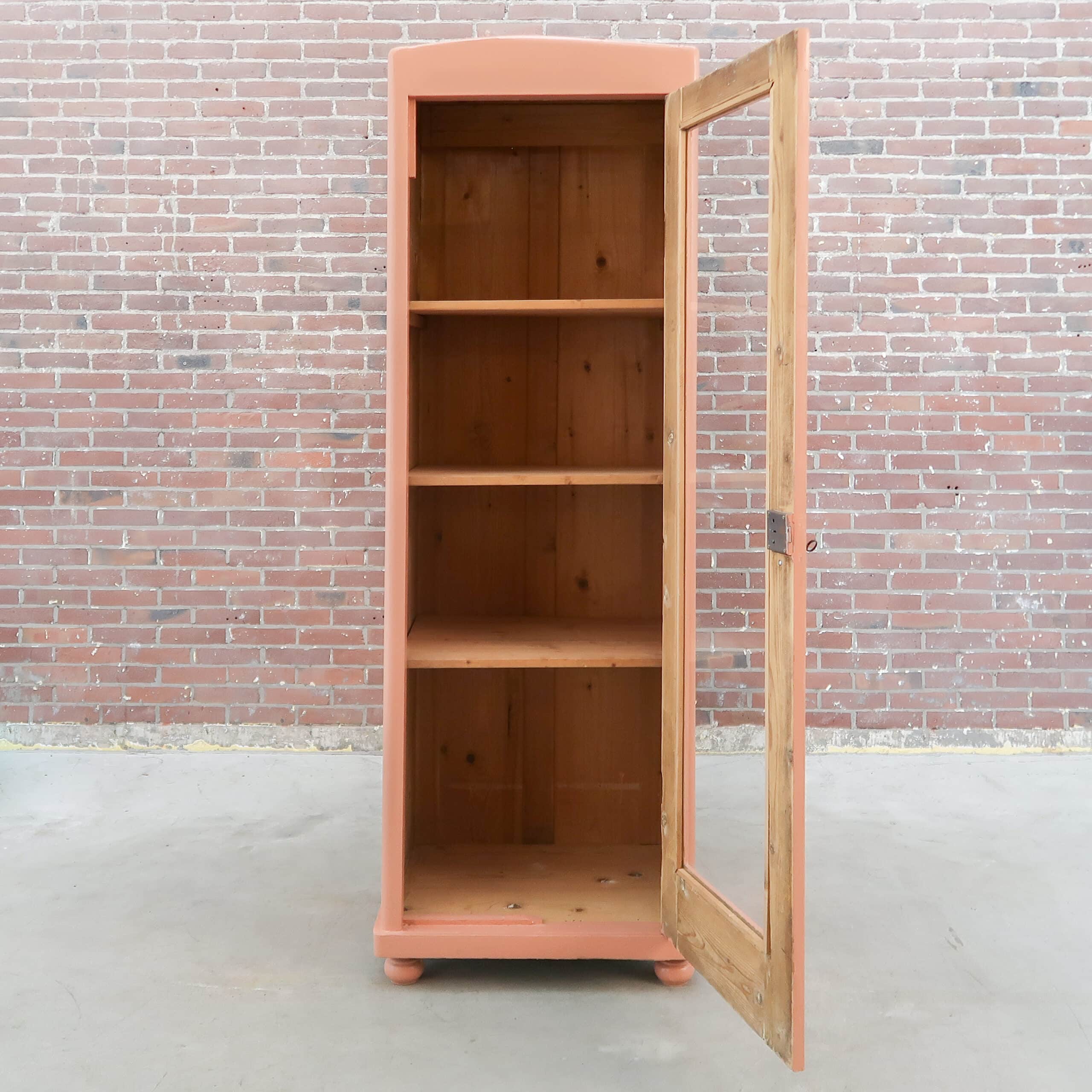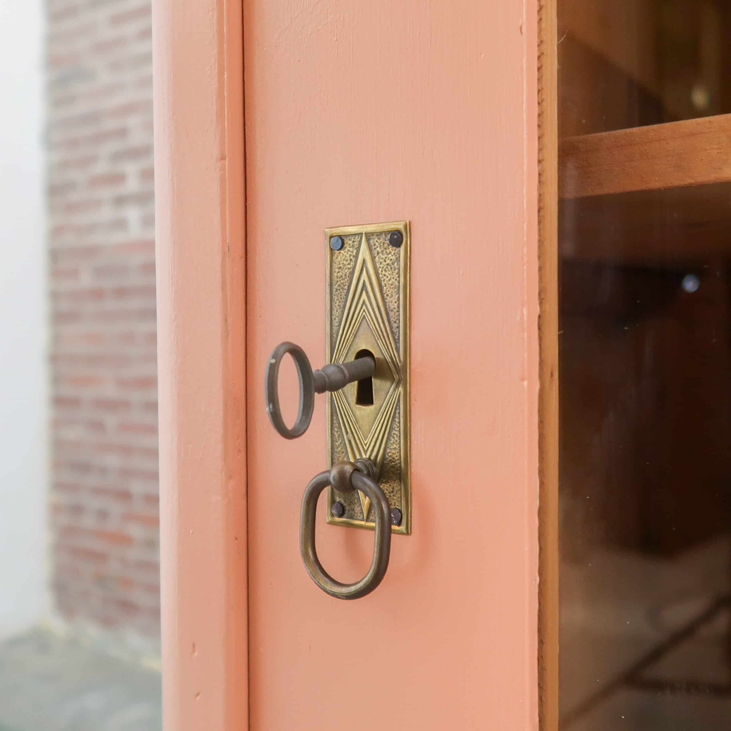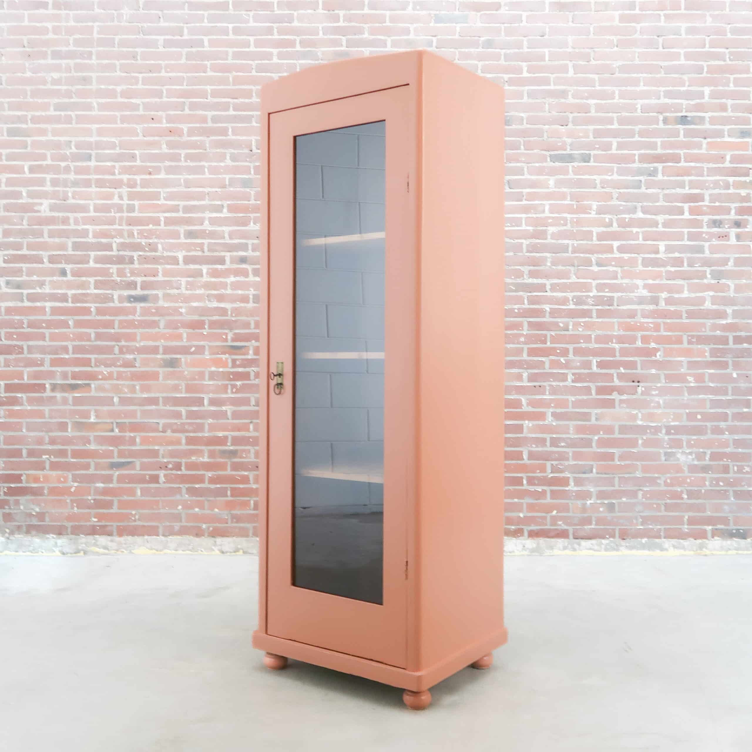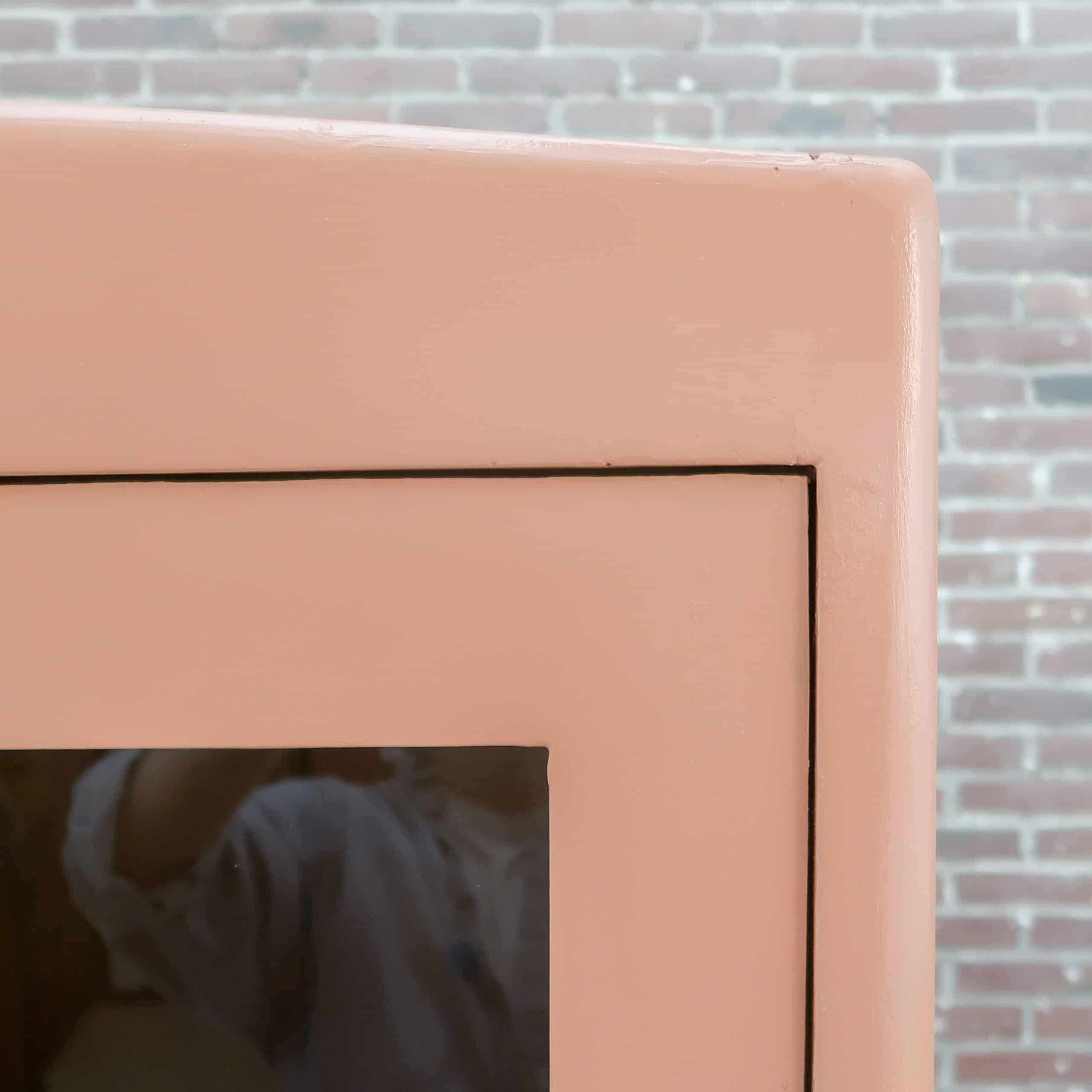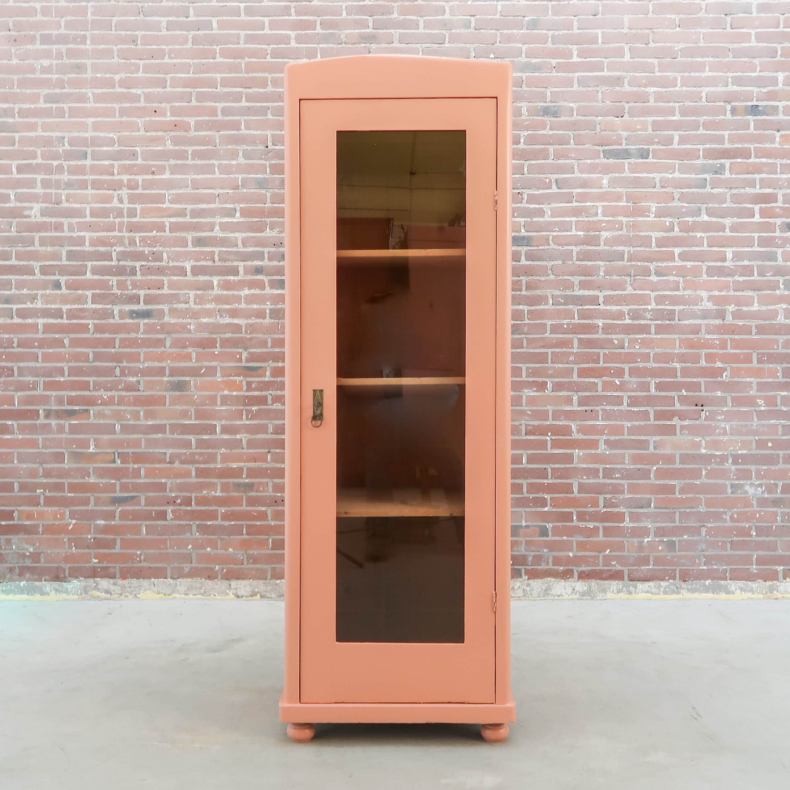 Mooie zacht roze vitrinekast uit Hongarije! We hebben dit brocante exemplaar opgeknapt waar nodig met oa nieuwe ruiten, planken en een frisse kleur. Een heerlijke kast die klaar is voor een tweede leven 🙂