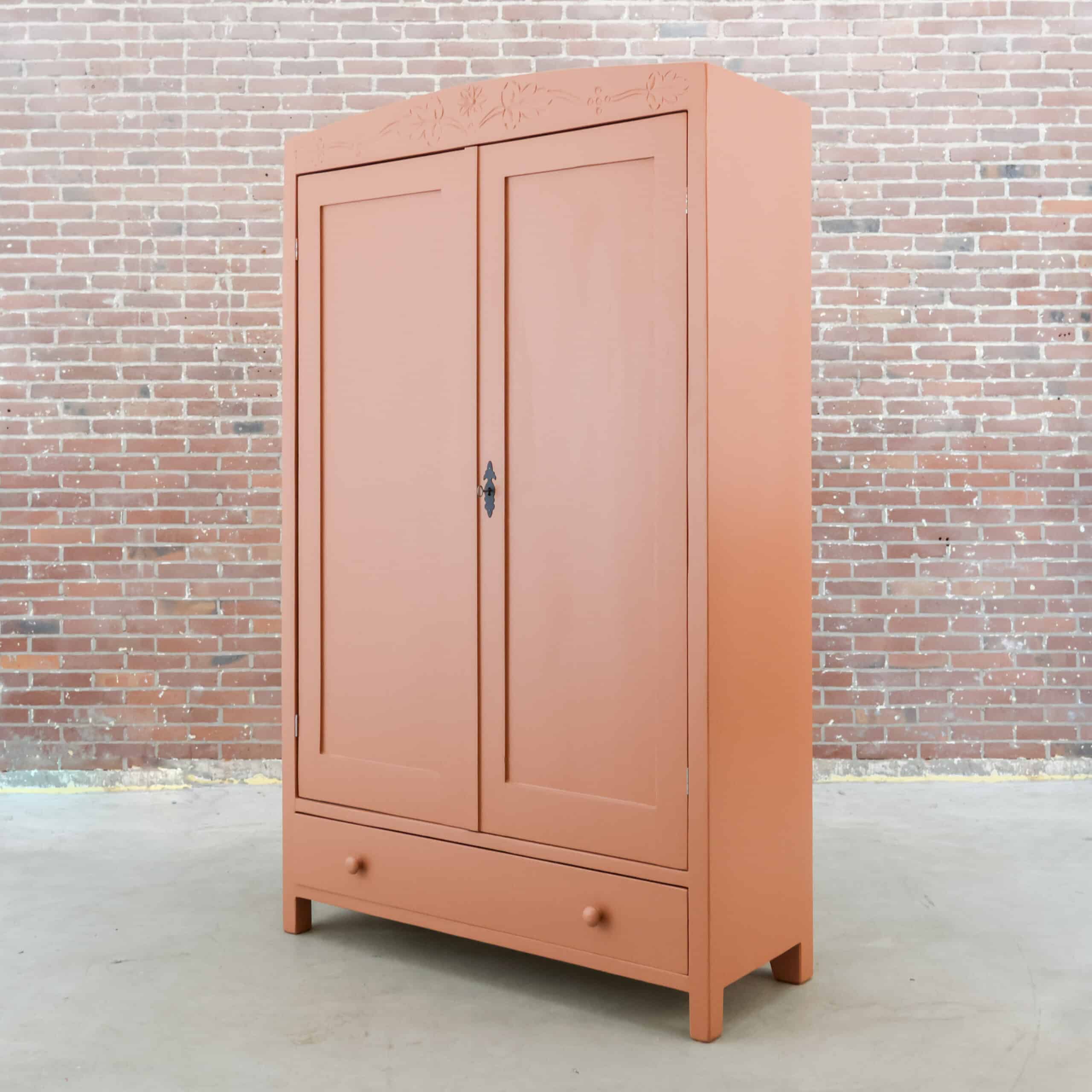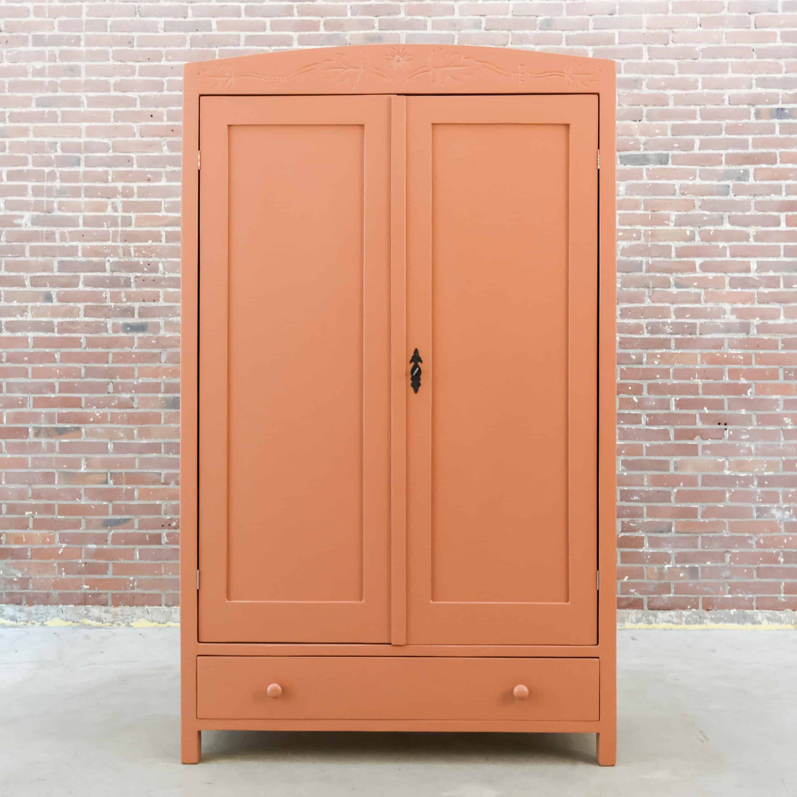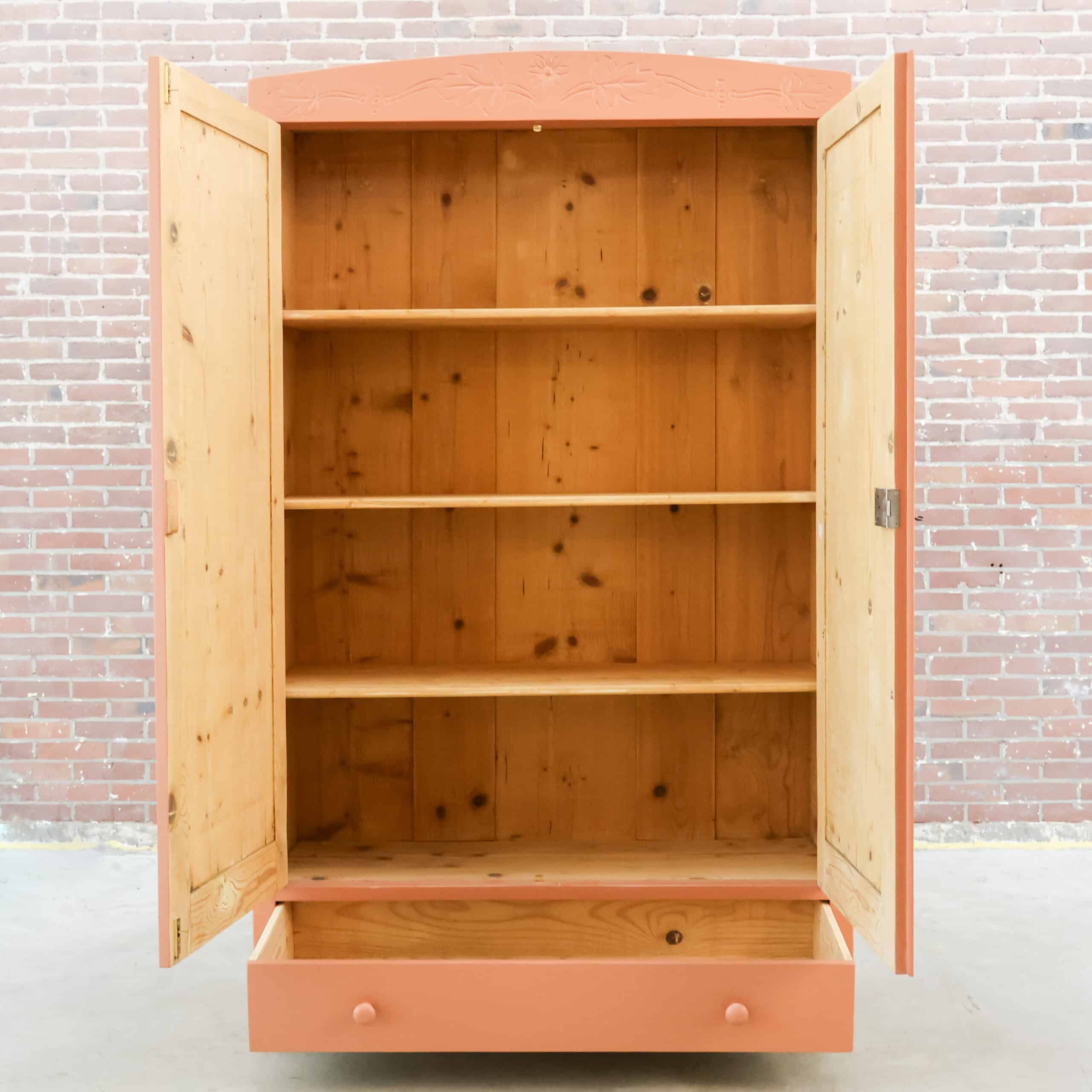Deze brocante zalmroze linnenkast hebben we opgespeurd en opgeknapt in Hongarije. Zo hebben we haar oa nieuwe planken en een fleurig kleurtje gegeven! Klaar voor een tweede leven.